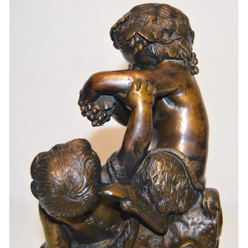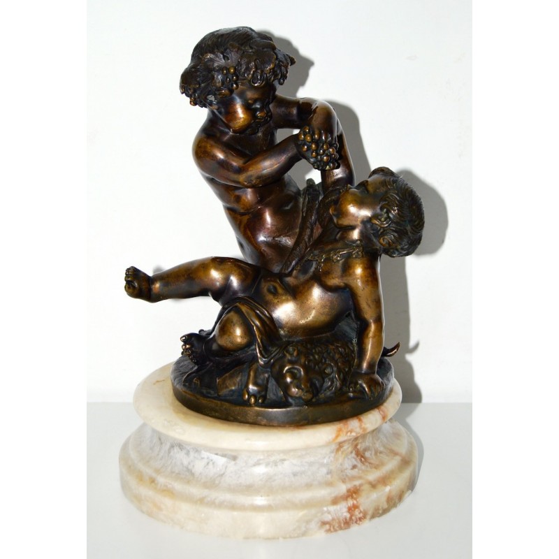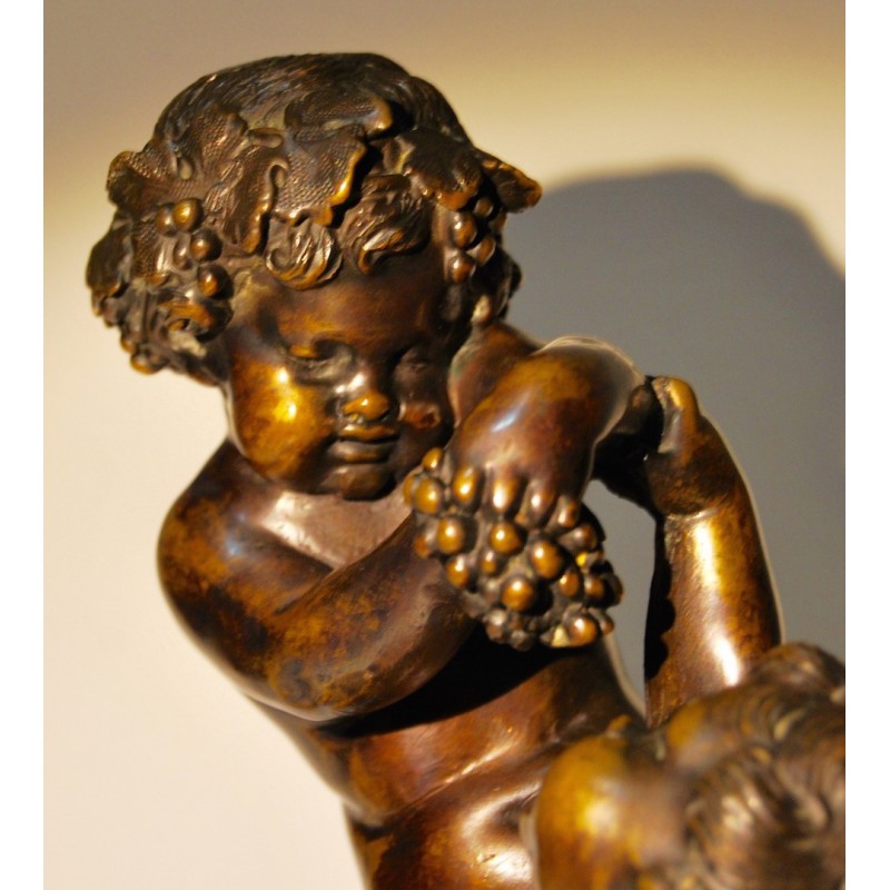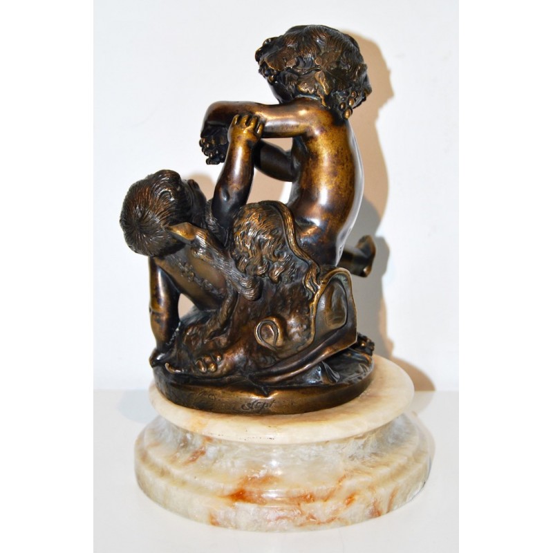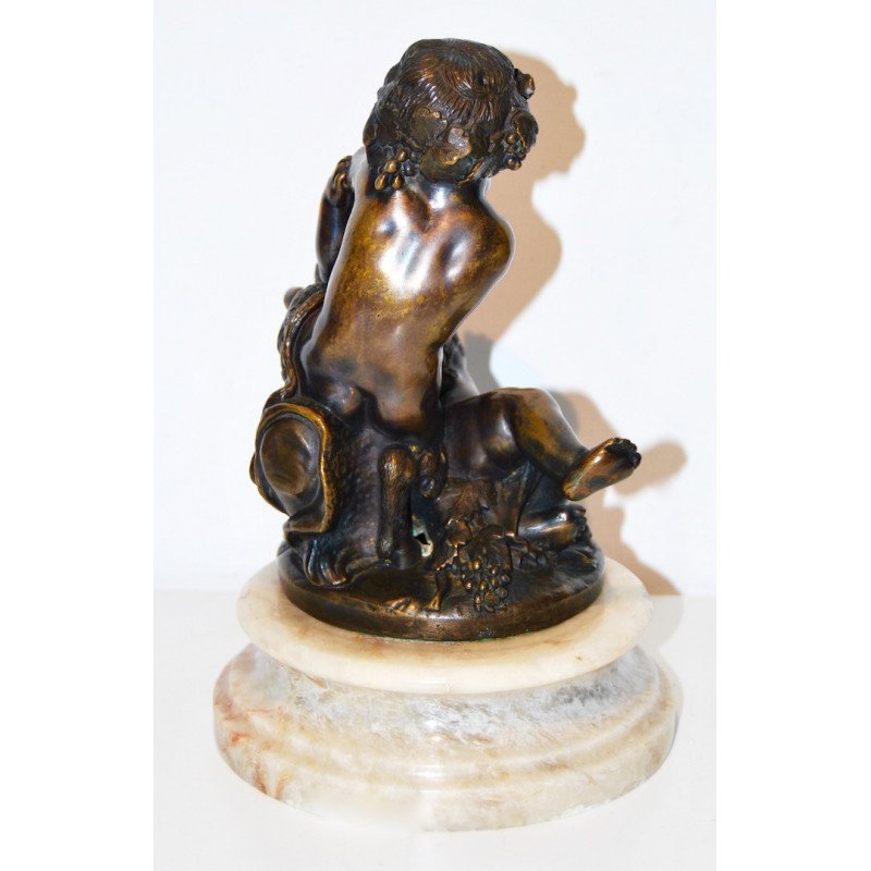 Baco con satiro, antiguo bronce francés de finales del siglo XIX, firmado Clodion scpt. en la base circular del bronce (realizado después la muerte del escultor), peana de mármol con vetas de color naranja, buena calidad y estado de conservación.