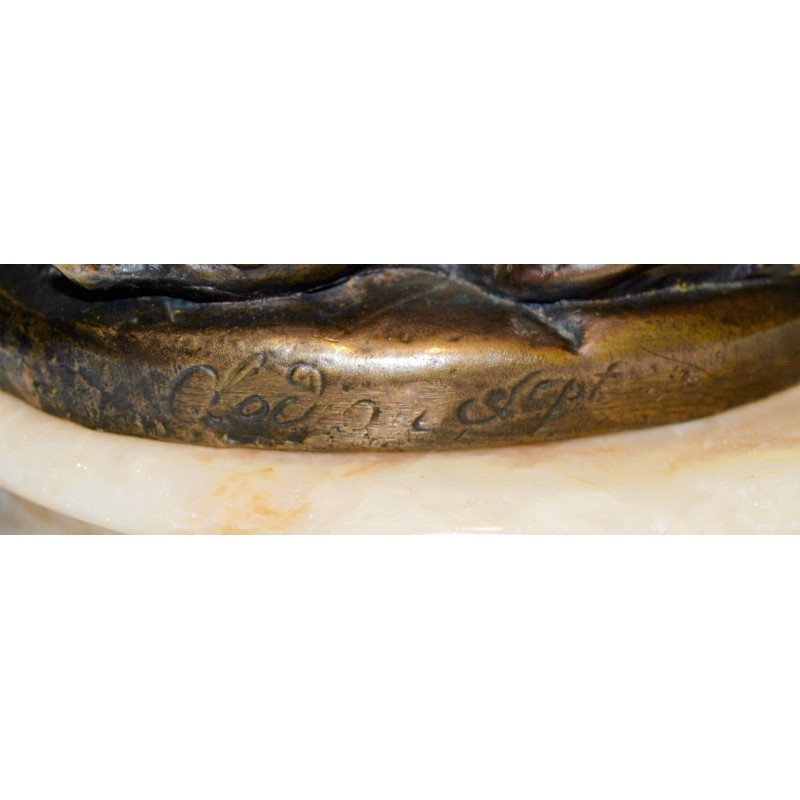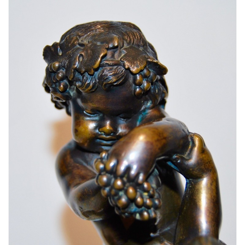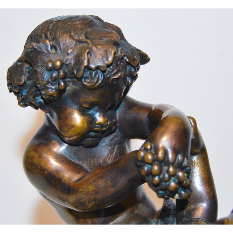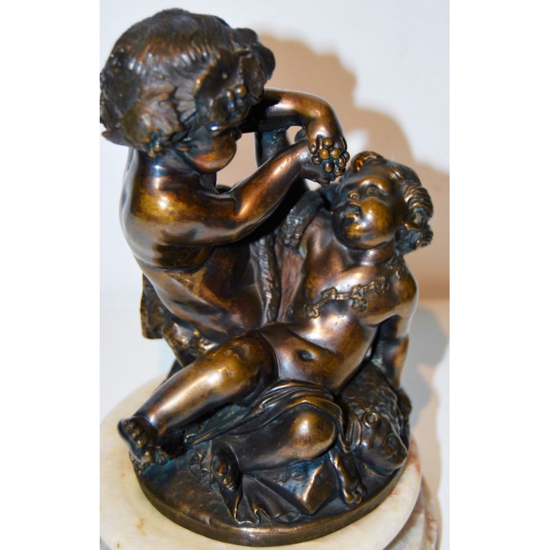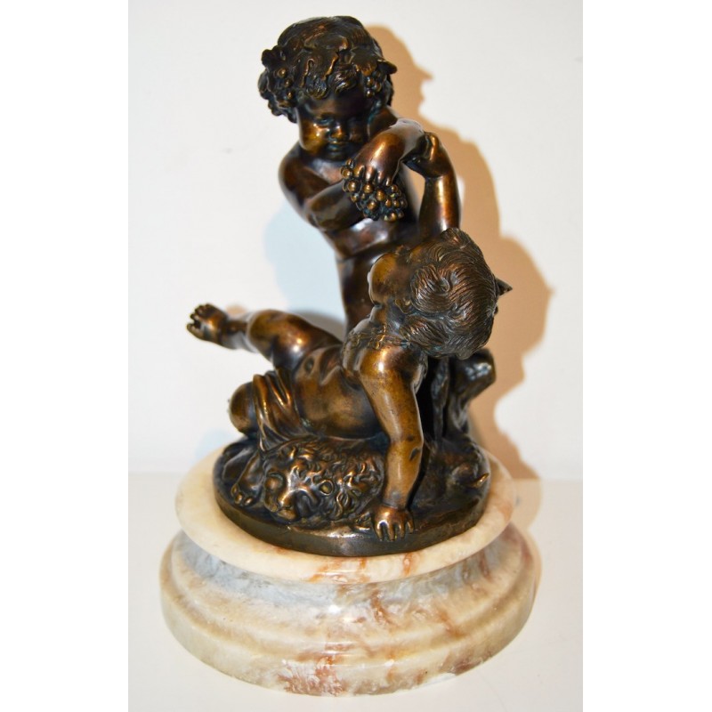Baco con satiro, antiguo bronce francés de finales del siglo XIX, firmado Clodion scpt. en la base circular del bronce (realizado después la muerte del escultor), peana de mármol con vetas de color naranja, buena calidad y estado de conservación.