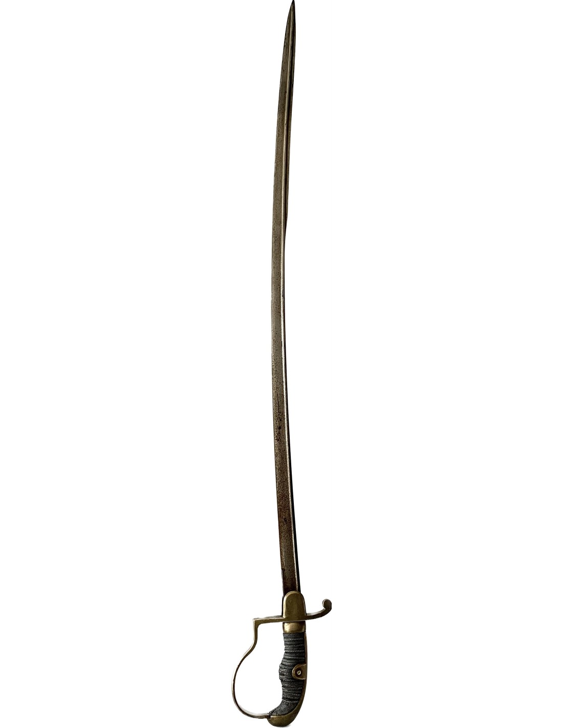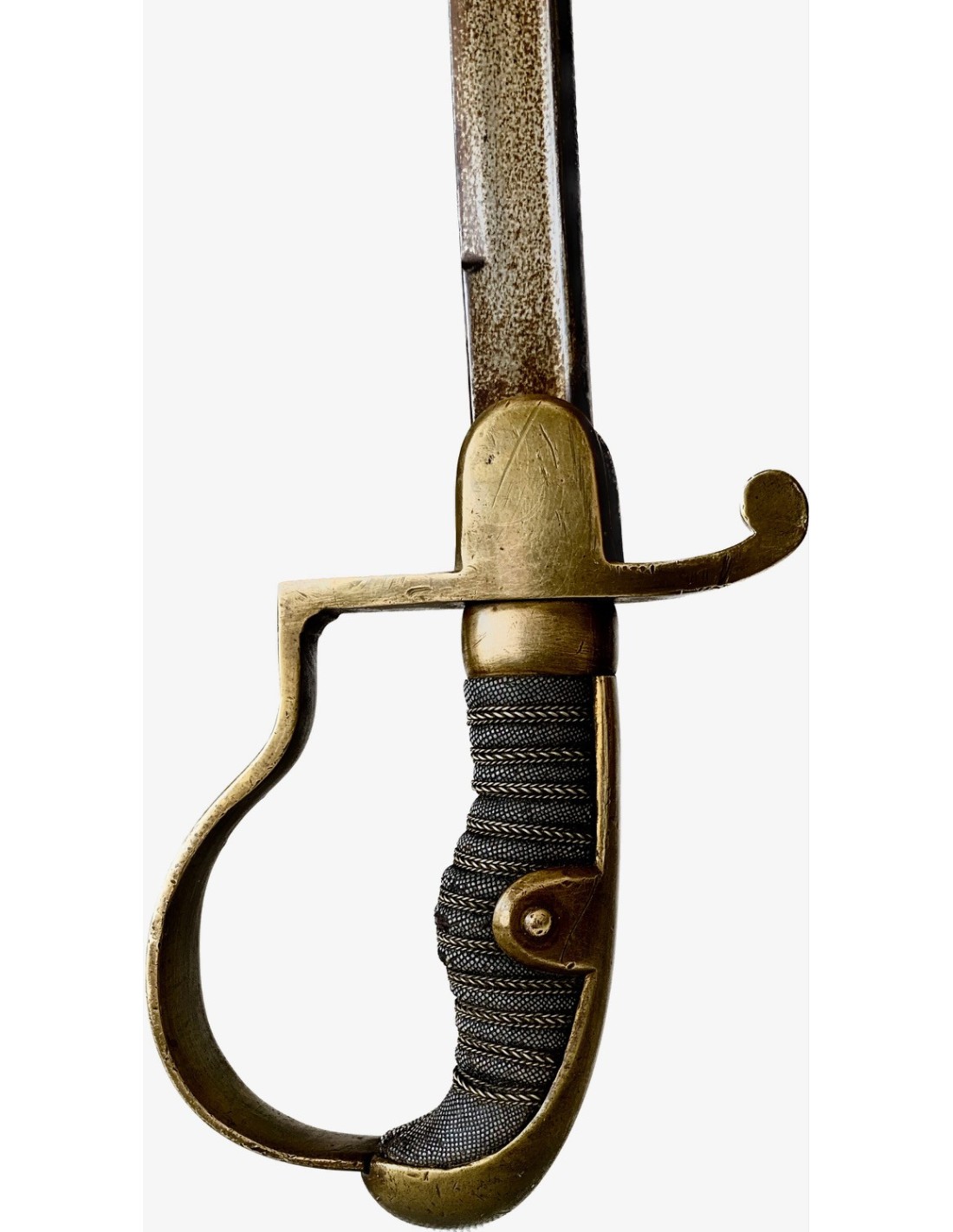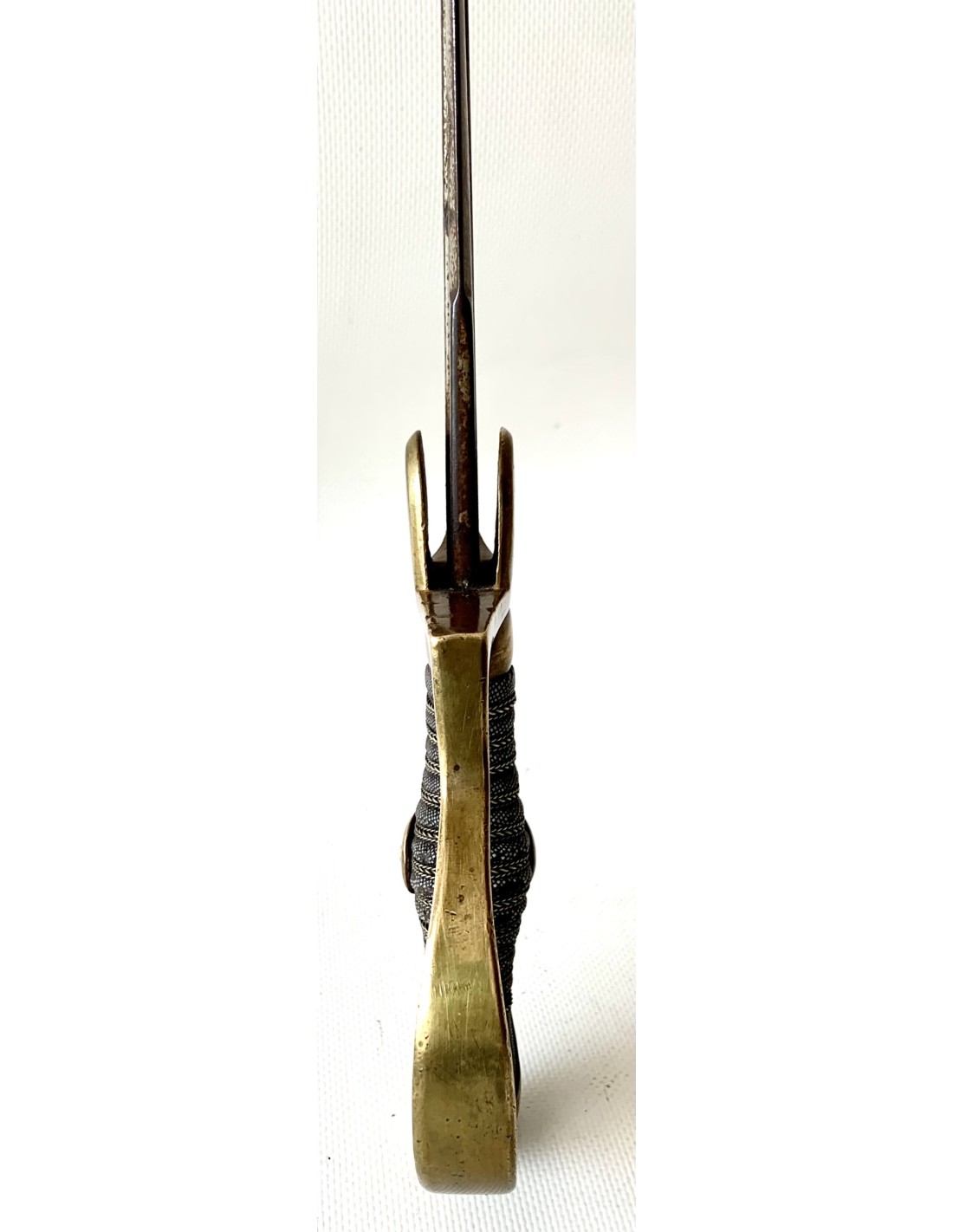 Empuñadura de hierro forrada con piel de ralla y con trenza de latón. Guardia en bronce, hoja de acera con su patina original.