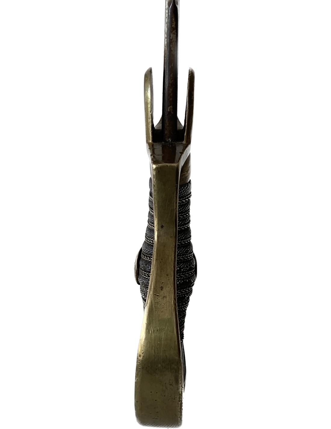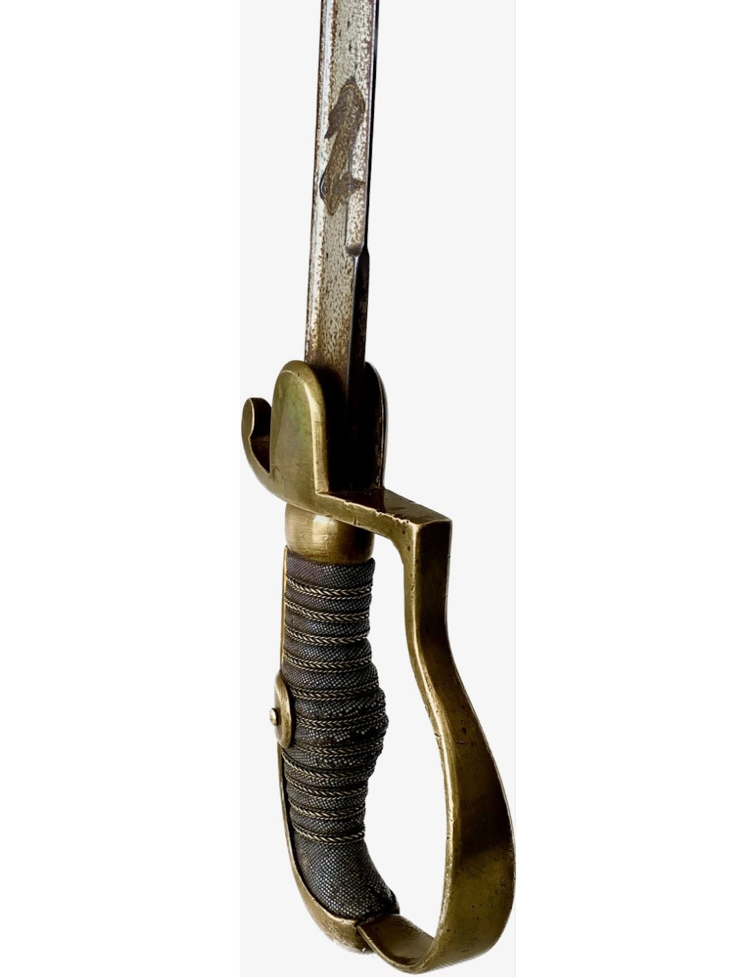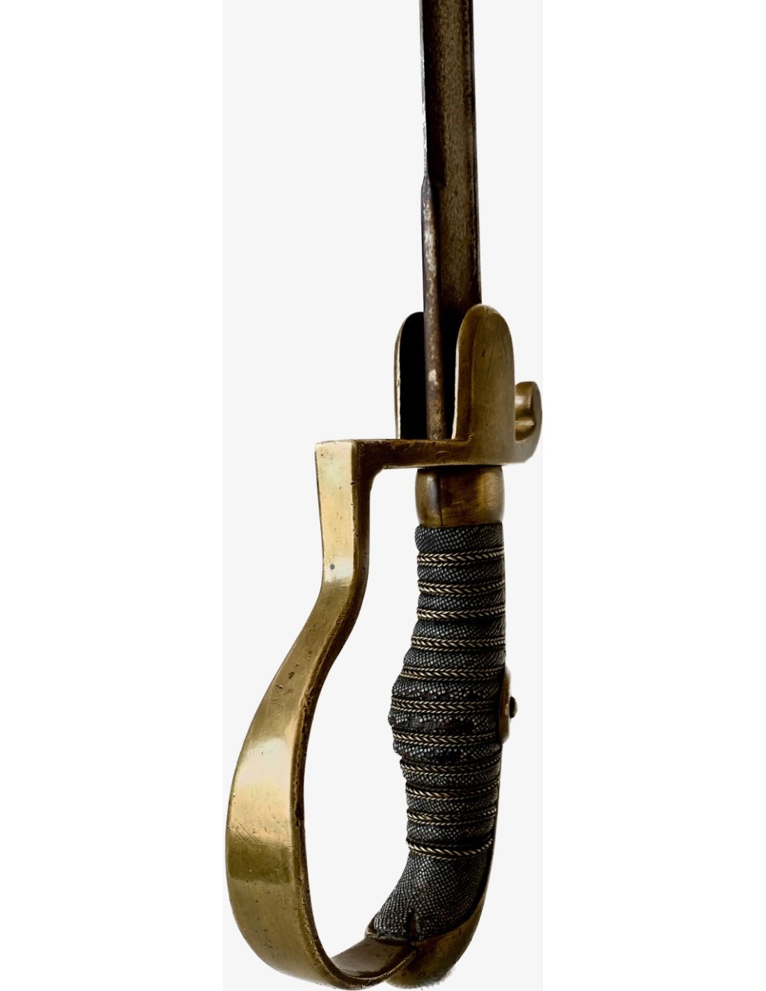 Empuñadura de hierro forrada con piel de ralla y con trenza de latón. Guardia en bronce, hoja de acera con su patina original.