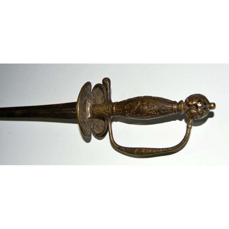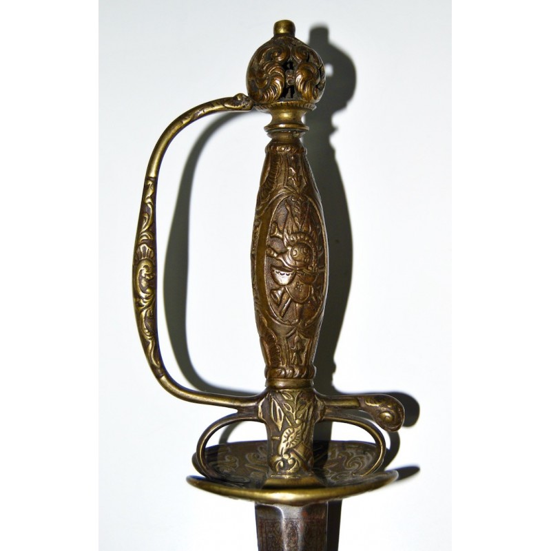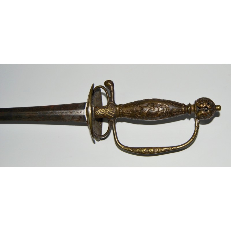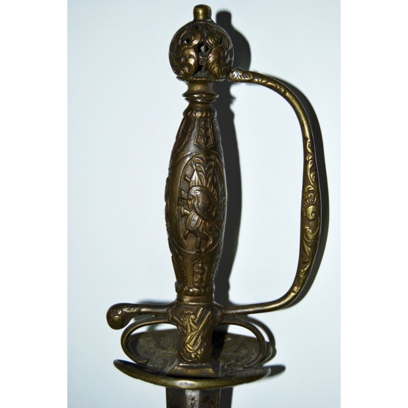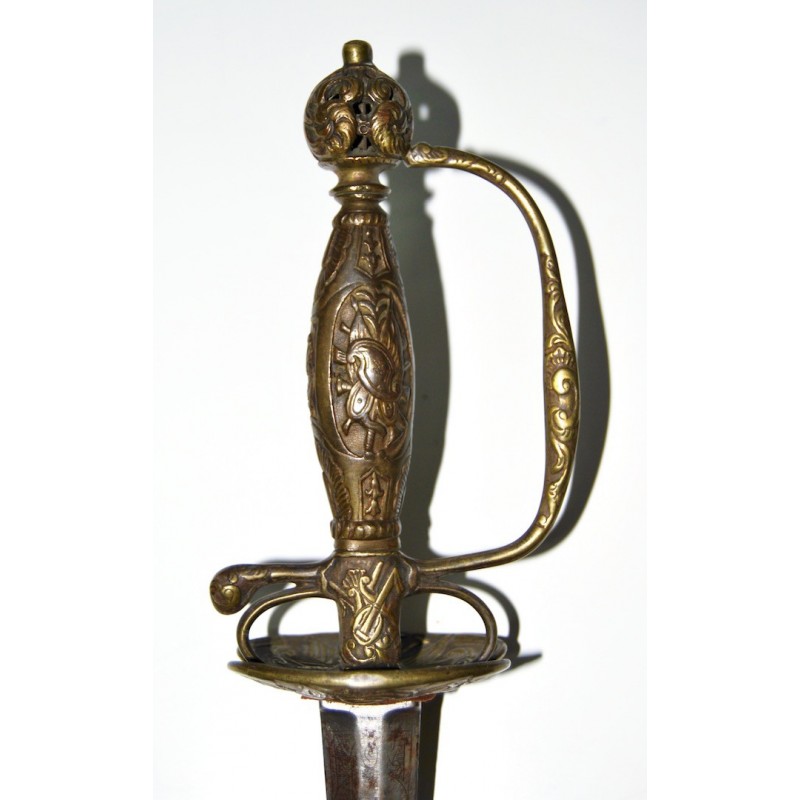 Antigua espada de estoque francesa del siglo XVIII, empuñadura de bronce con relieves de motivos militares, pomo terminal de bronce calado, copete de bronce en forma de concha también con relieves.