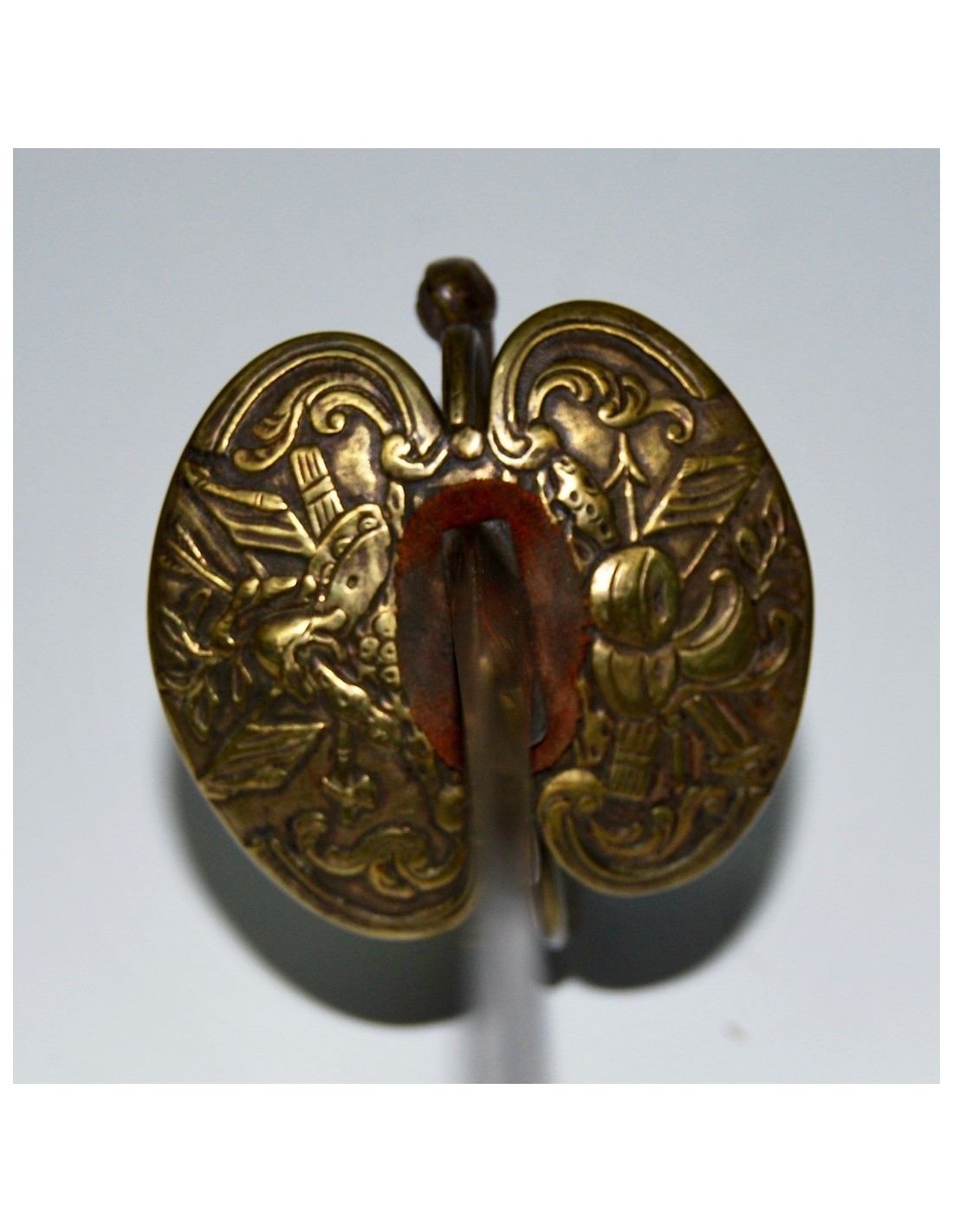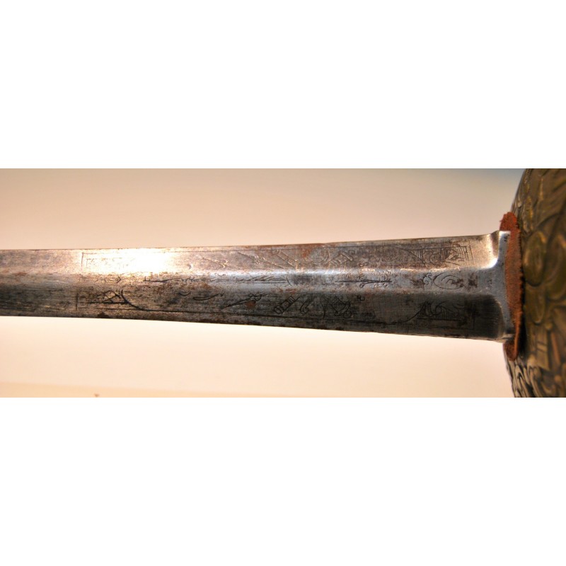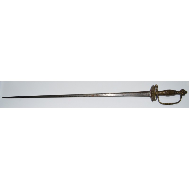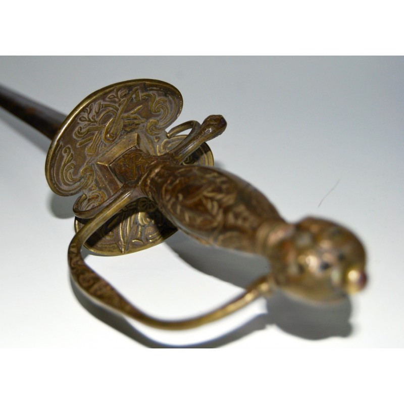 Antigua espada de estoque francesa del siglo XVIII, empuñadura de bronce con relieves de motivos militares, pomo terminal de bronce calado, copete de bronce en forma de concha también con relieves.
