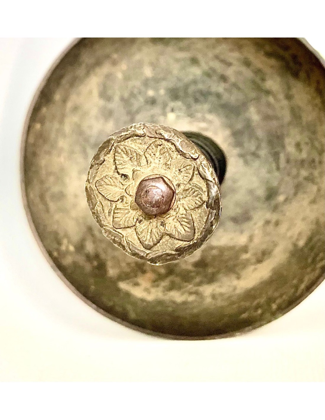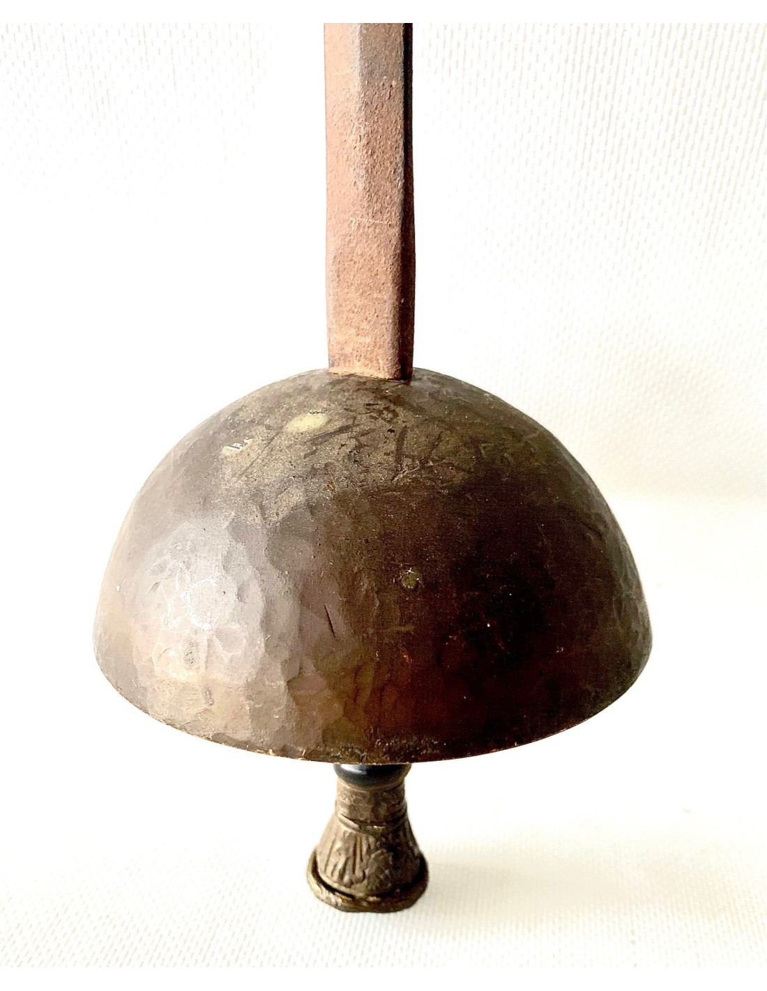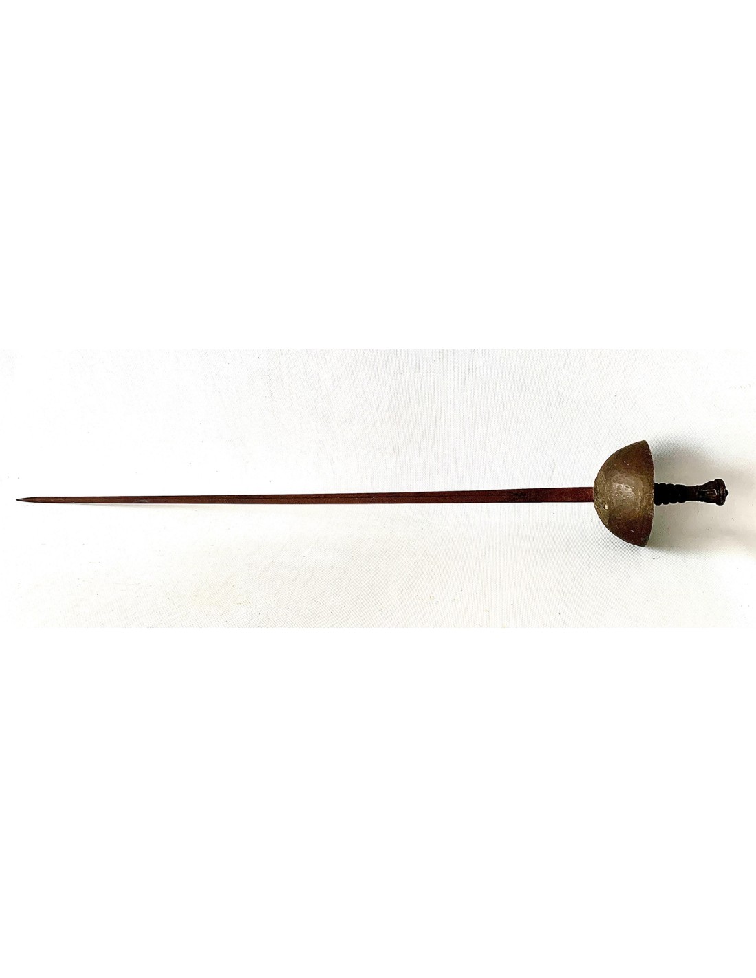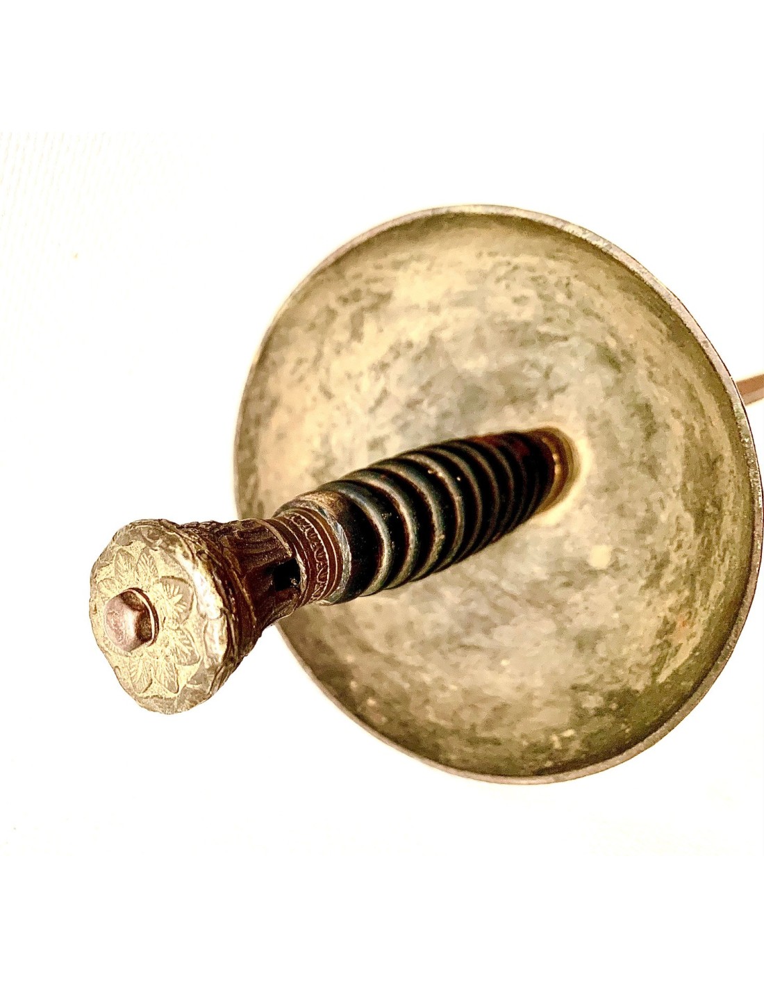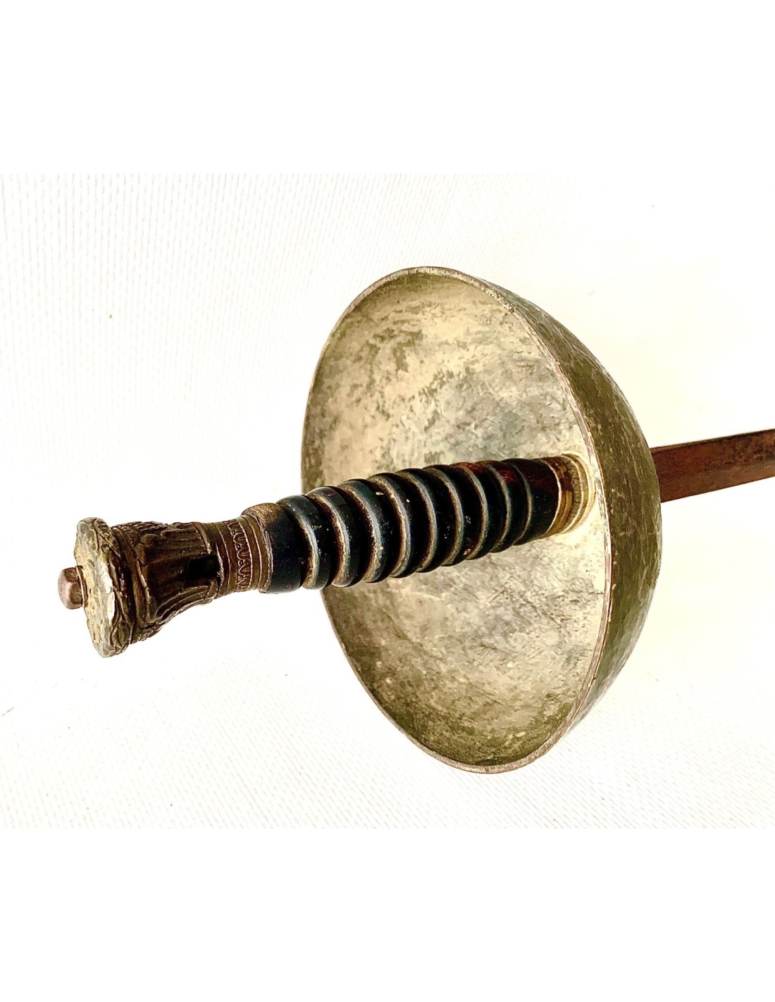 Espada ropera o de cazoleta de niño, de finales del siglo XVIII principios del siglo XIX, empuñadura de madera torneada y lacada negra y pomo de extremidad de bronce con motivo floral. Cazoleta de bronce forjada y martillada. Hoja de hierro, con su patina.
