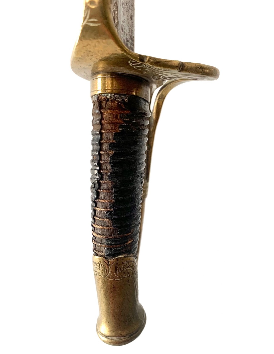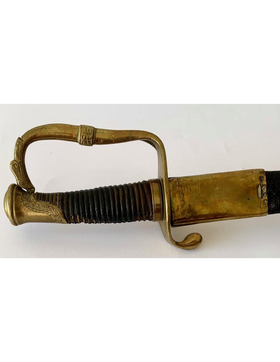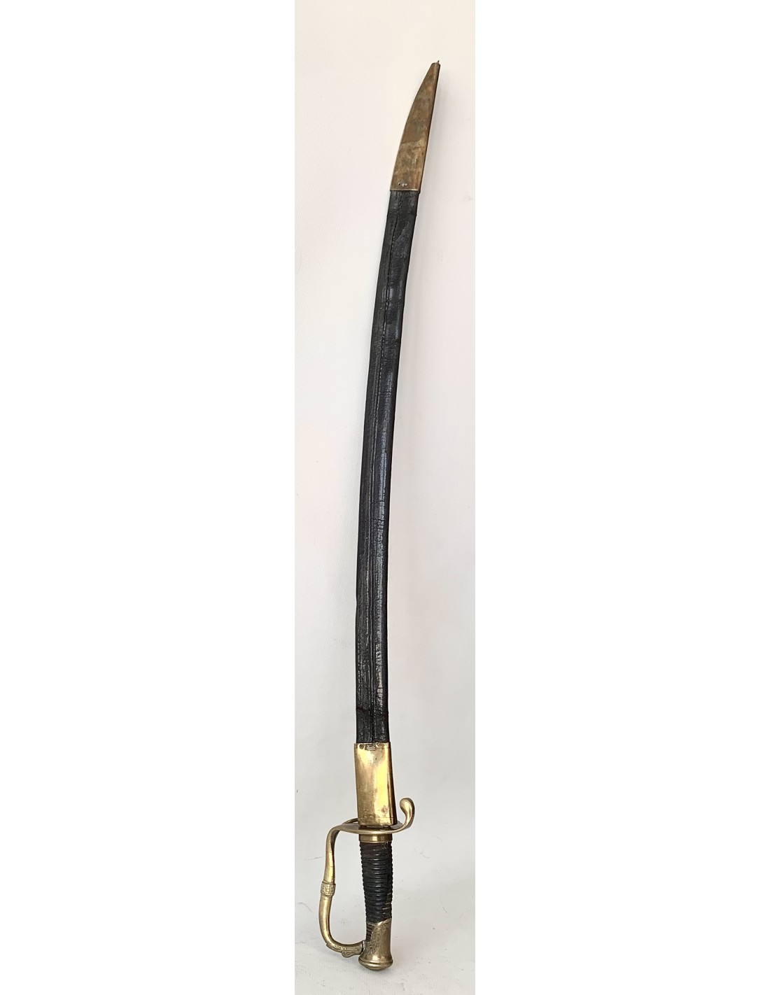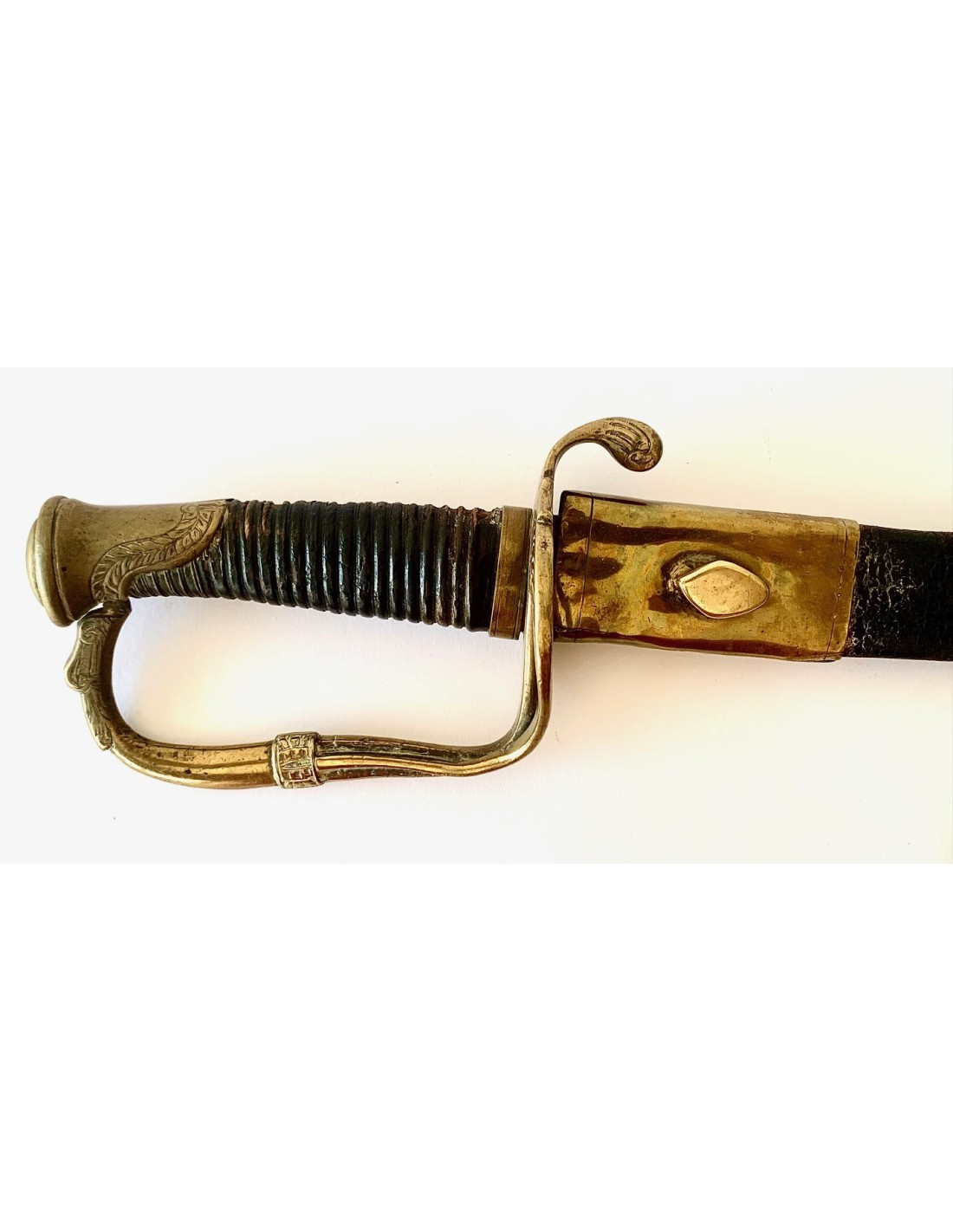 Sable español del siglo XIX, para oficial de infantería modelo 1848, completo con su funda. Empuñadura de madera forrada en piel, extremidades y guarda de bronce cincelado, hoja de acero.