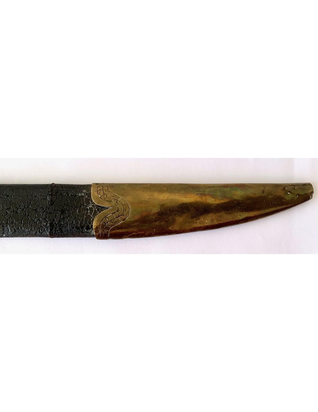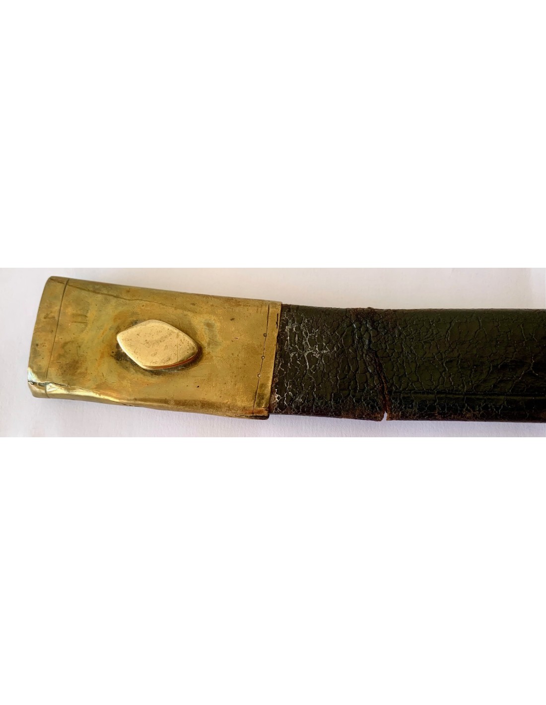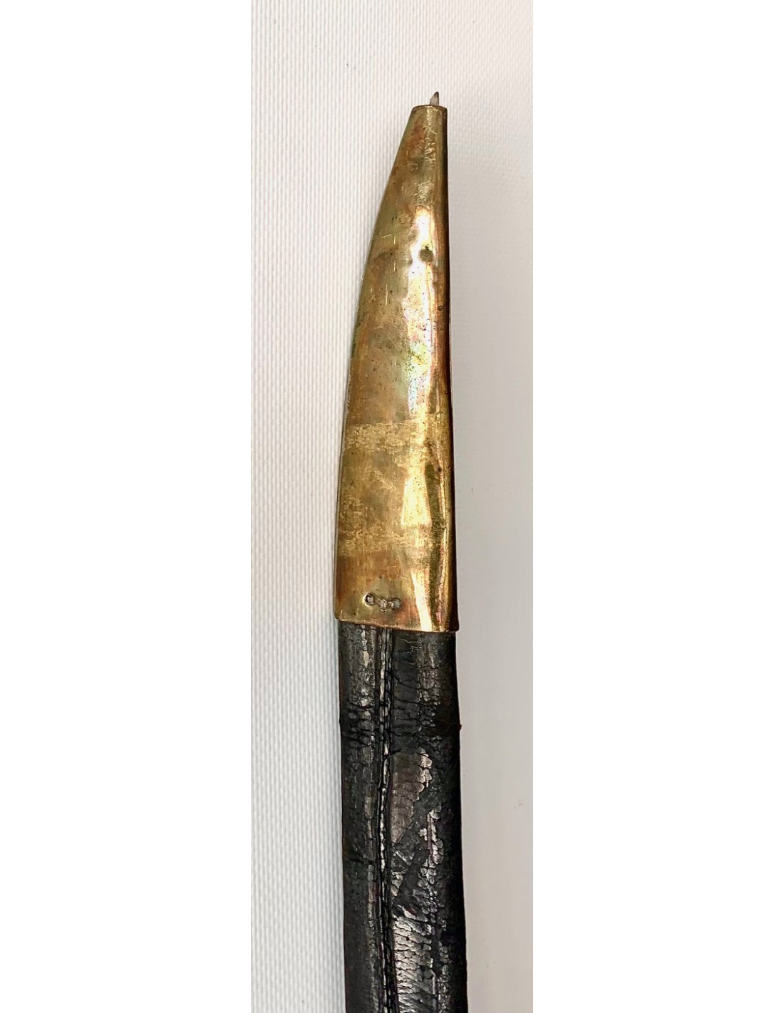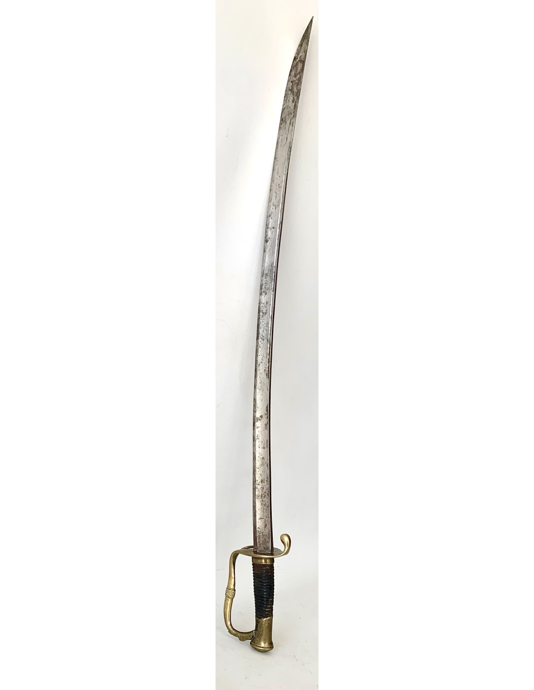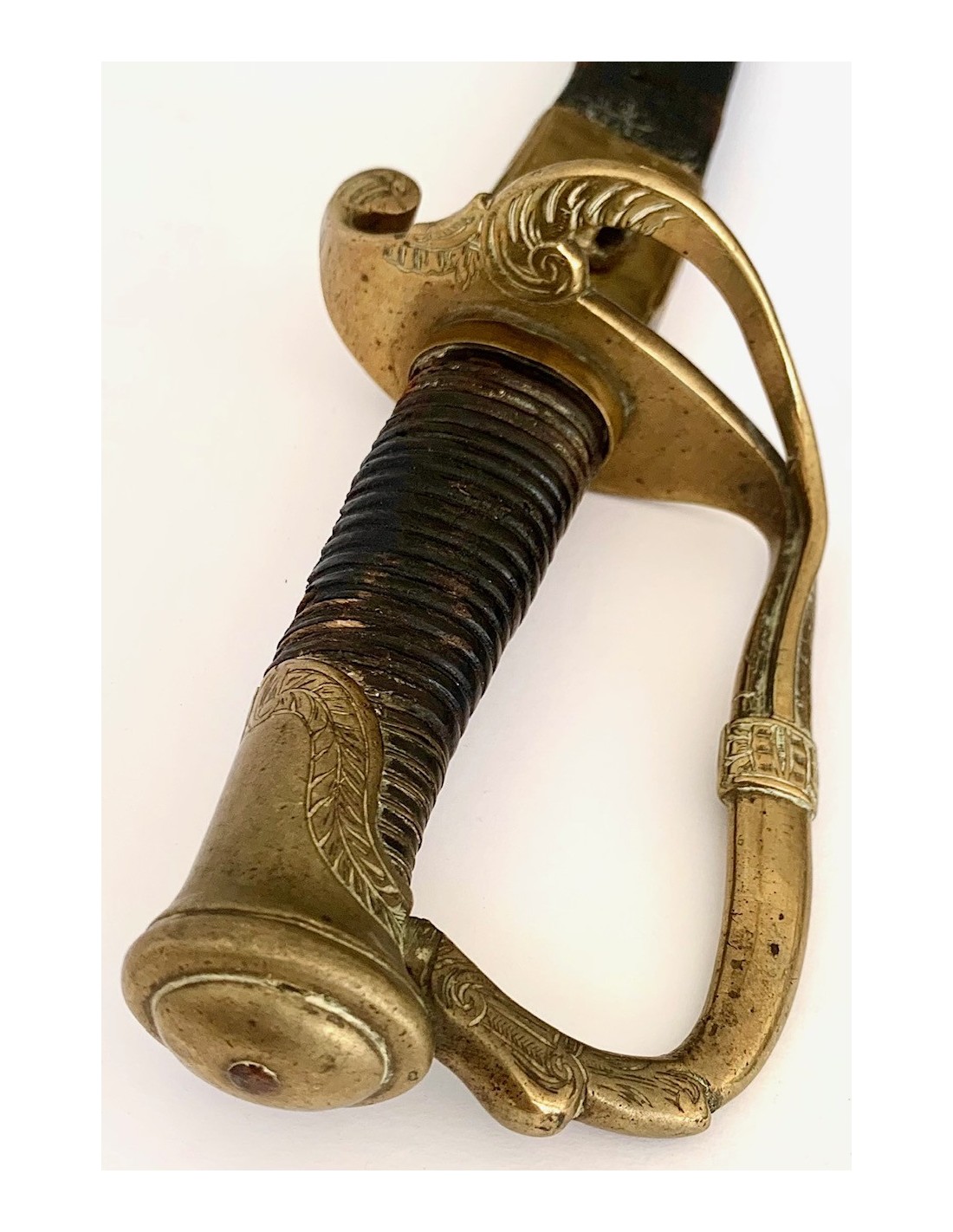Sable español del siglo XIX, para oficial de infantería modelo 1848, completo con su funda. Empuñadura de madera forrada en piel, extremidades y guarda de bronce cincelado, hoja de acero.