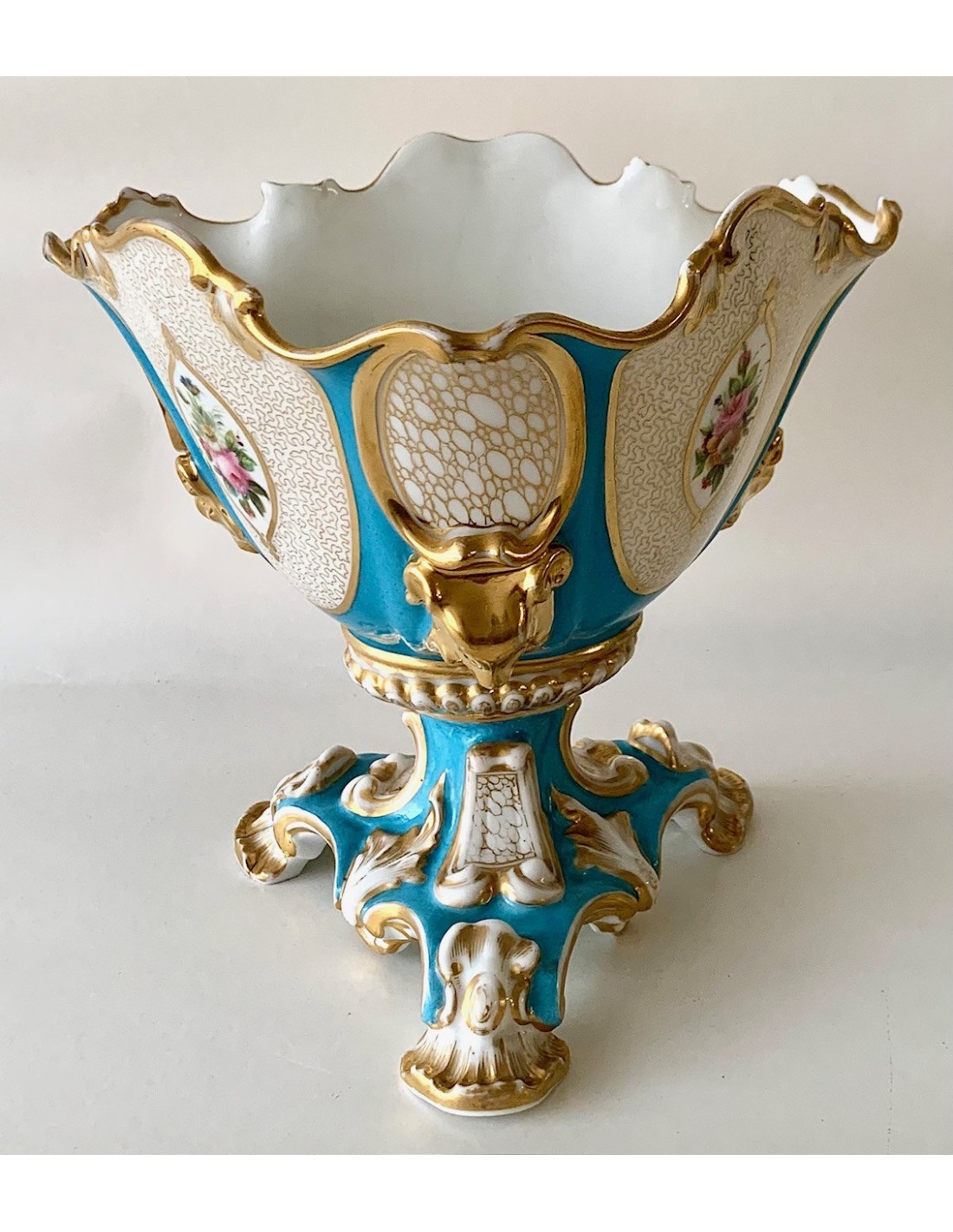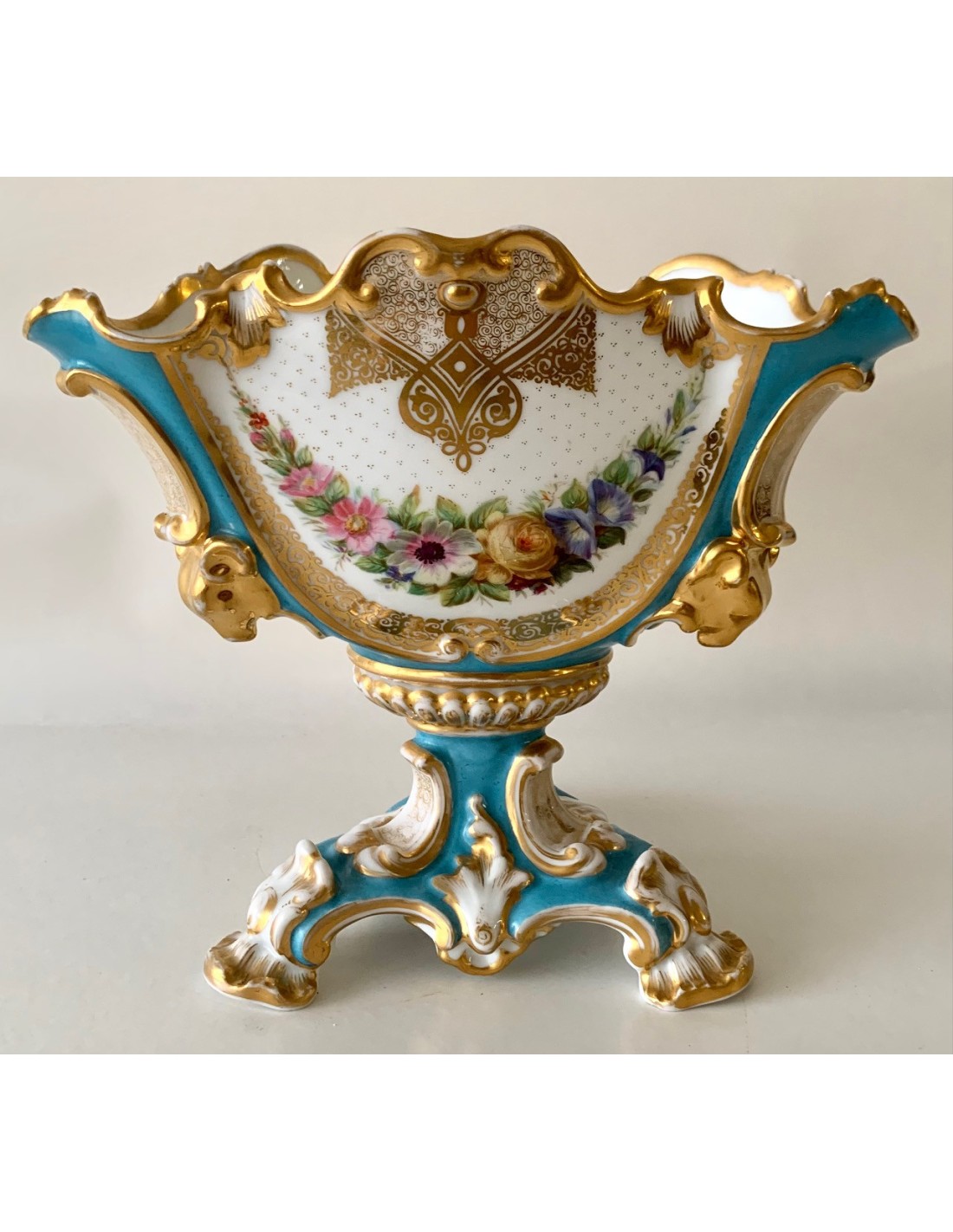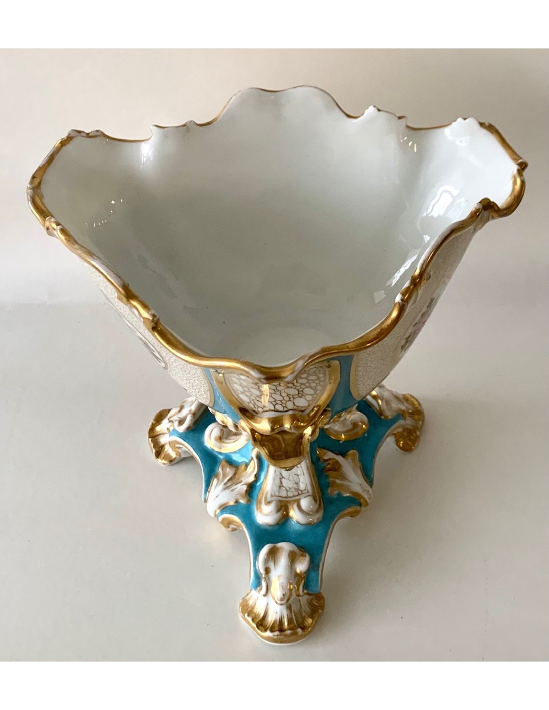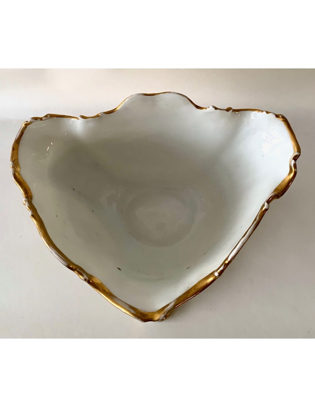 Copa para fruta, de cerámica viejo Paris en estilo Sevres, finales del siglo XIX. Copa de forma triangular, con flores pintadas en los tres lados, dos en sentido vertical y la otra mas grande en sentido horizontal. En las tres esquinas sobresalen cabezas de aries doradas, dorados también son todos los márgenes de la copa. Base también de forma triangular. Perfecto estado de conservación.