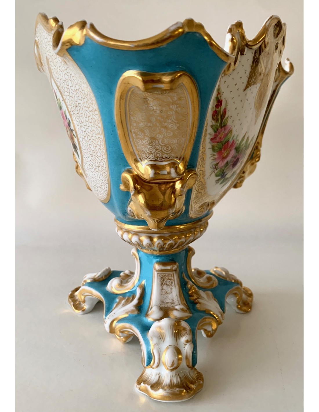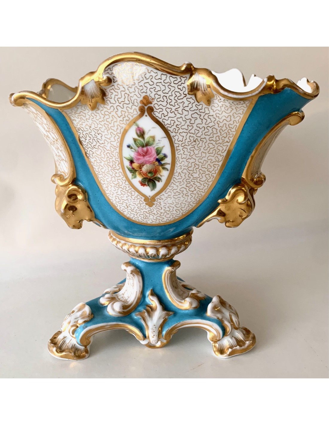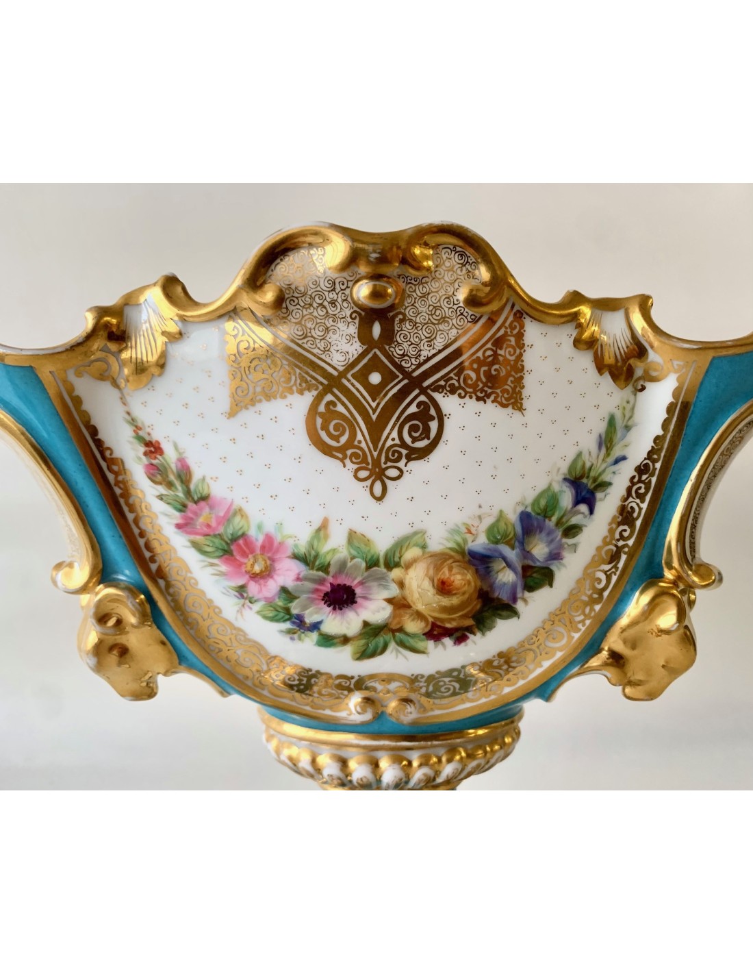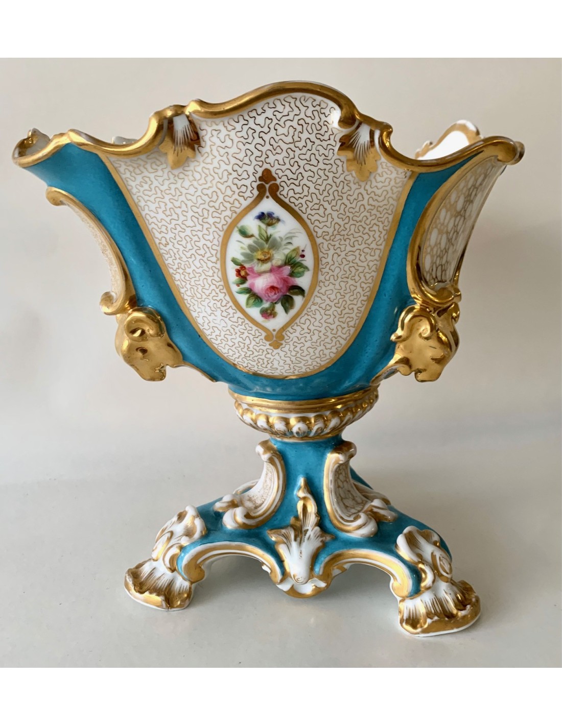 Copa para fruta, de cerámica viejo Paris en estilo Sevres, finales del siglo XIX. Copa de forma triangular, con flores pintadas en los tres lados, dos en sentido vertical y la otra mas grande en sentido horizontal. En las tres esquinas sobresalen cabezas de aries doradas, dorados también son todos los márgenes de la copa. Base también de forma triangular. Perfecto estado de conservación.