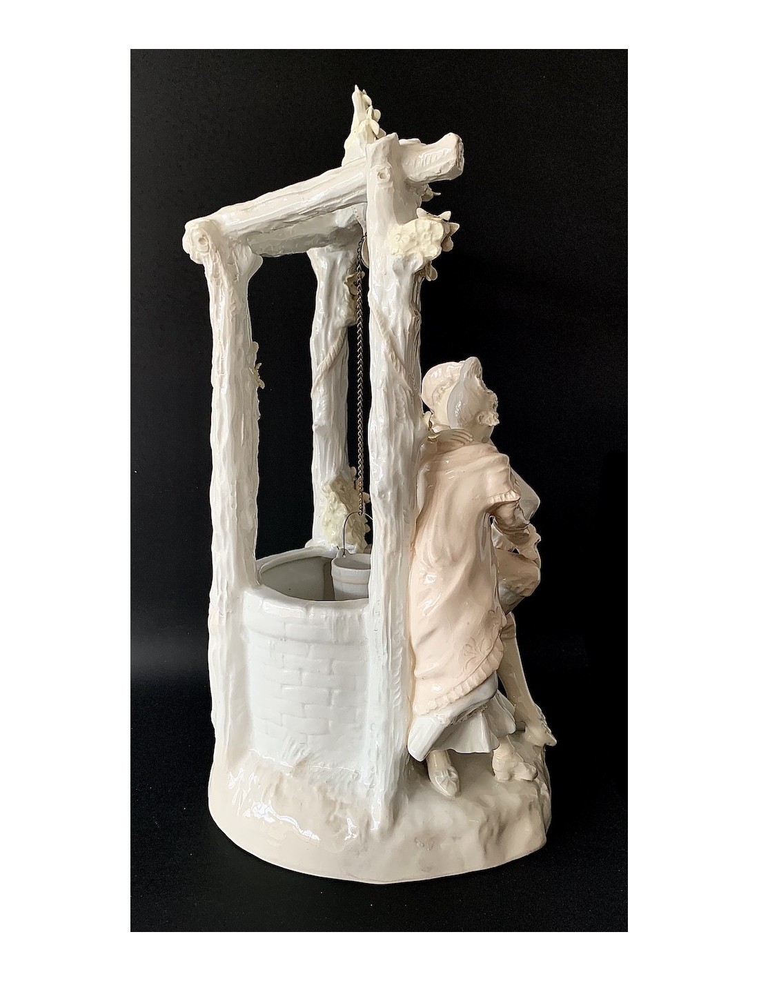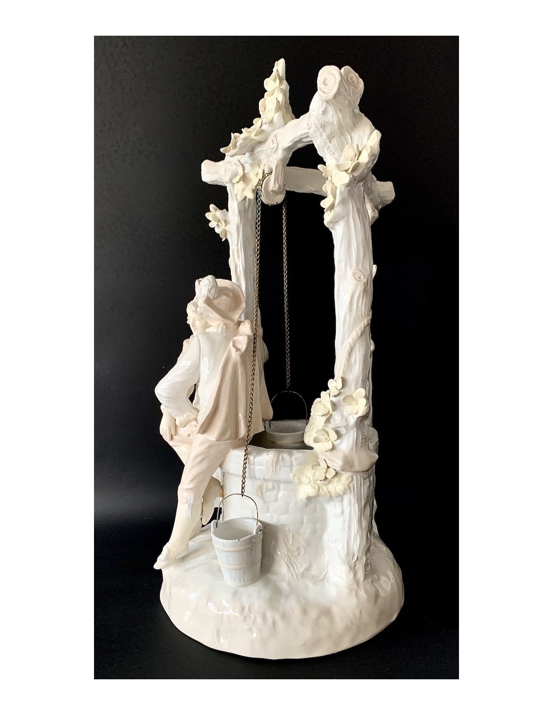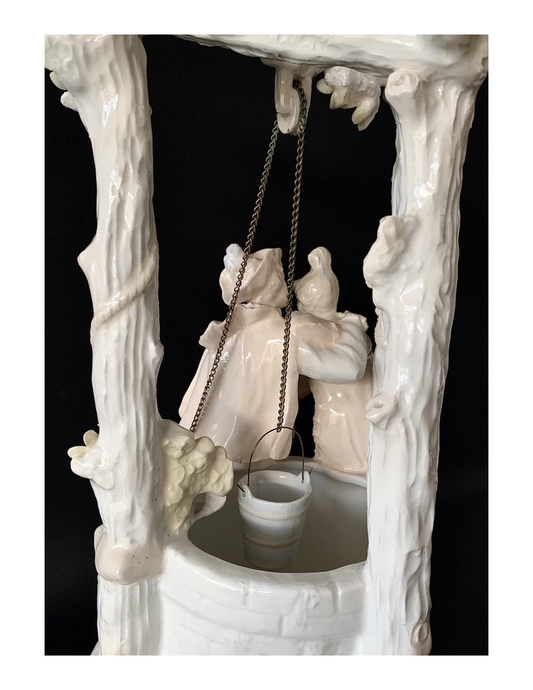 “Pareja de figuras delante al pozo”, cerámica loza valenciana de principios del siglo XX (1900-1920), esmaltada con tonalidades pastel claras. Cadena metálica de latón a la cual van atados dos cubos, uno fijo en la base y el otro libre dentro el pozo.