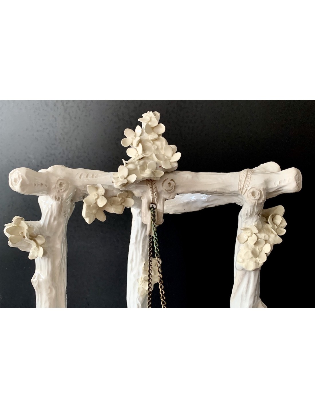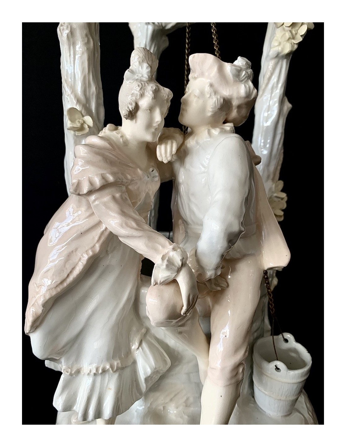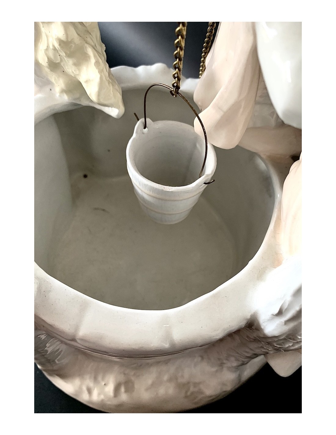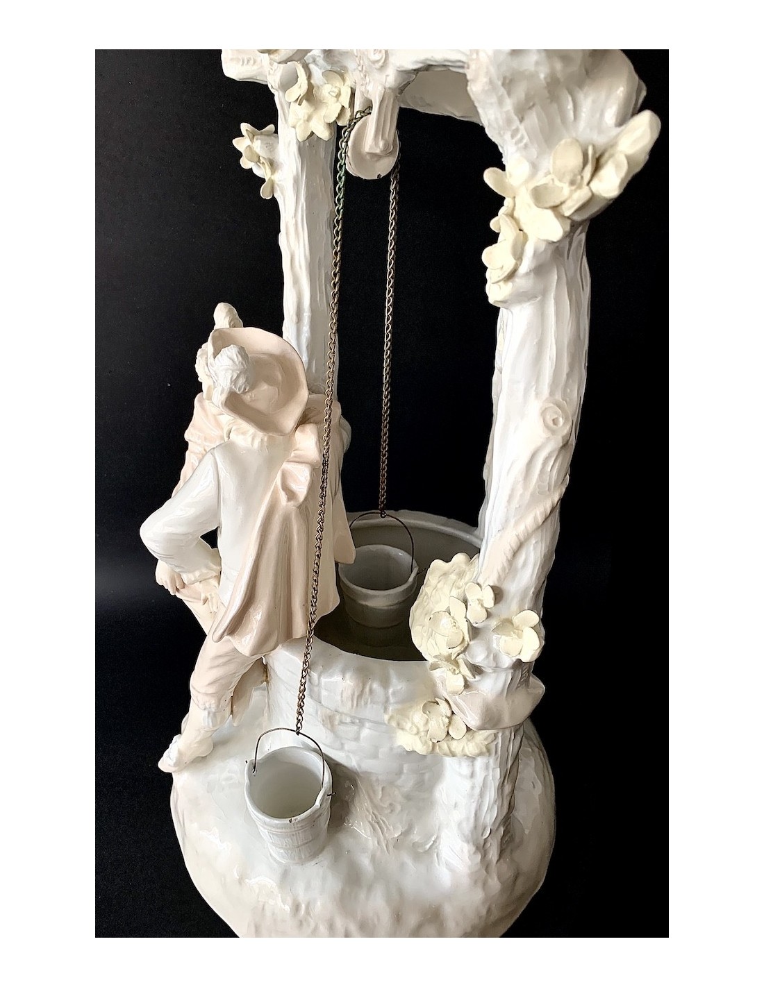 “Pareja de figuras delante al pozo”, cerámica loza valenciana de principios del siglo XX (1900-1920), esmaltada con tonalidades pastel claras. Cadena metálica de latón a la cual van atados dos cubos, uno fijo en la base y el otro libre dentro el pozo.