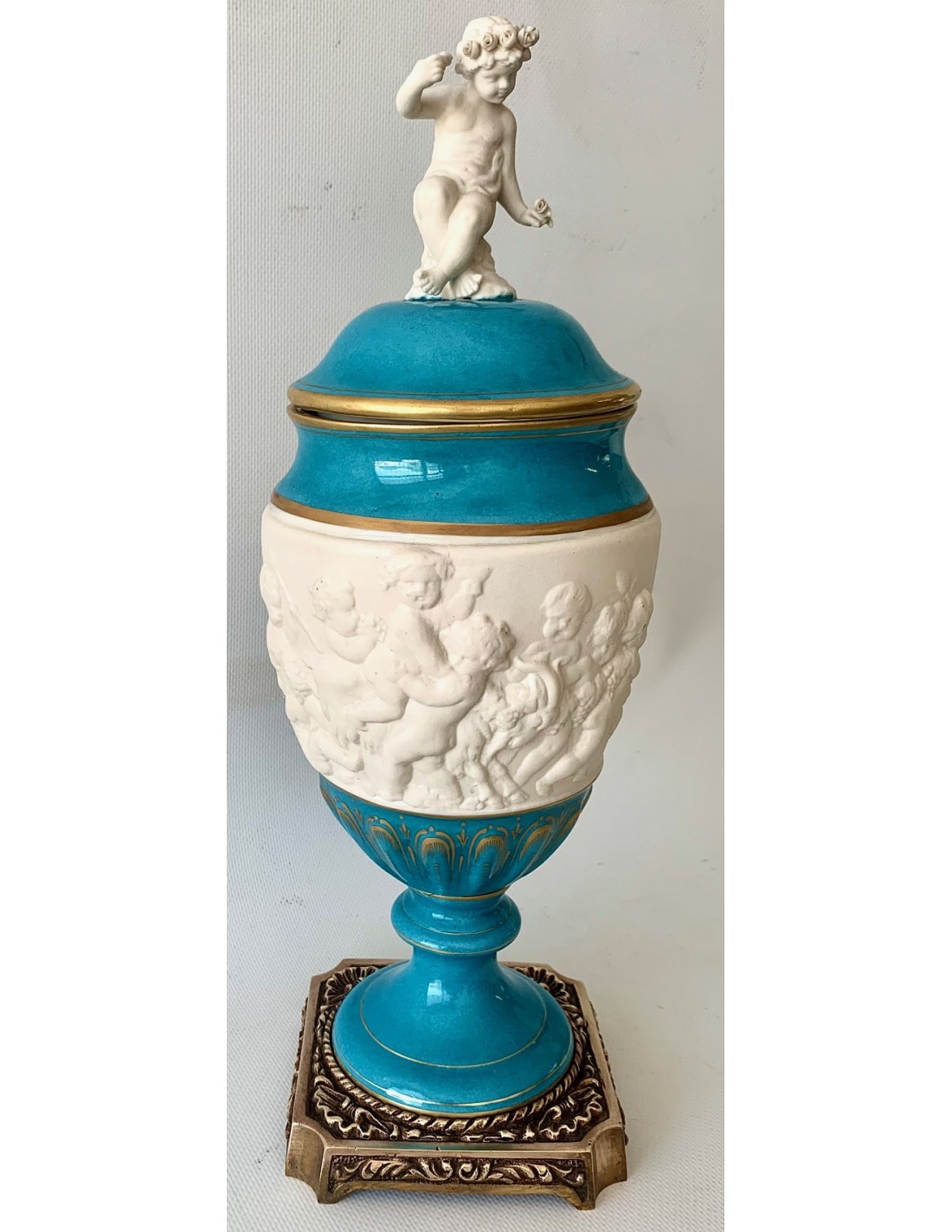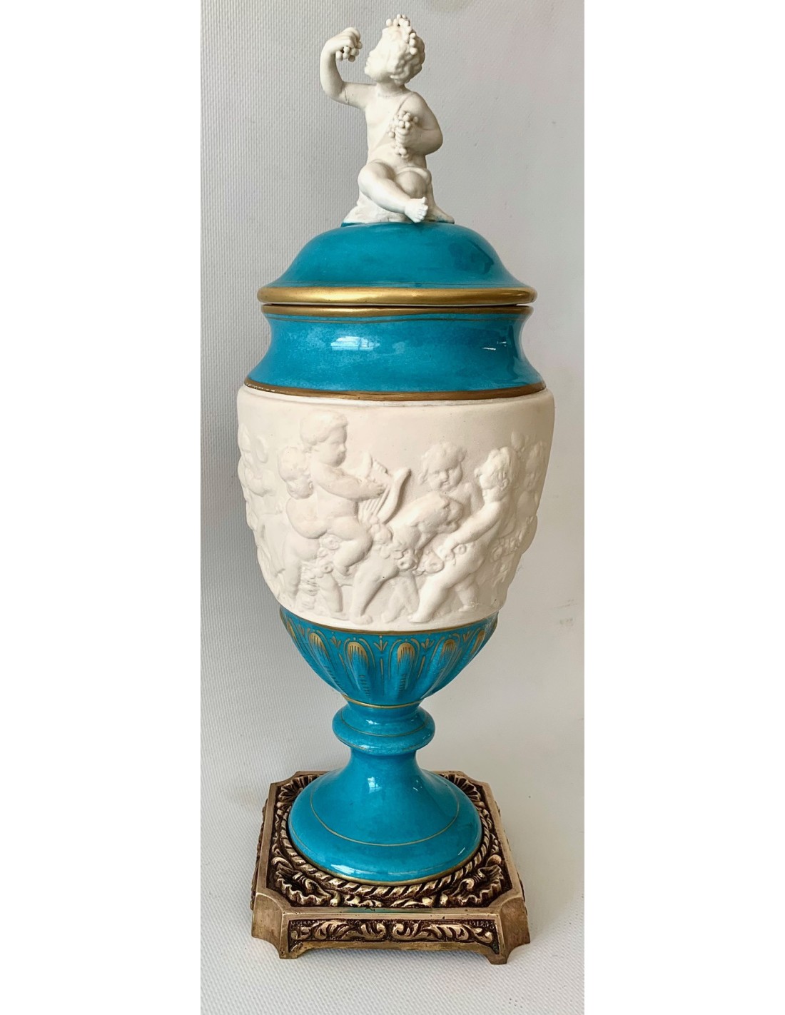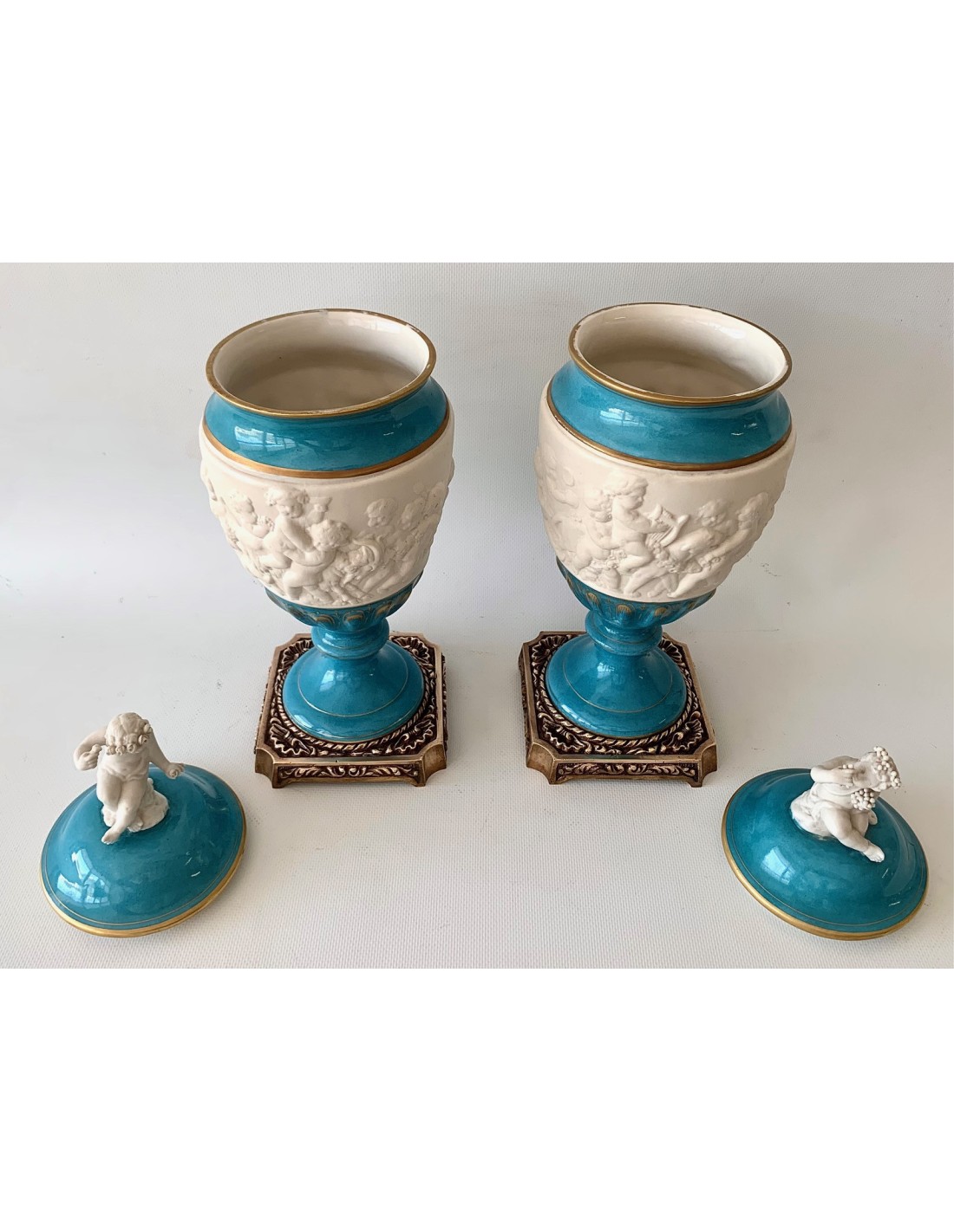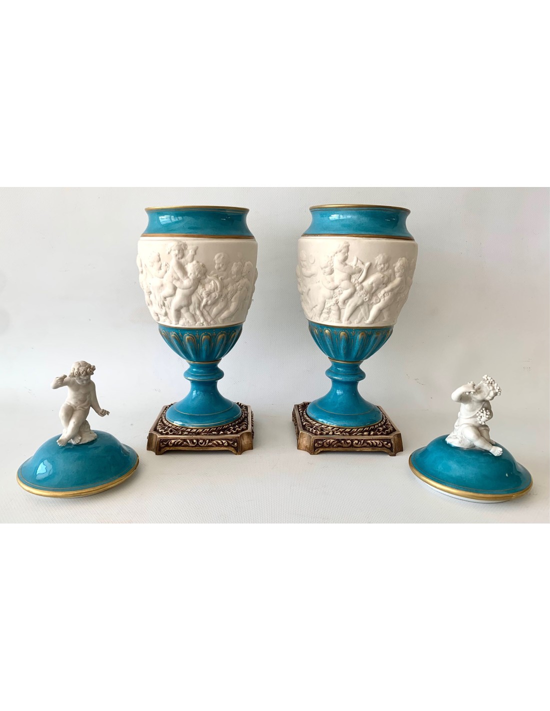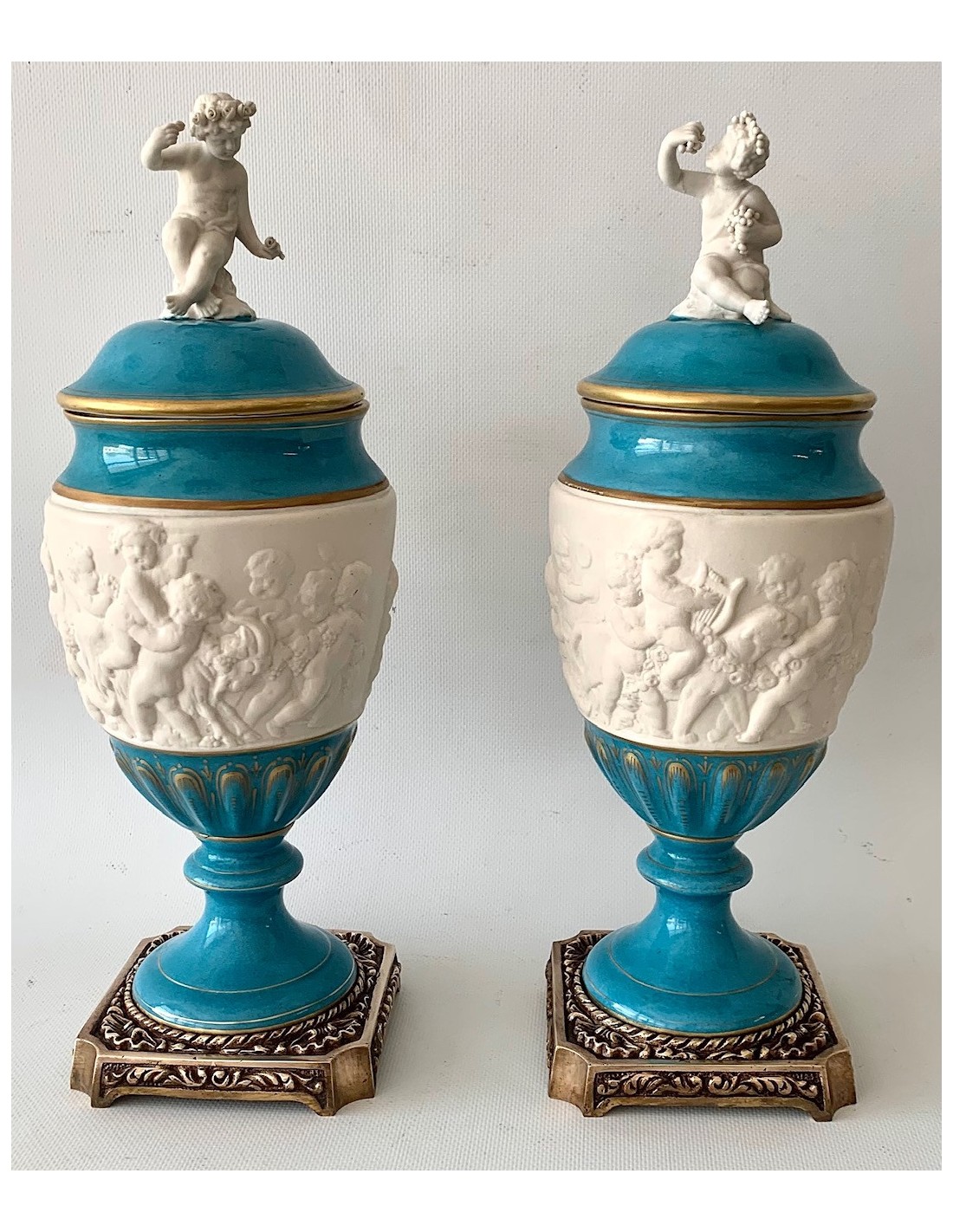 Pareja de copas de porcelana de Sevres turquesa y decoraciones doradas. Tapa con querubines en biscuit blanco, sentados y uno de ellos con racimo de uva y el otro con flores. Zona central también en biscuit y con escenas mitológicas con querubines en relieve. Base cuadrada de bronce.