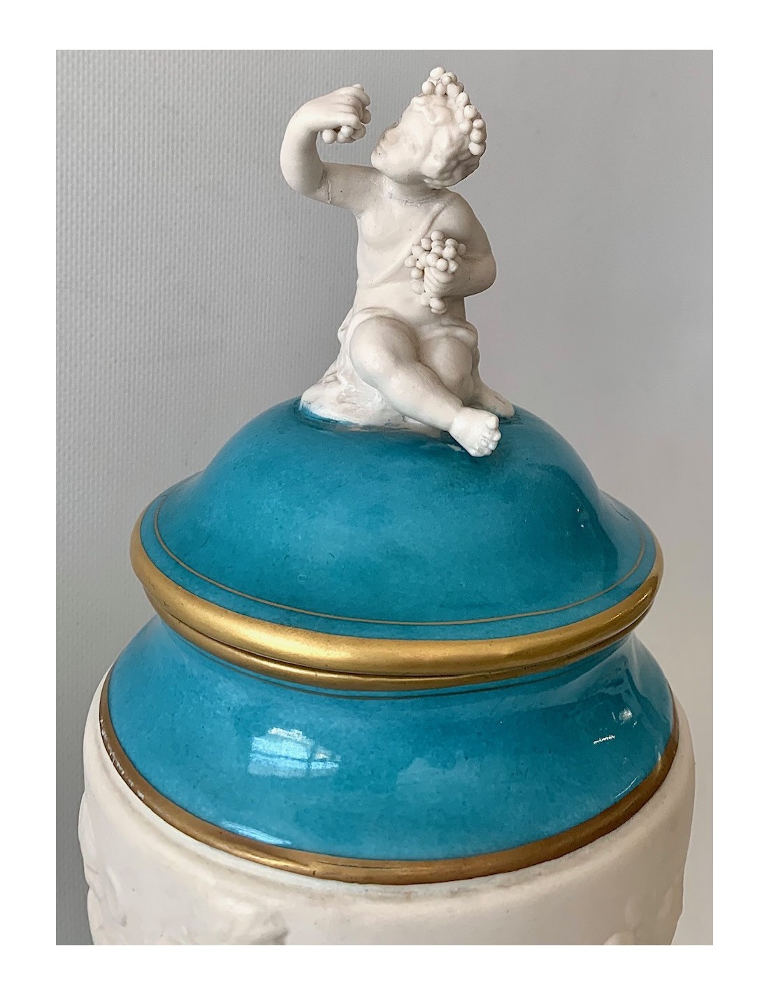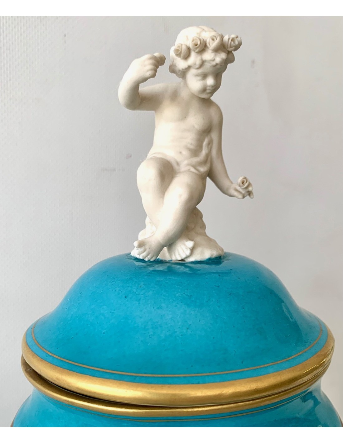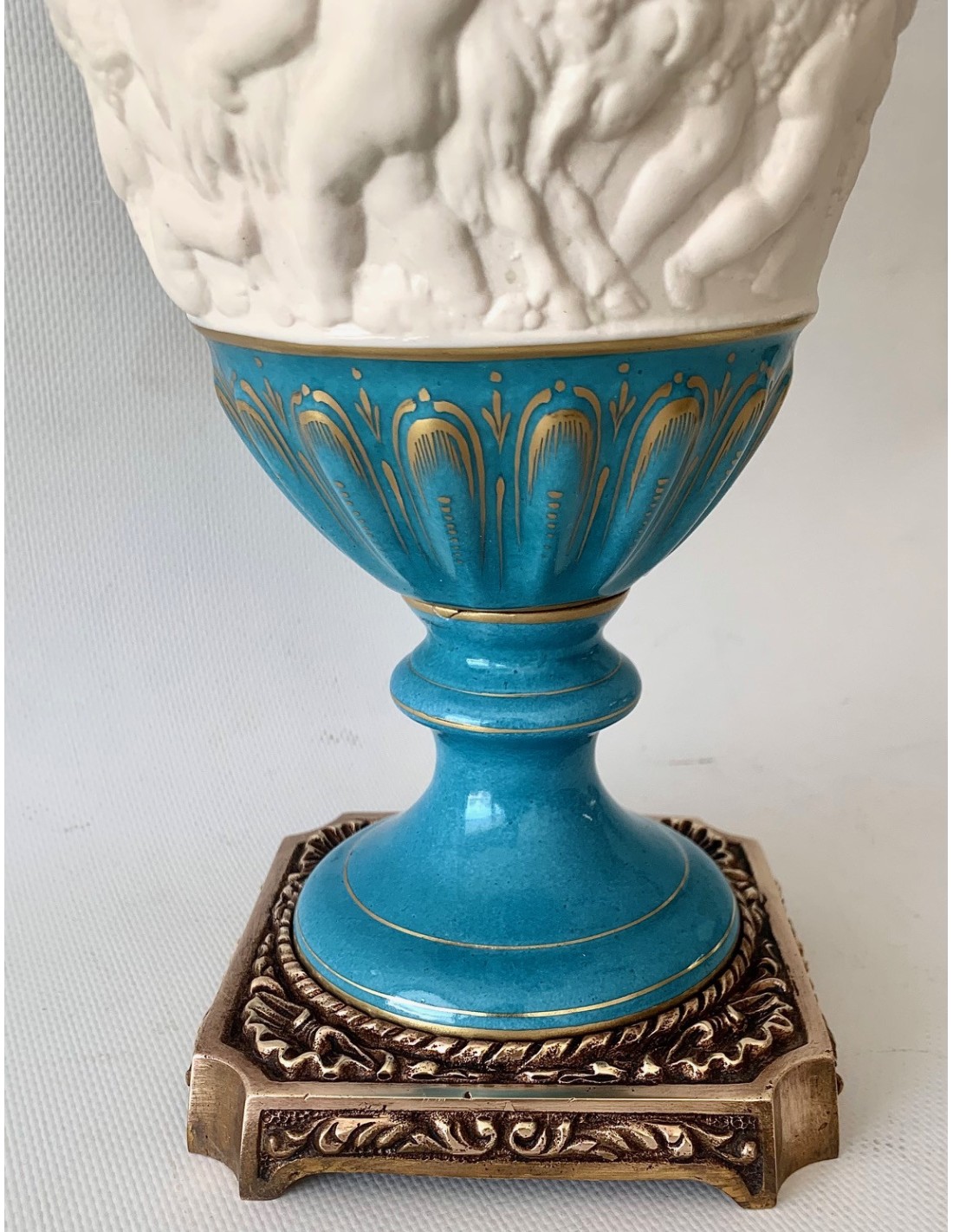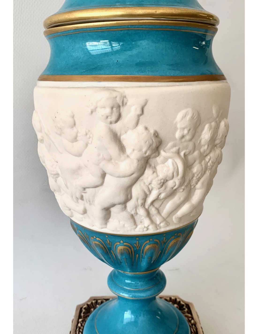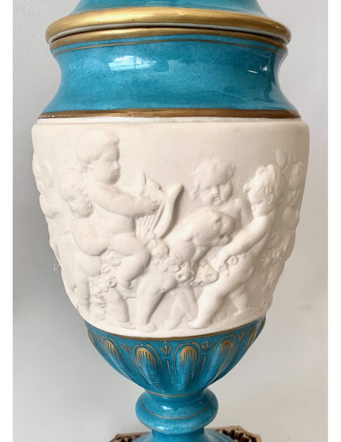 Pareja de copas de porcelana de Sevres turquesa y decoraciones doradas. Tapa con querubines en biscuit blanco, sentados y uno de ellos con racimo de uva y el otro con flores. Zona central también en biscuit y con escenas mitológicas con querubines en relieve. Base cuadrada de bronce.