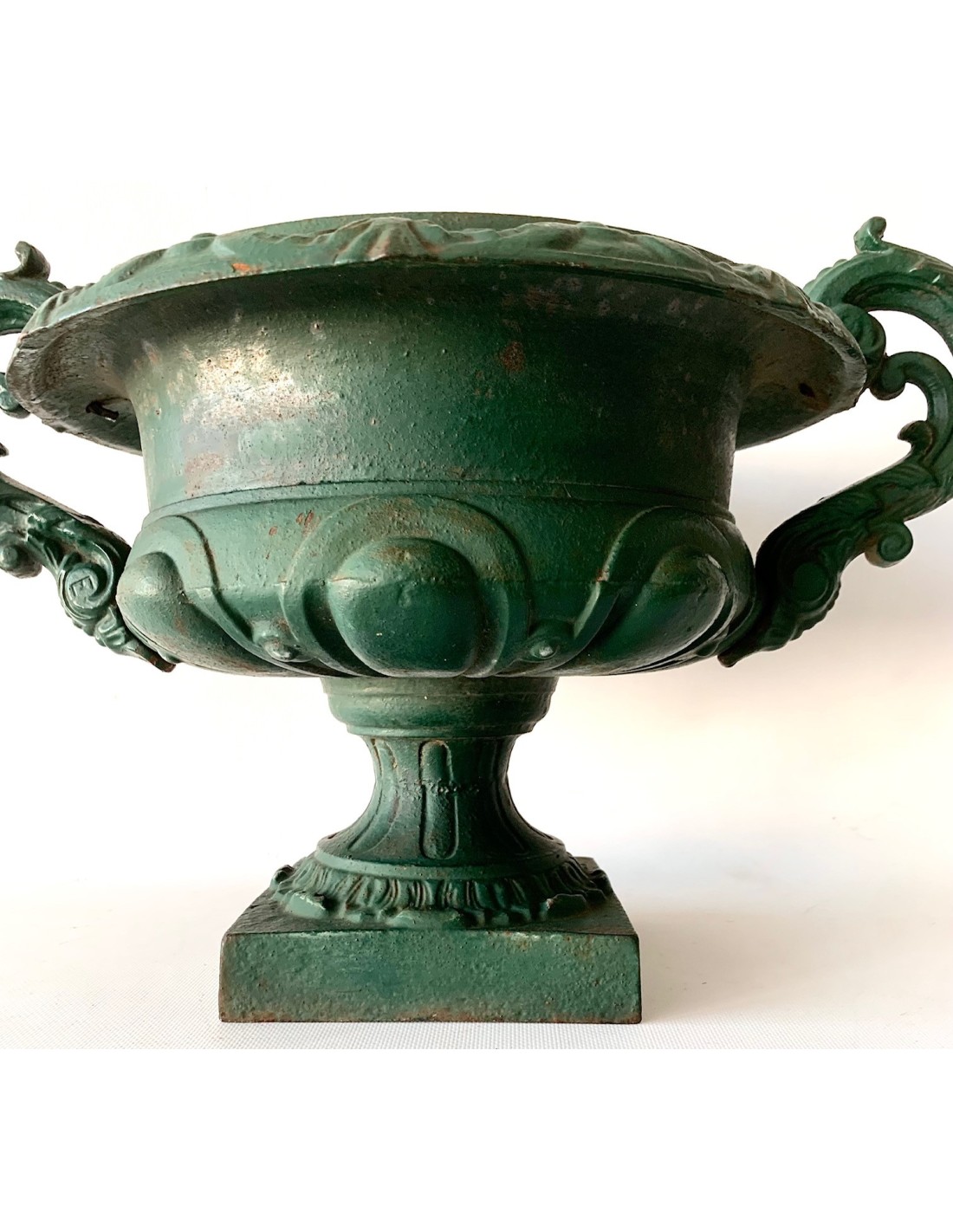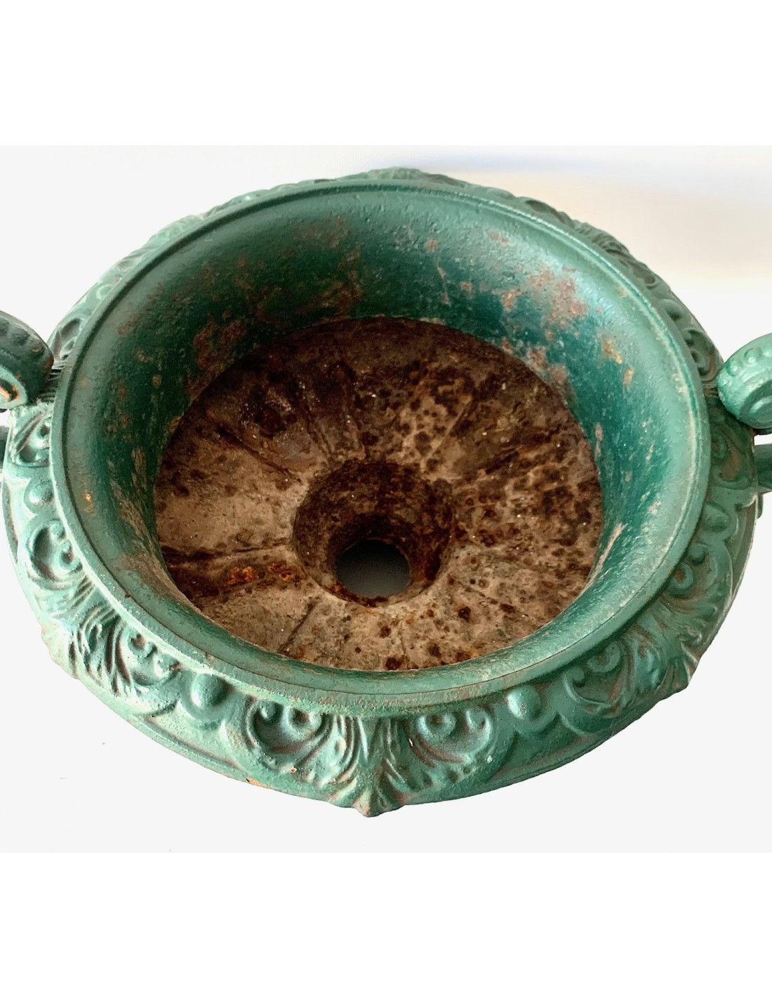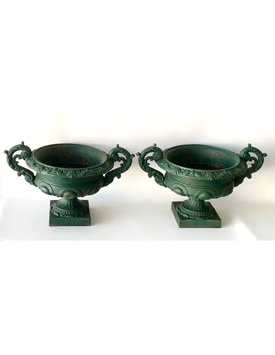 Pareja de copas de hierro de fundición, esmalte original verde, principios del siglo XX (1900-1920 circa), algún punto de oxido en el interior de las copas, normal ya que eran piezas expuestas al exterior, se adaptan perfectamente en decoraciones de interior encima de cómodas, consolas o columnas.
