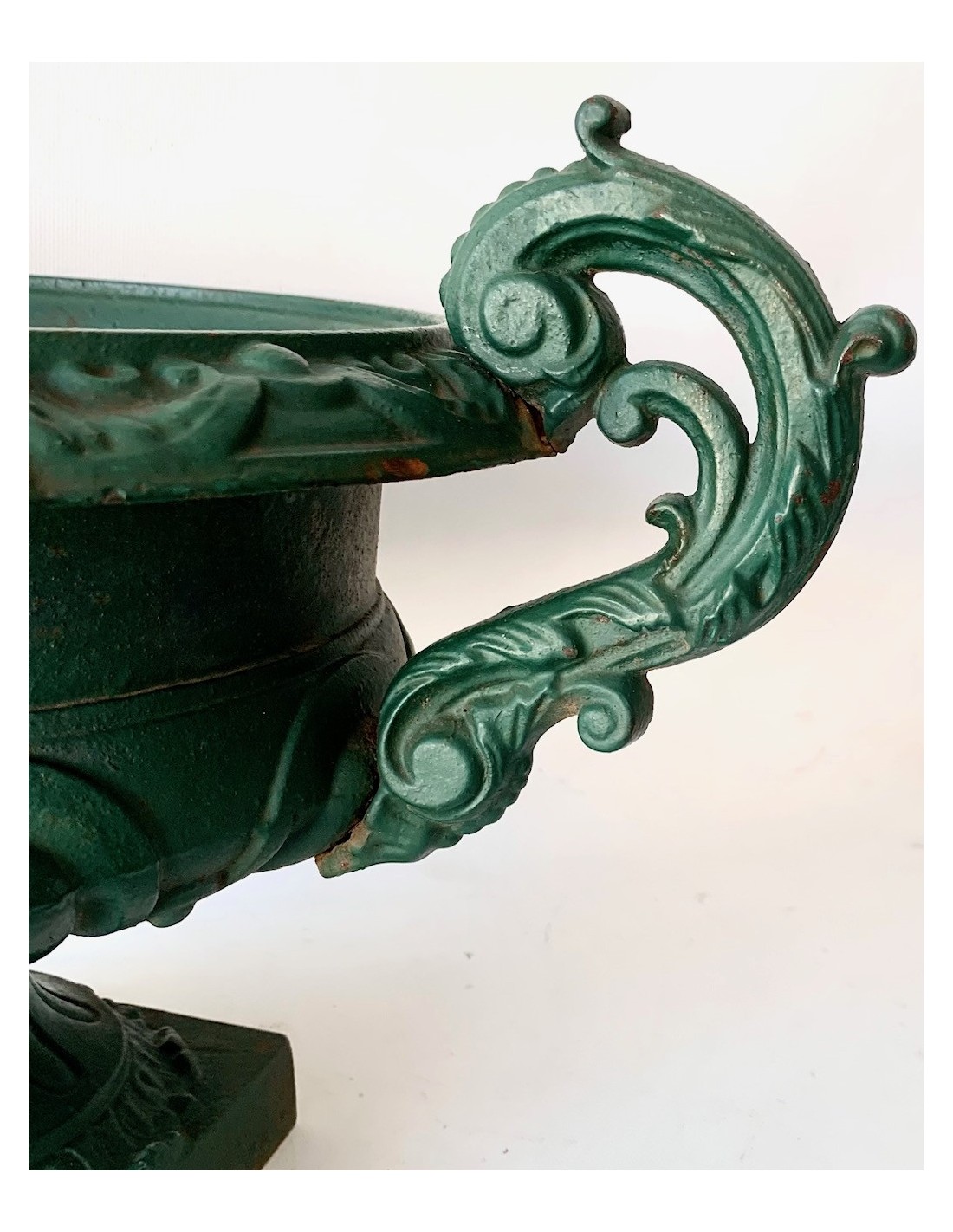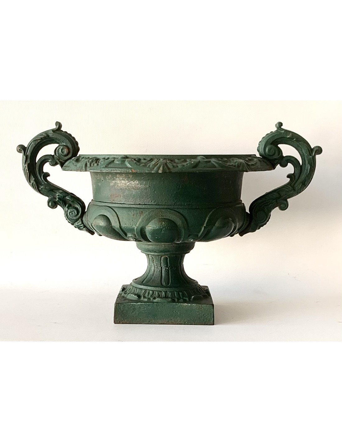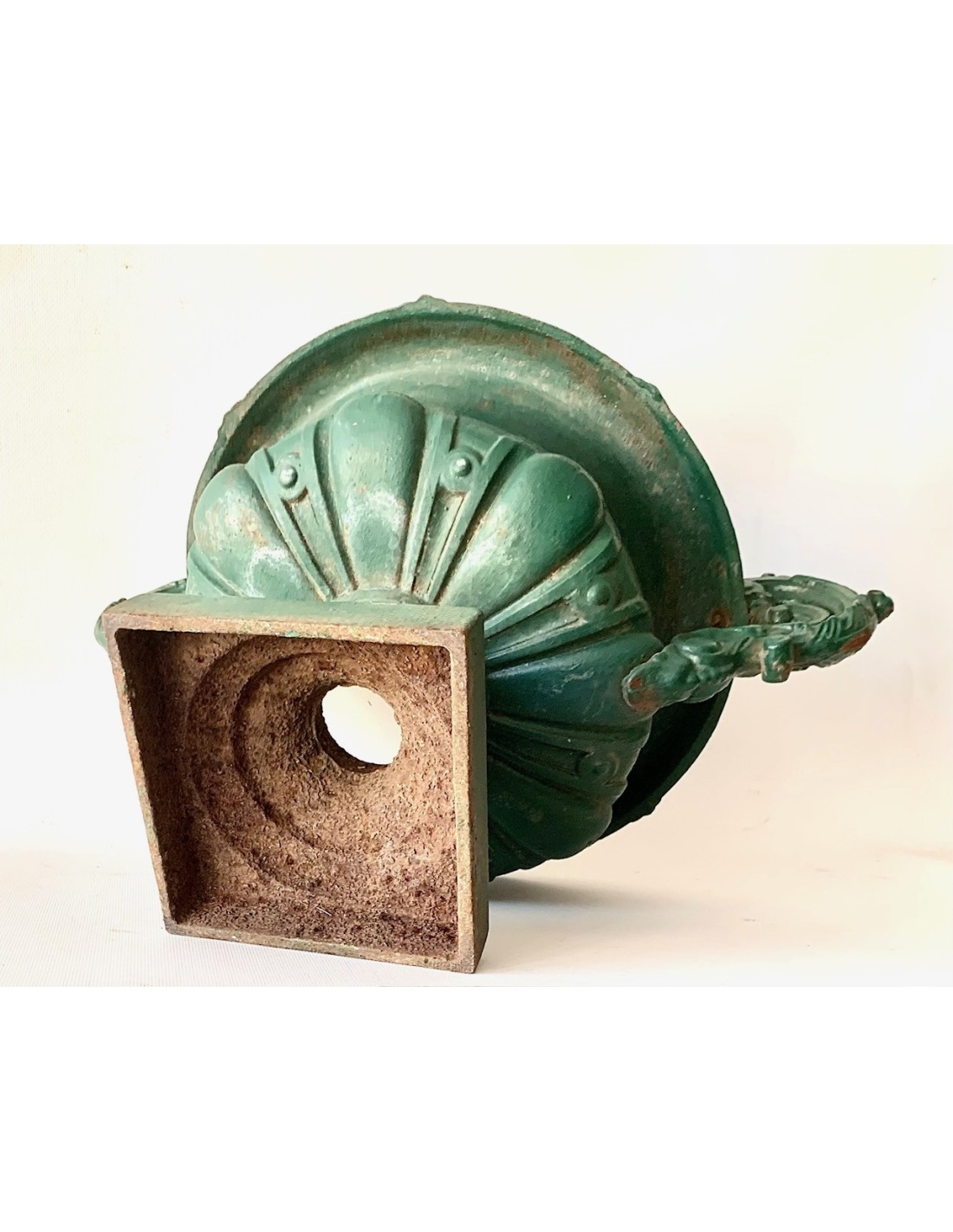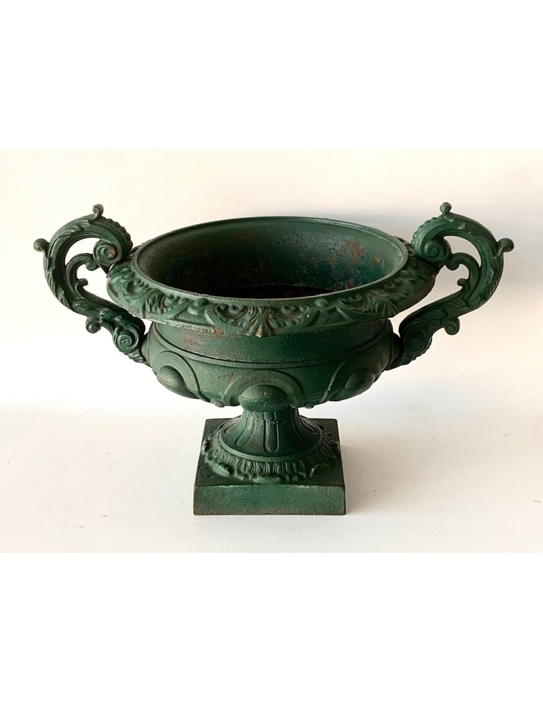 Pareja de copas de hierro de fundición, esmalte original verde, principios del siglo XX (1900-1920 circa), algún punto de oxido en el interior de las copas, normal ya que eran piezas expuestas al exterior, se adaptan perfectamente en decoraciones de interior encima de cómodas, consolas o columnas.