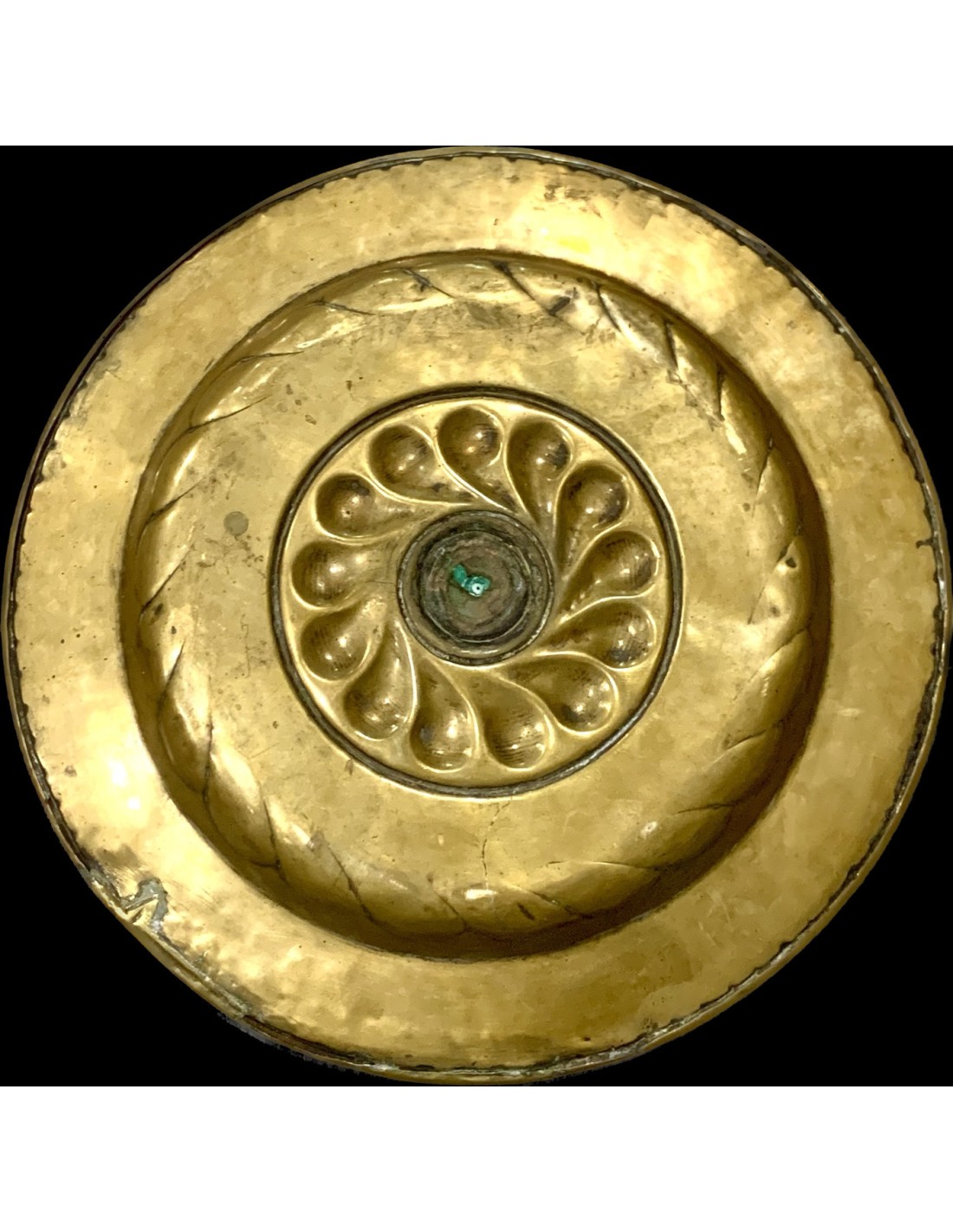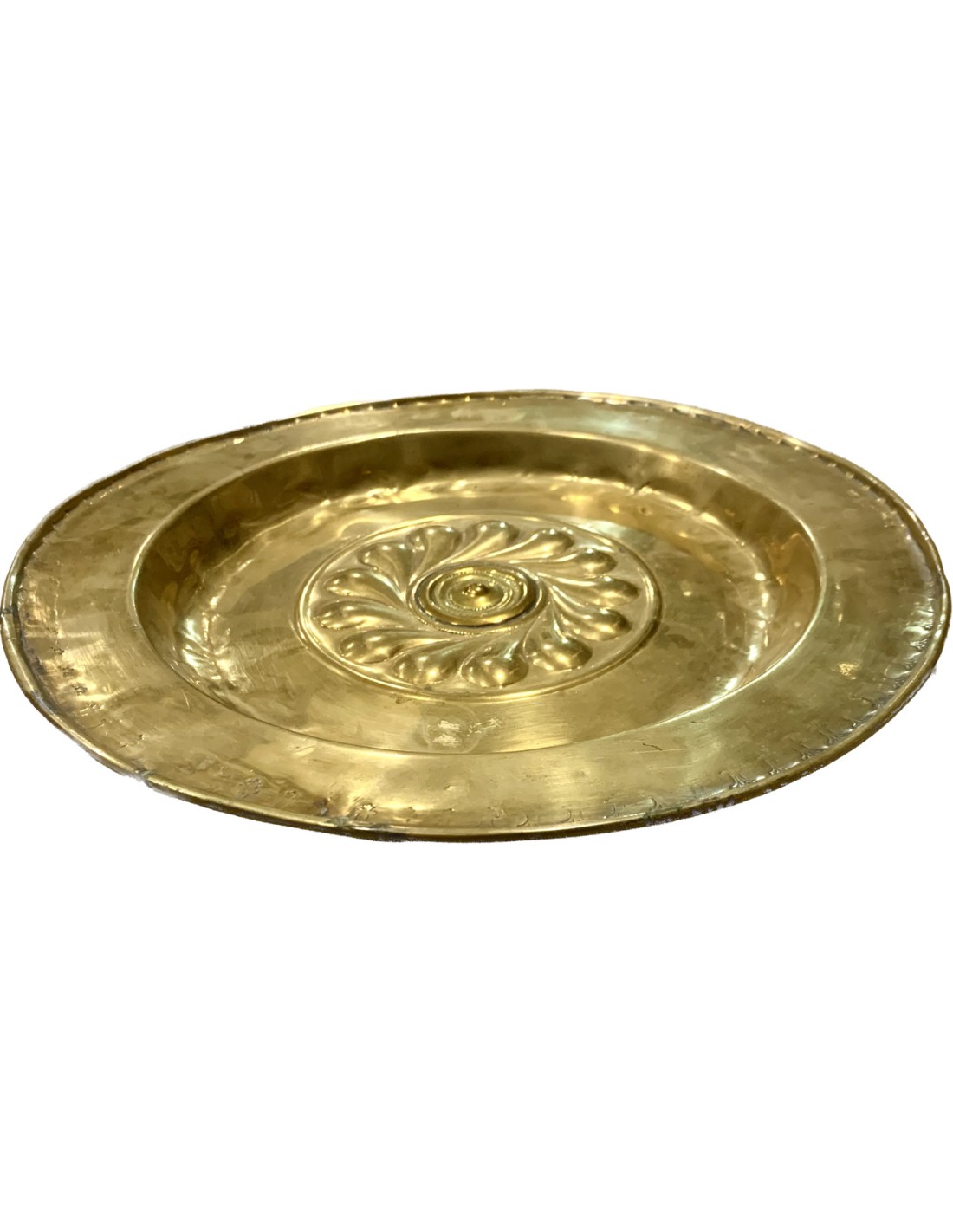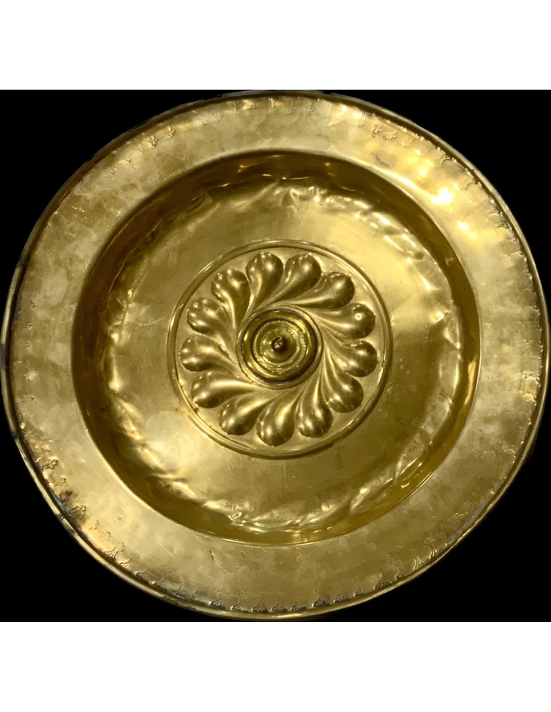 Plato petitorio o limosnero del siglo XVII, manufactura de origen centro nord europea, latón repujado en el margen perimetral, rosetón central en alto relieve, algunos pequeños puntos de antiguas soldaduras pero en general buen estado de conservación.