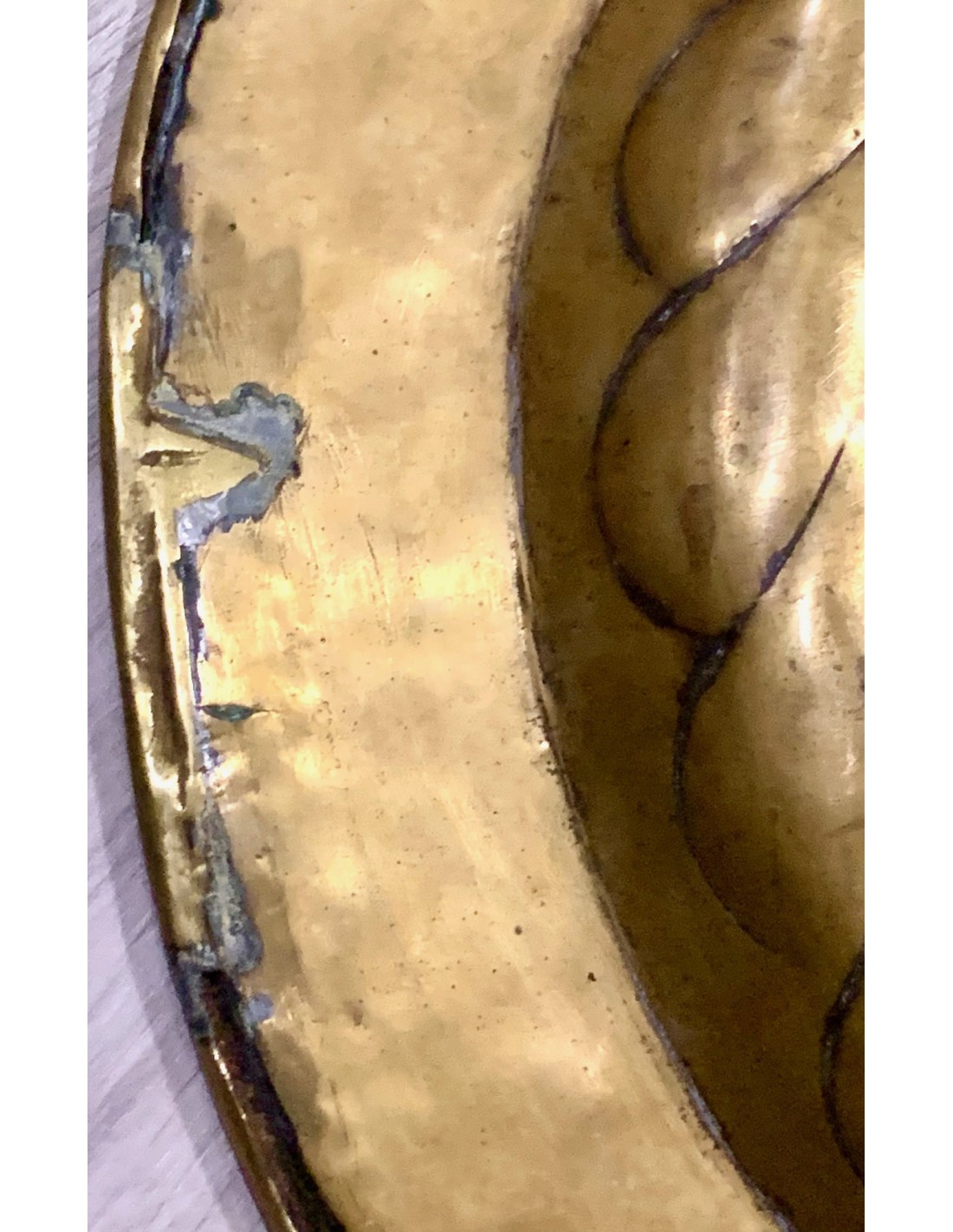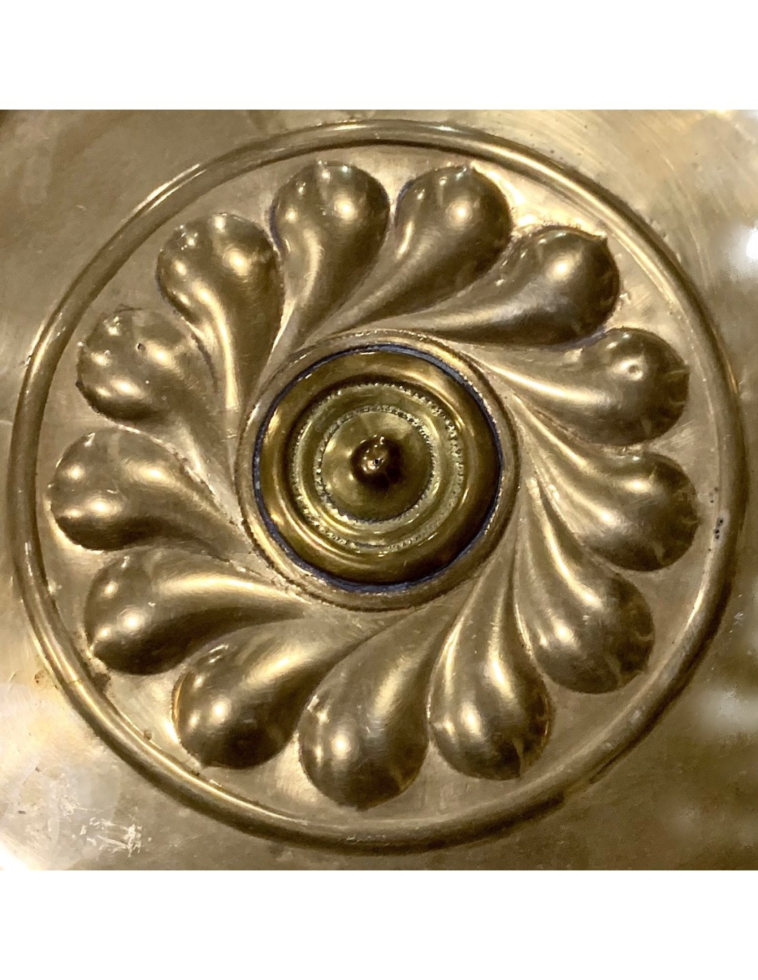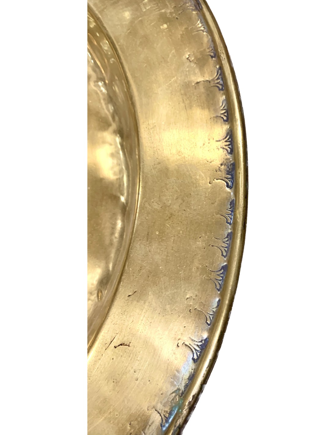 Plato petitorio o limosnero del siglo XVII, manufactura de origen centro nord europea, latón repujado en el margen perimetral, rosetón central en alto relieve, algunos pequeños puntos de antiguas soldaduras pero en general buen estado de conservación.