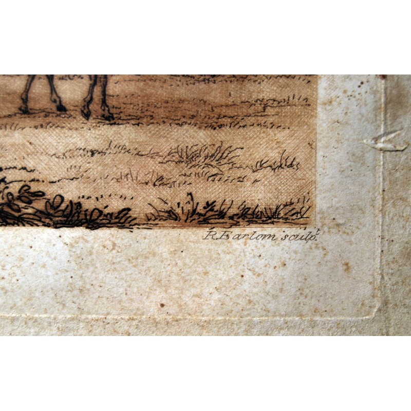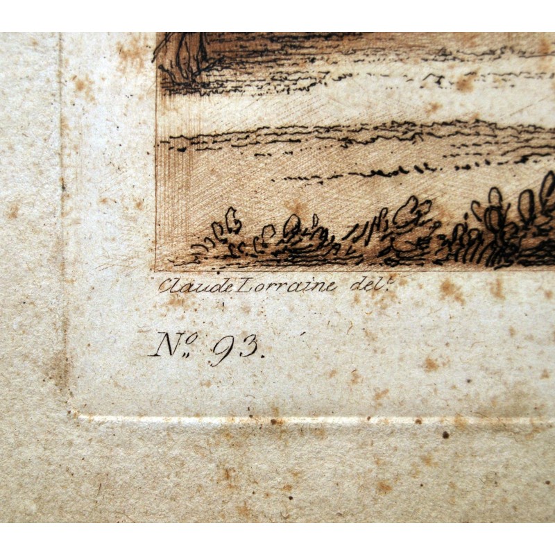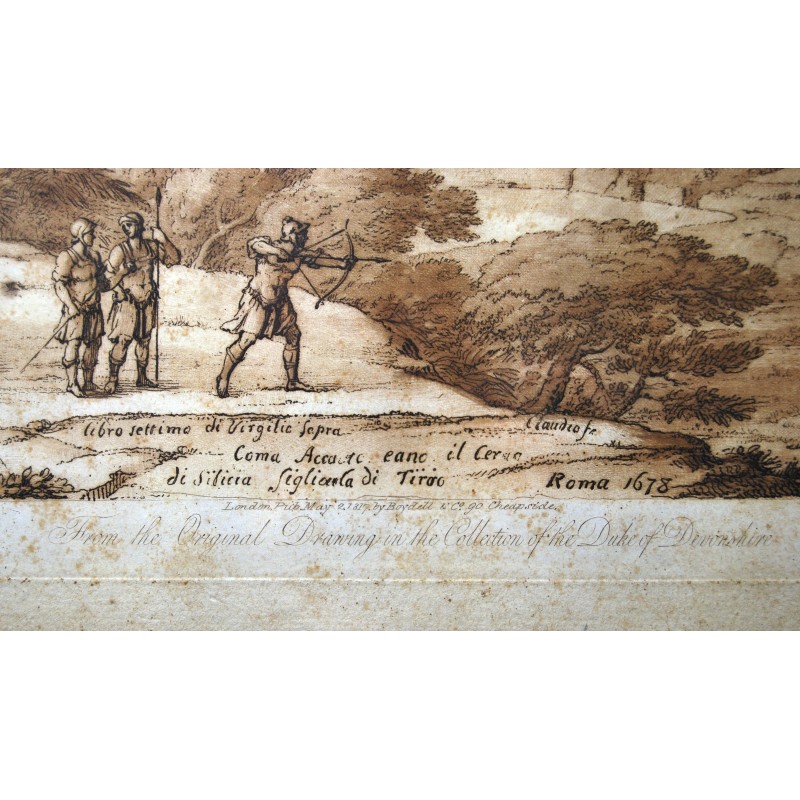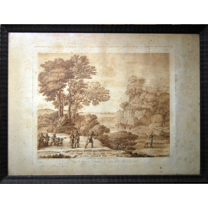 Grabado inglés de principio del siglo XIX (fechado el año de publicación 2 de mayo de 1817), “Ascanio dispara al ciervo de Silvia” (Eneida libro séptimo de Virgilio) desde el dibujo original de Claude Lorraine propiedad de la colección del duque de Devonshire. Buena conservación algunas leves y pequeñas manchas, marco original de la época.