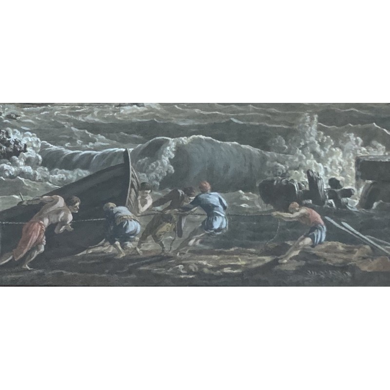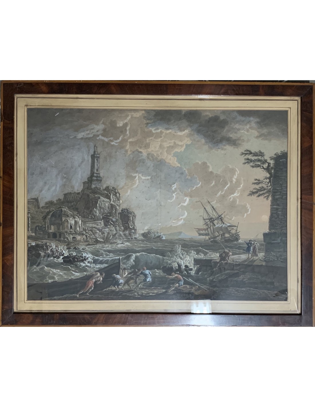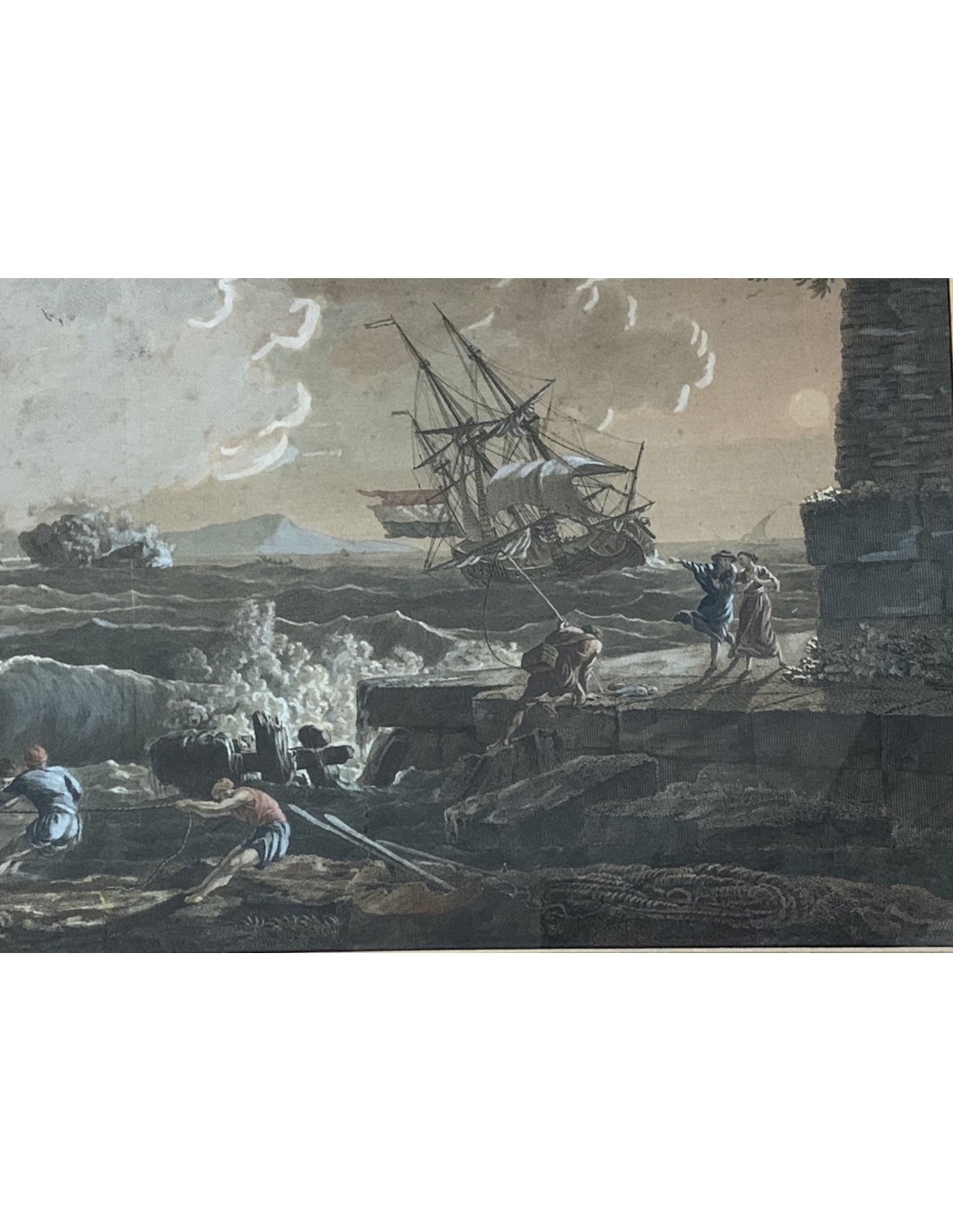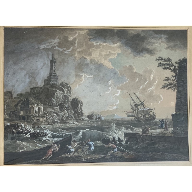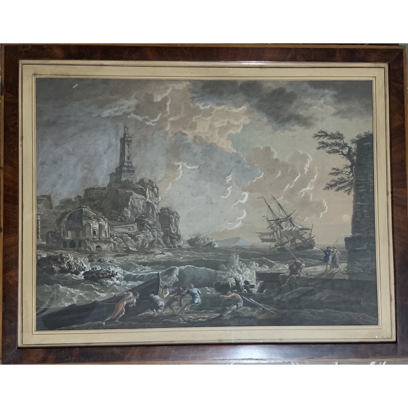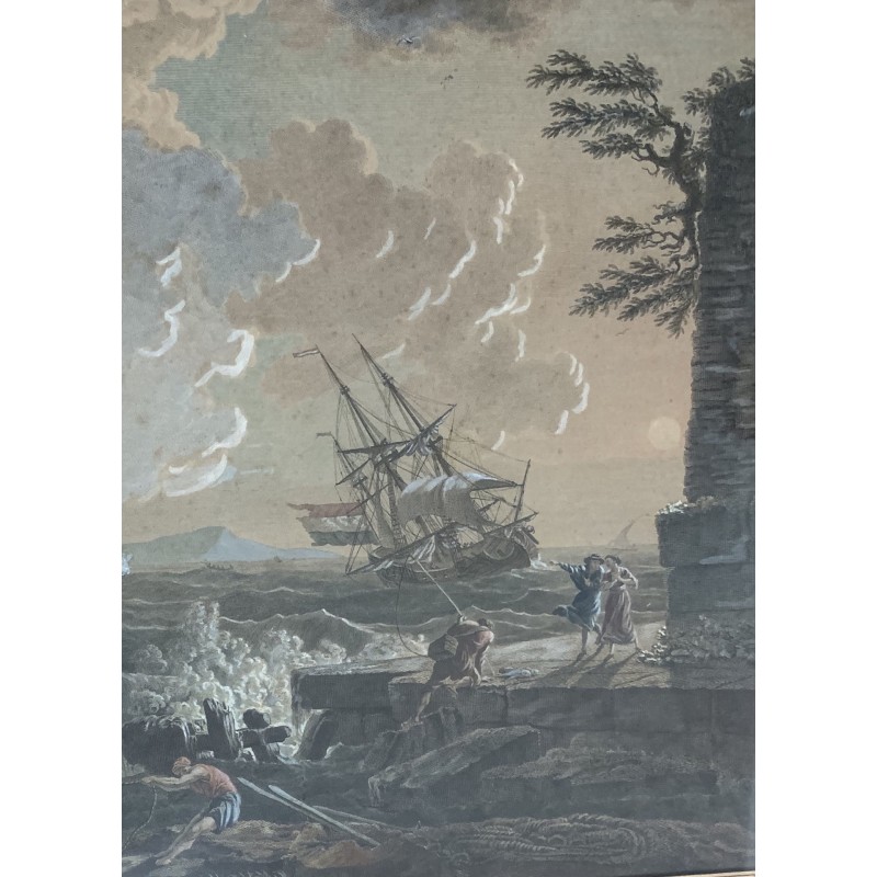 “Naufragio a puerto” grabado acuarelado de principios del siglo XIX, reproducido de una pintura de Claude Joseph Vernet de mitad del siglo XVIII, muy buena calidad, enmarcación coeva, algunos pequeños punto de oxidación del papel pero en general muy buen estado de conservación.