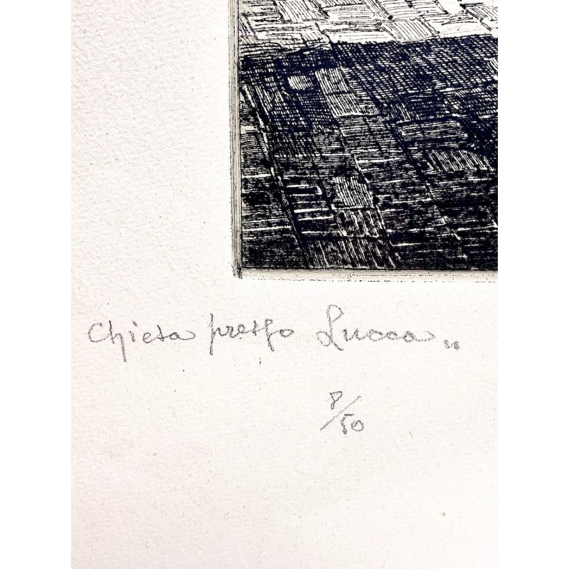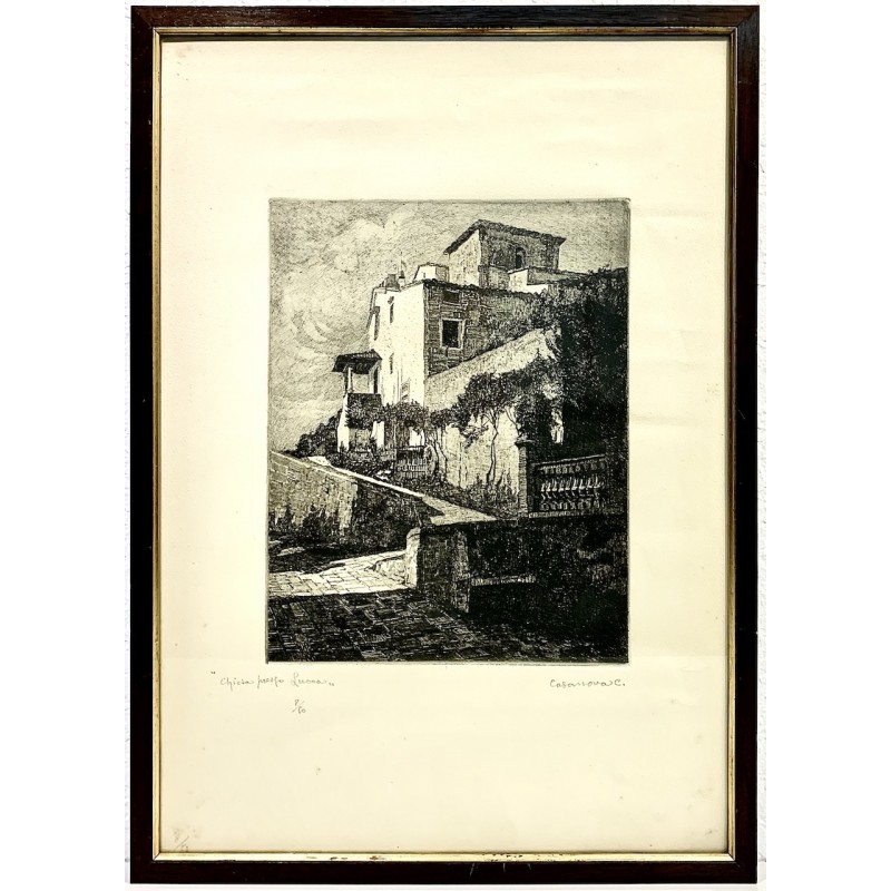 Aguafuerte del pintor y grabador italiano Carlo Casanova (Crema, 21 giugno 1871 – Quarna Sotto, 11 maggio 1950). “Iglesia cercana a Lucca” en la región de la Toscana, octavo ejemplar de 50, Firmado a lapis en la esquina inferior derecha, buen estado de conservación.