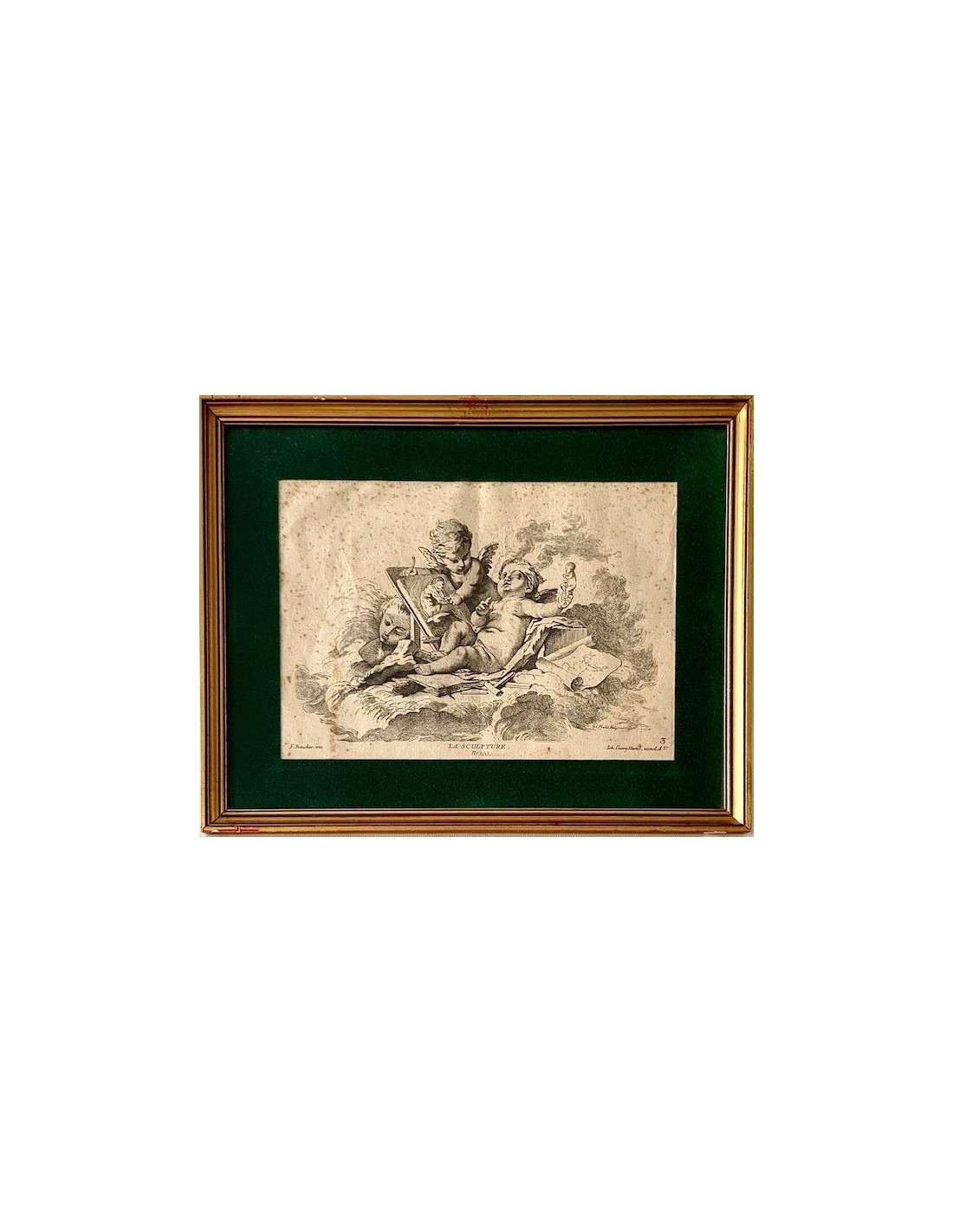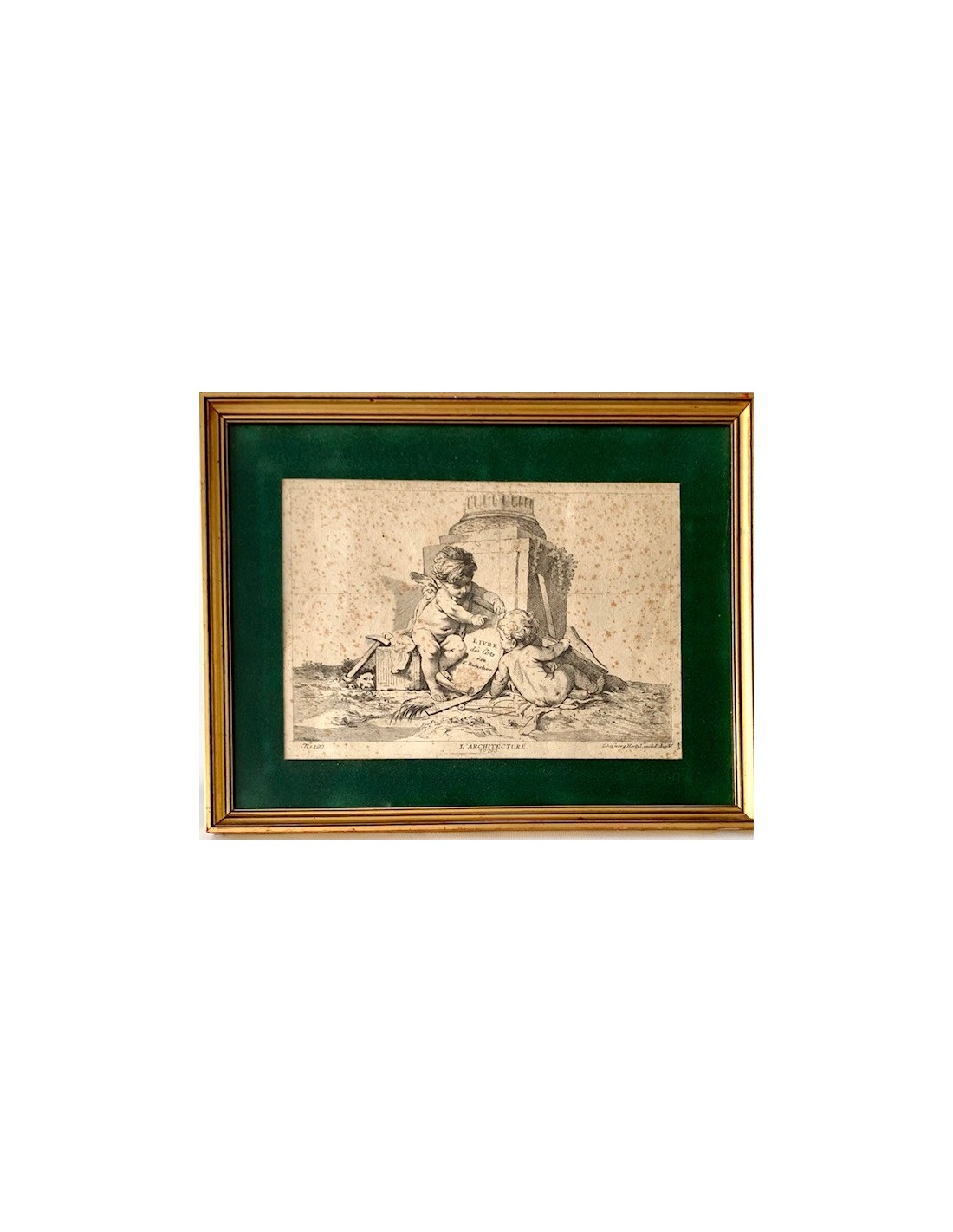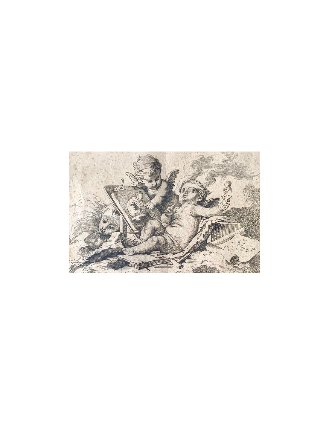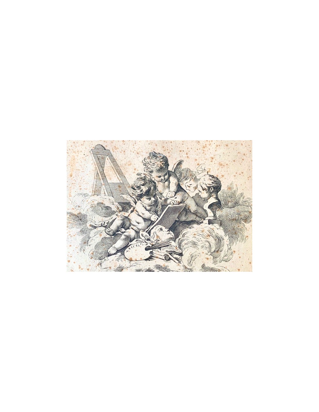 Grabados franceses de finales del siglo XVIII, alegoría de la arquitectura, la pintura y la escultura, ángeles con atributos de las tres artes, alguna pequeña mancha en el papel normal por la epoca, en general buen estado de conservación.
