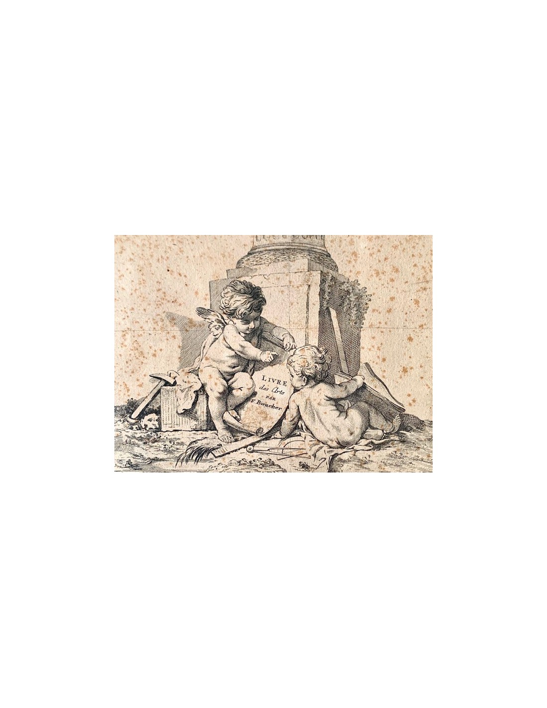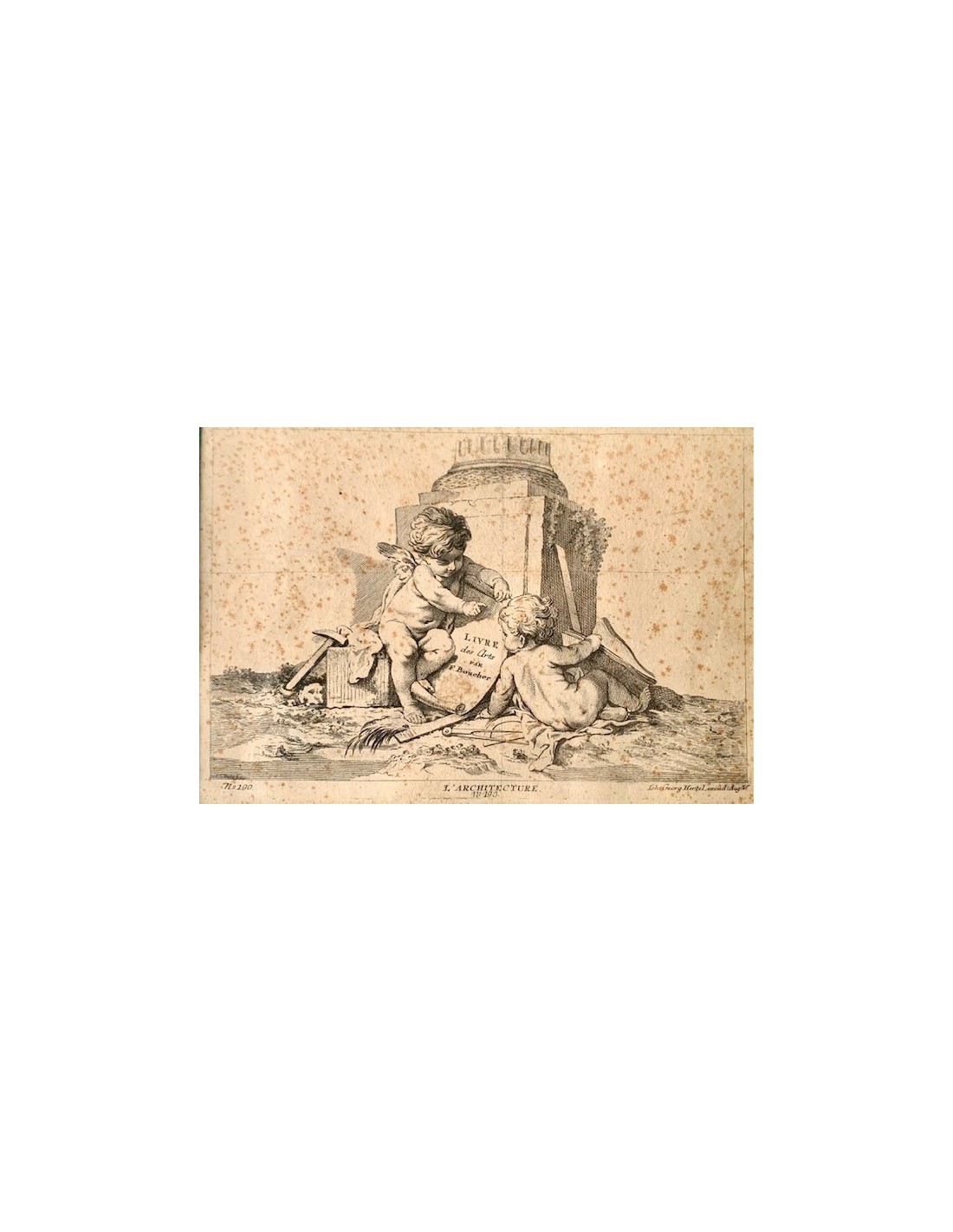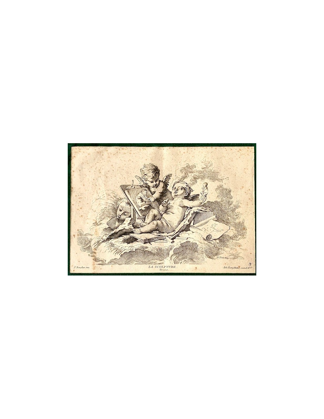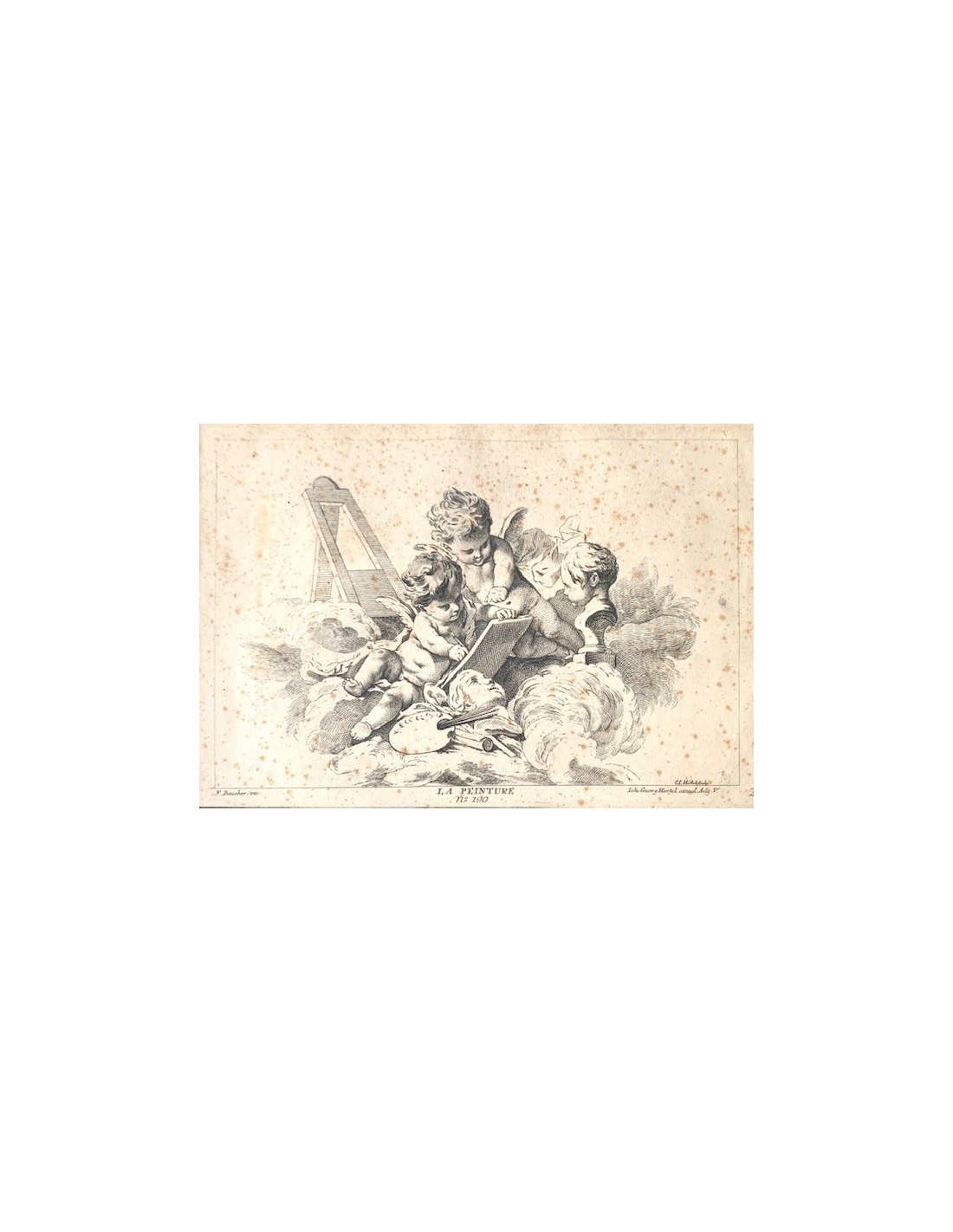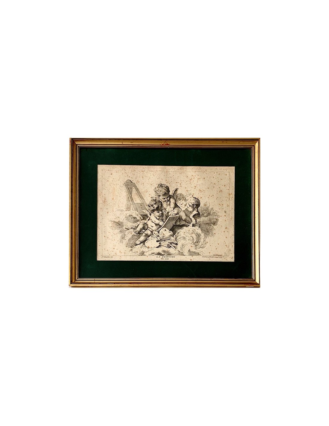 Grabados franceses de finales del siglo XVIII, alegoría de la arquitectura, la pintura y la escultura, ángeles con atributos de las tres artes, alguna pequeña mancha en el papel normal por la epoca, en general buen estado de conservación.