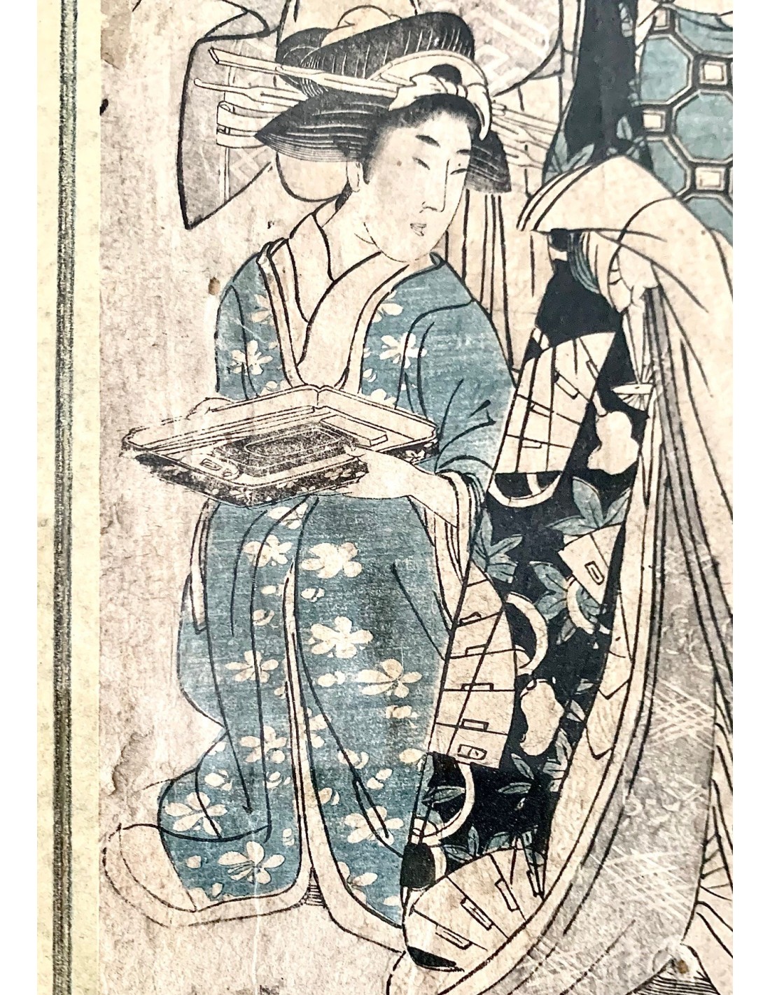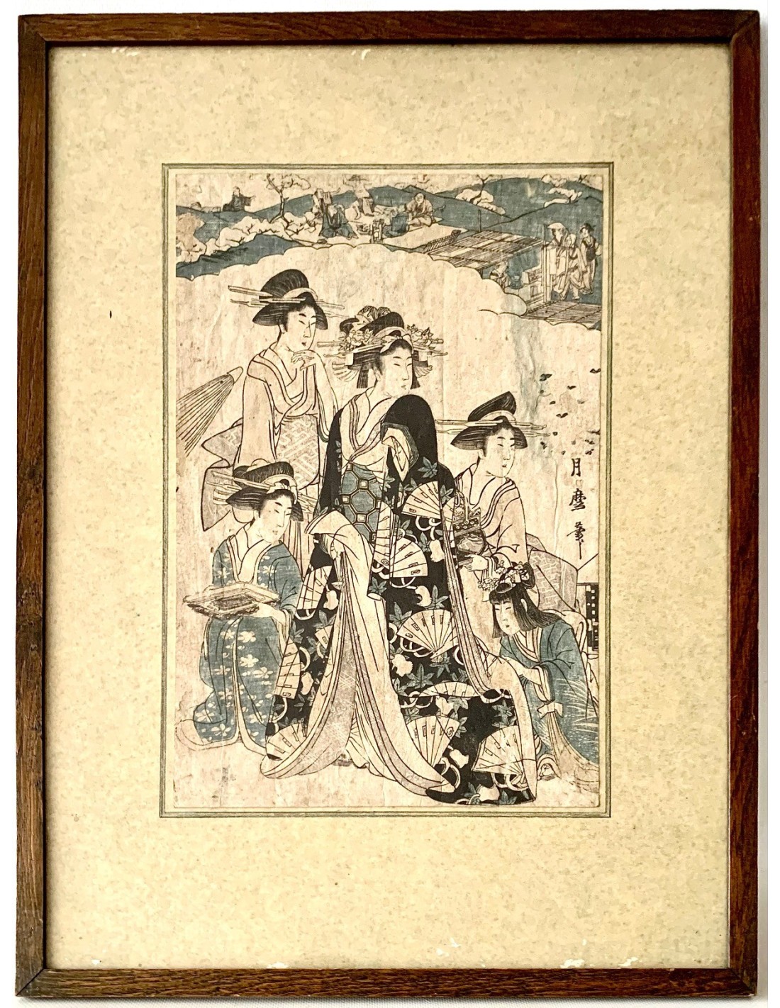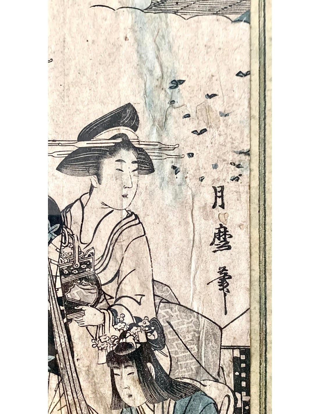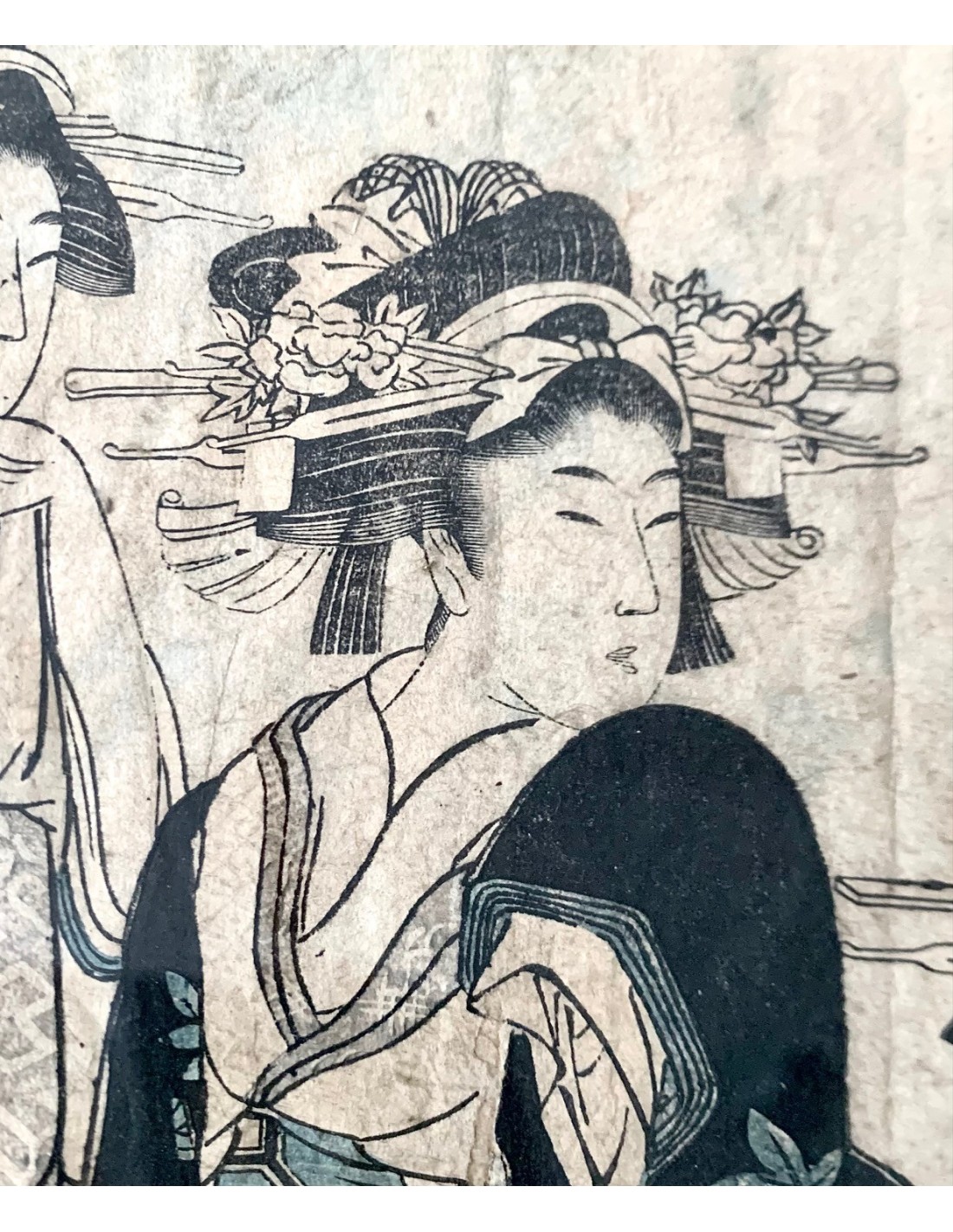 Kitagawa Tsukimaro (Japón 1794–1836) “ Geishas” artista japonés especializado en ukiyo-e, grabados xilograficos. Fue uno de los alumnos más exitosos de Kitagawa Utamaro. Ligeros pliegues del papel pero en buen estado de conservación general.