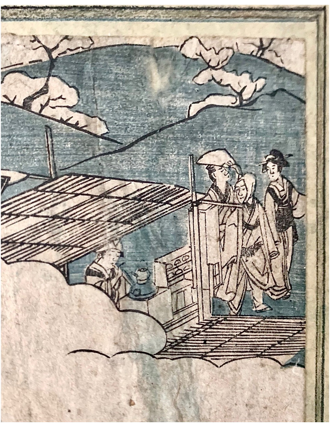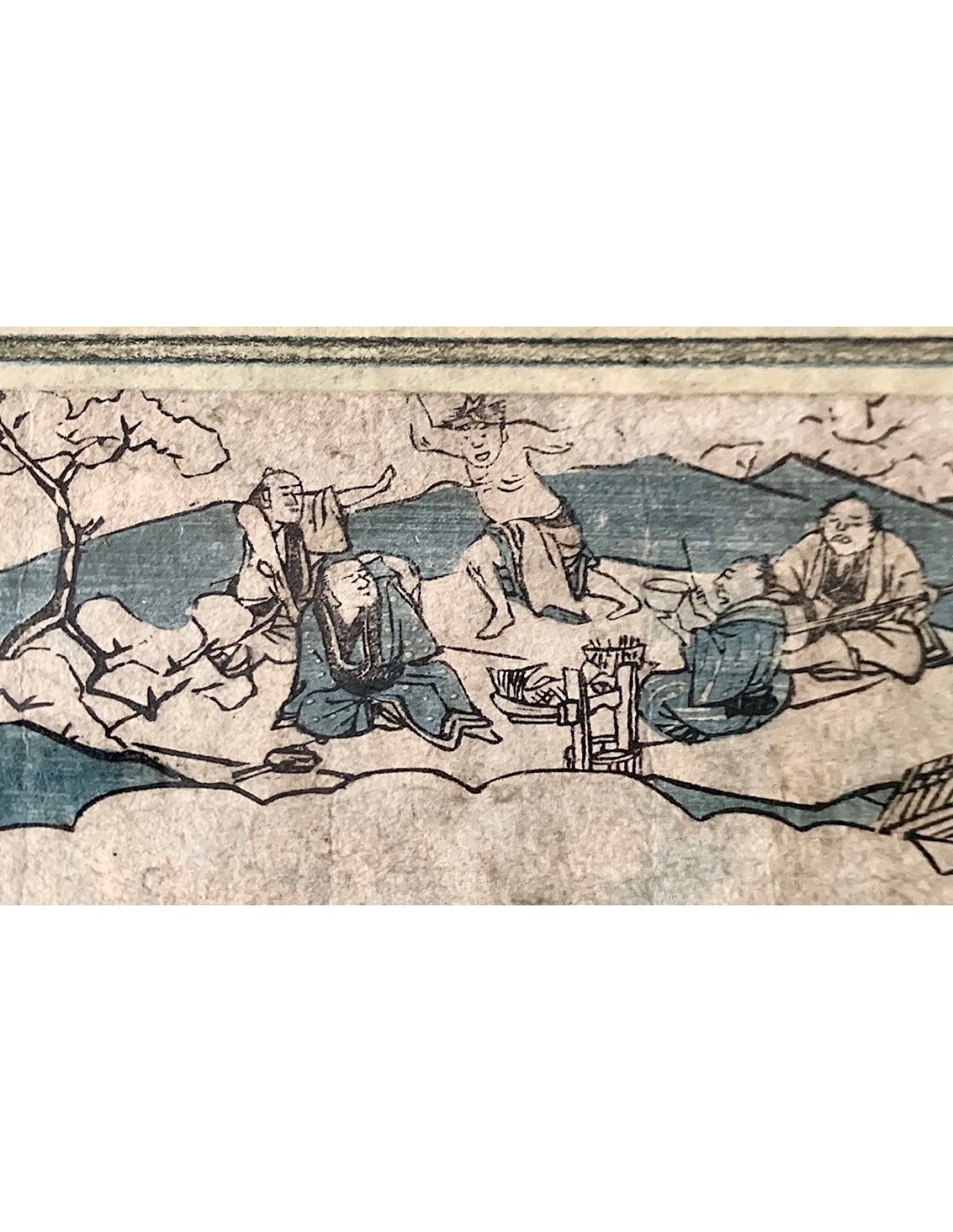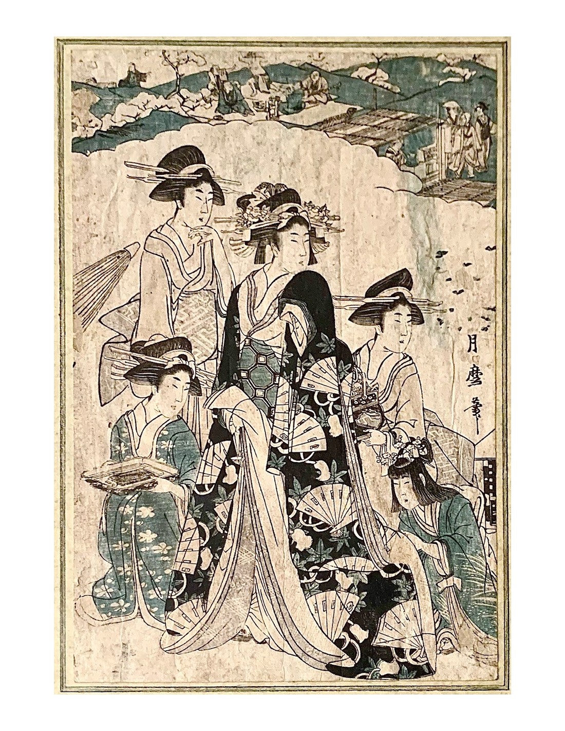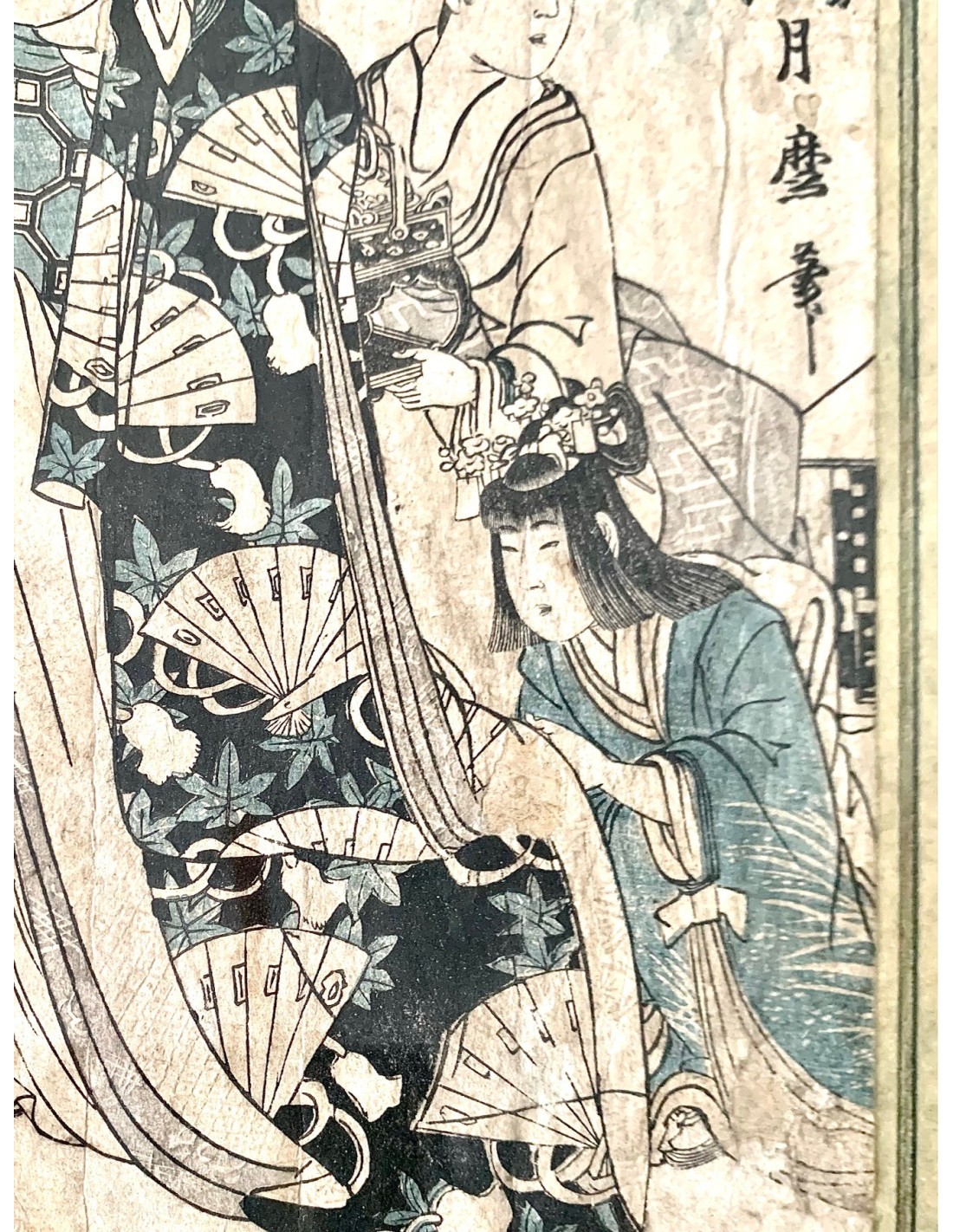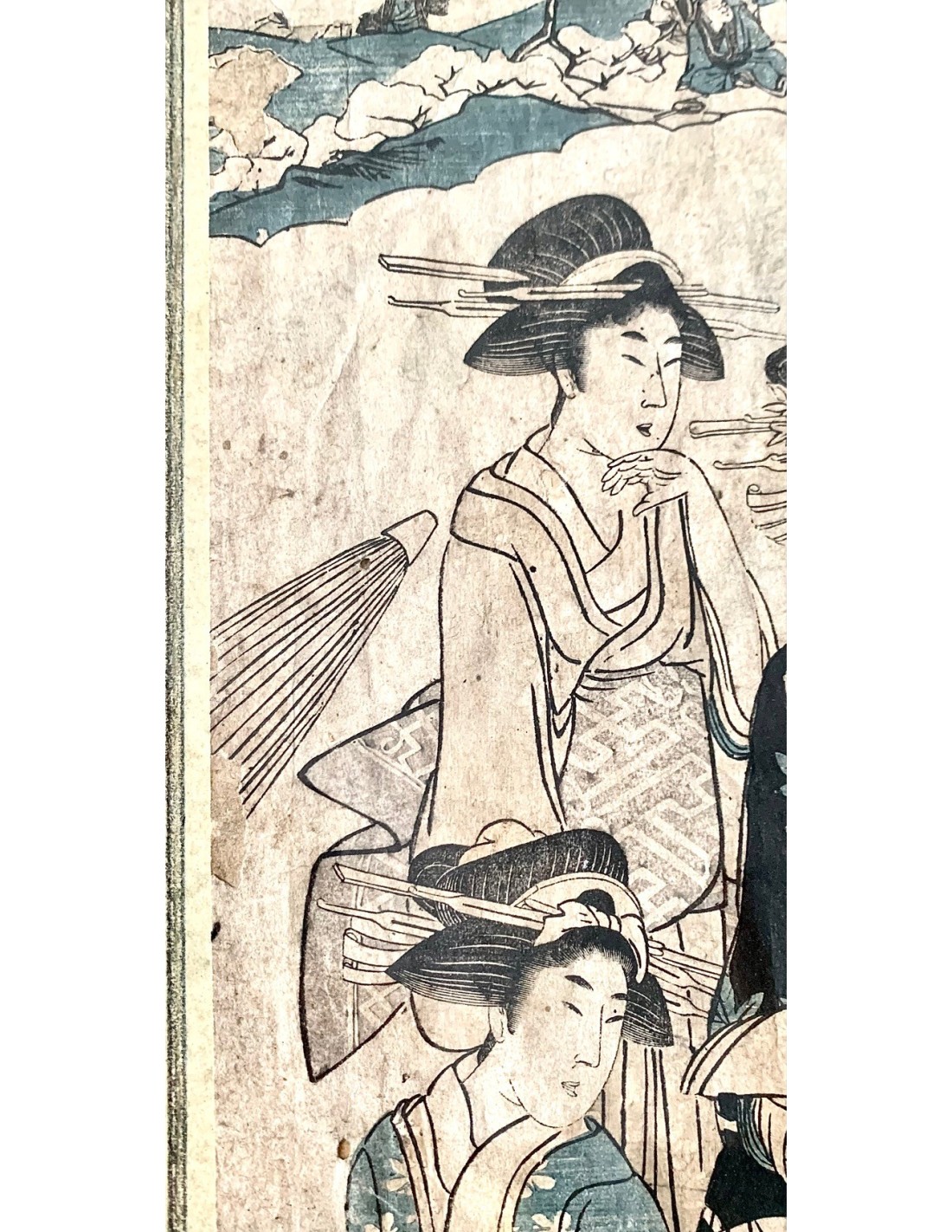 Kitagawa Tsukimaro (Japón 1794–1836) “ Geishas” artista japonés especializado en ukiyo-e, grabados xilograficos. Fue uno de los alumnos más exitosos de Kitagawa Utamaro. Ligeros pliegues del papel pero en buen estado de conservación general.