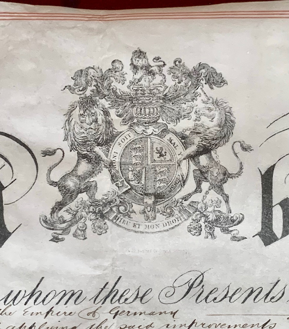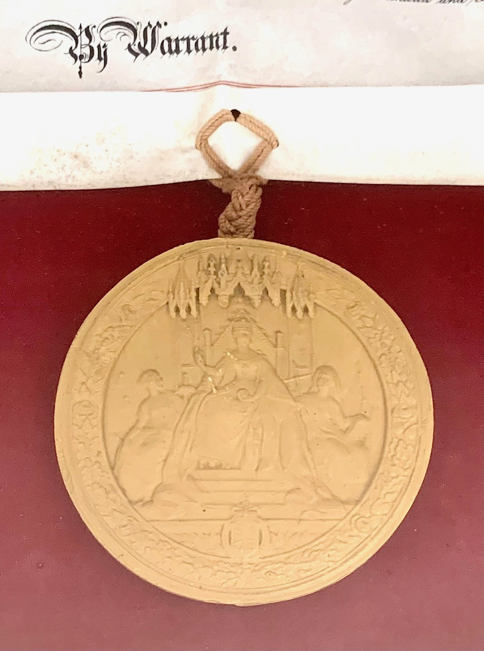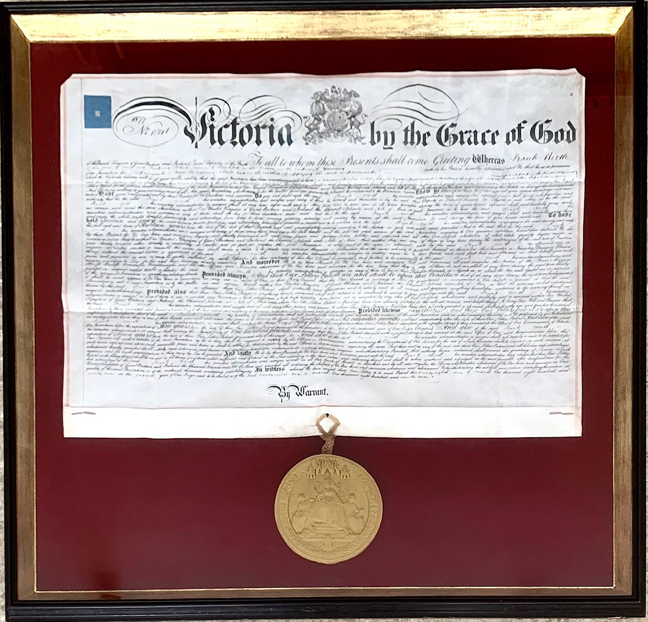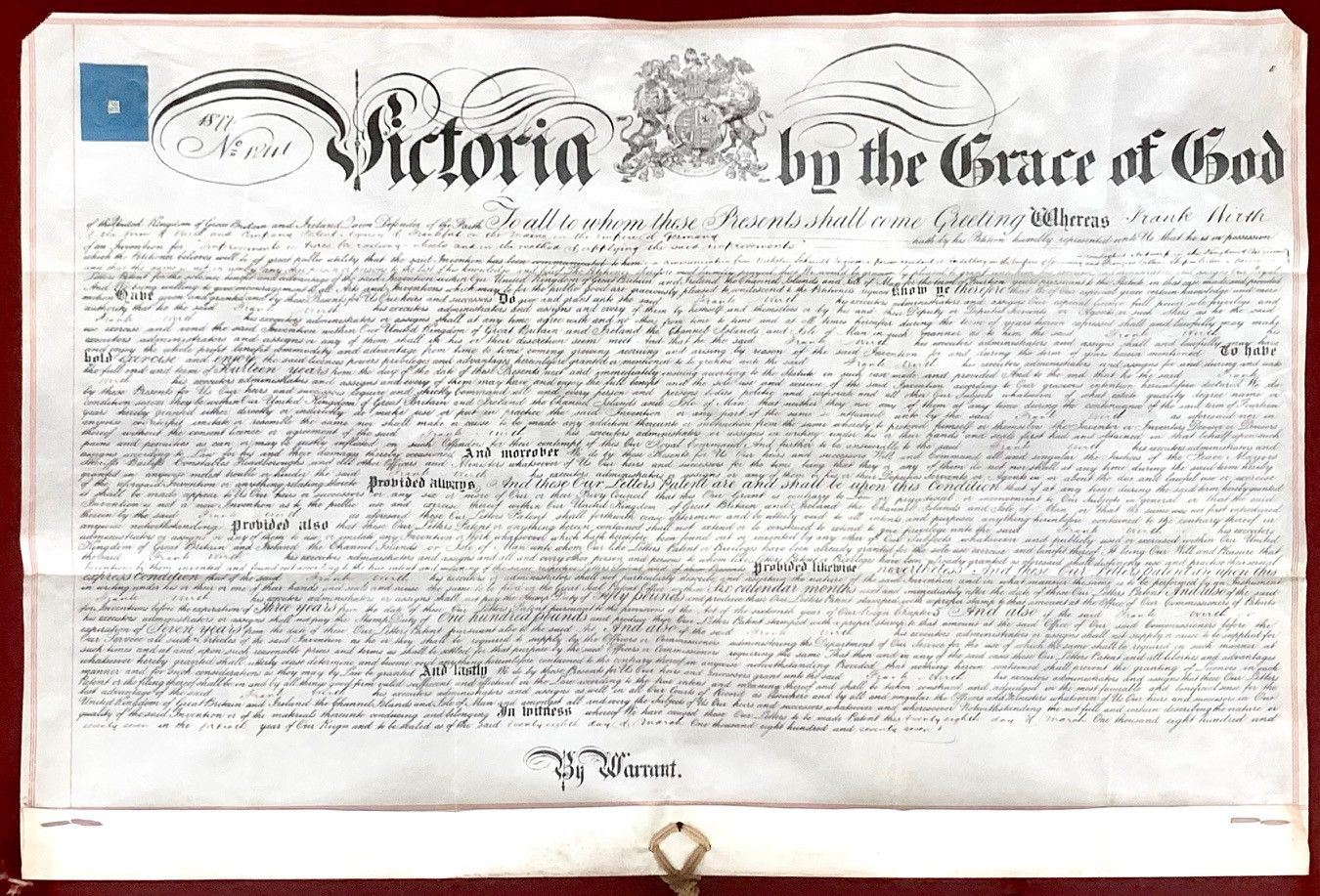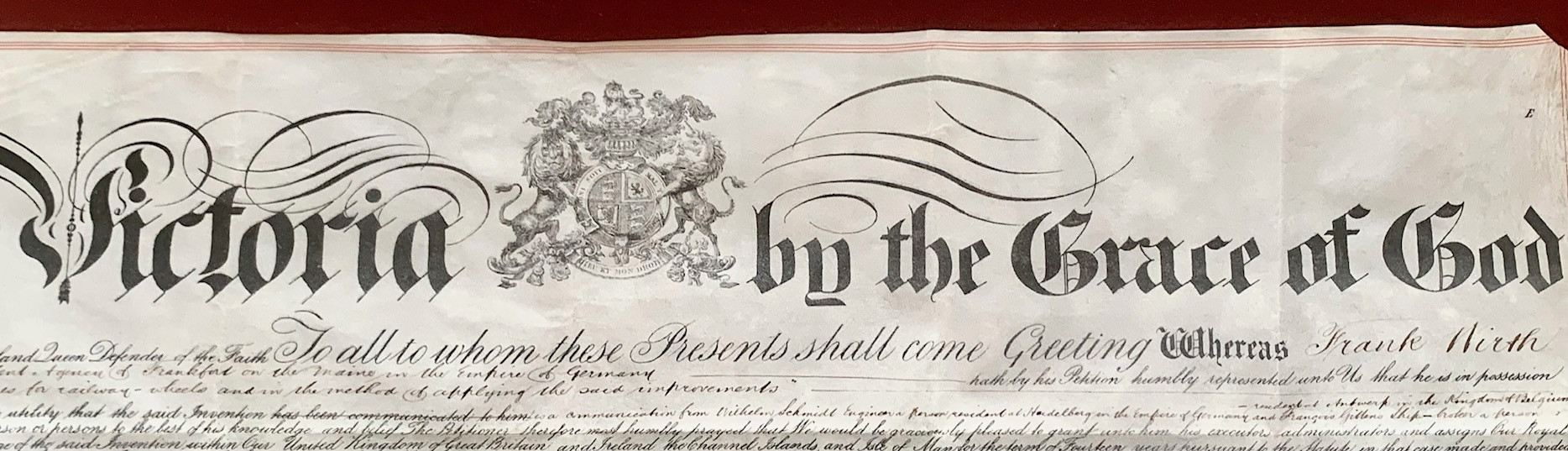 Documento impreso y manuscrito en pergamino y en la zona inferior con un gran sello de lacre amarillo ocre que representa a la Reina Victoria de Inglaterra sentada en el trono. Documento de patente número 1.241. Patente otorgada al señor Frank Wirth, de la compañía alemana de Frankfurt. La patente otorgada para proyectos de mejora, progreso y perfeccionamiento en el sector ferroviario de Reino Unido. Buen estado de conservación.