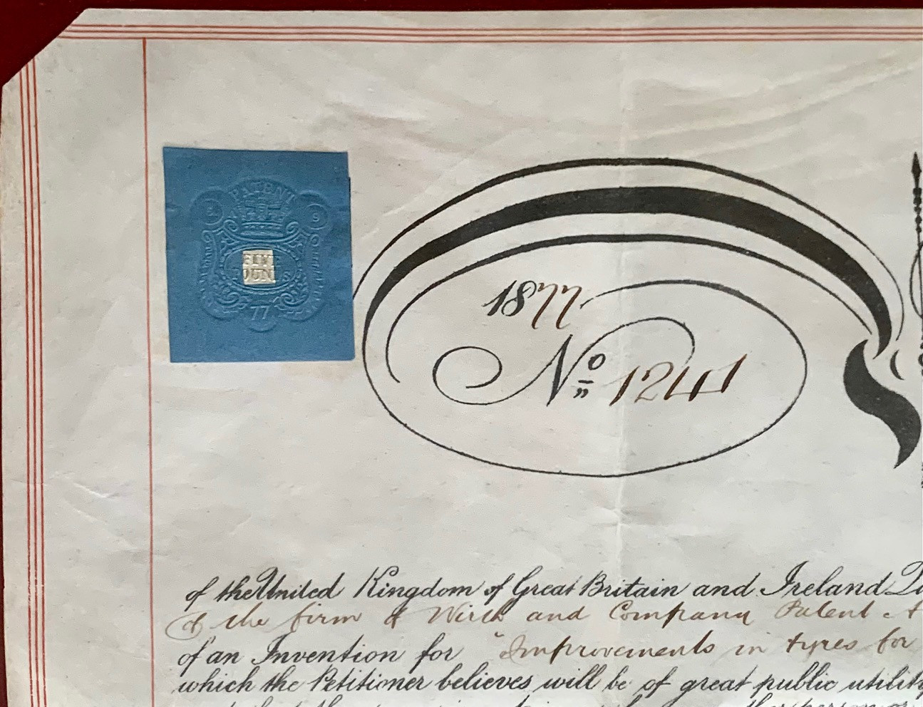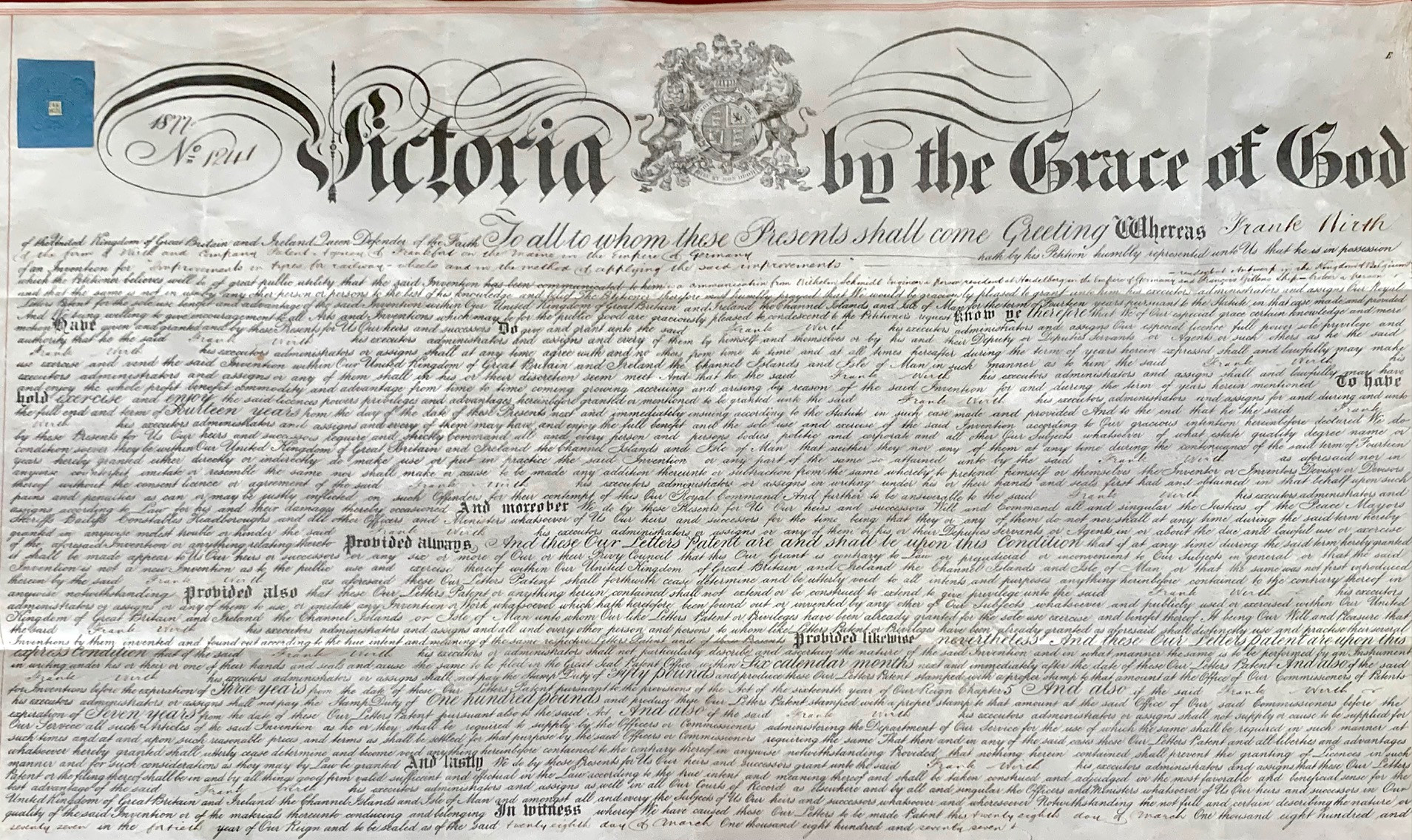 Documento de patente, Ferrocarril. Inglaterra año 1877.