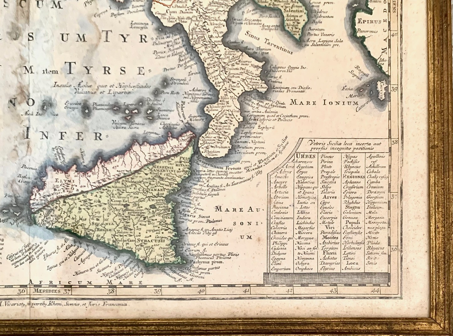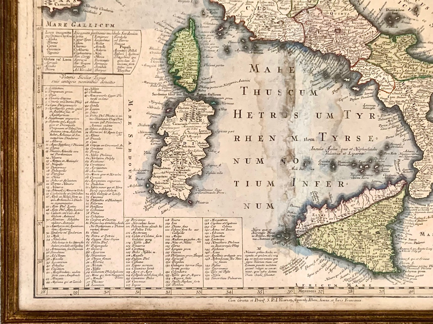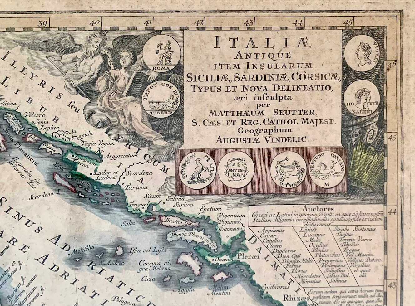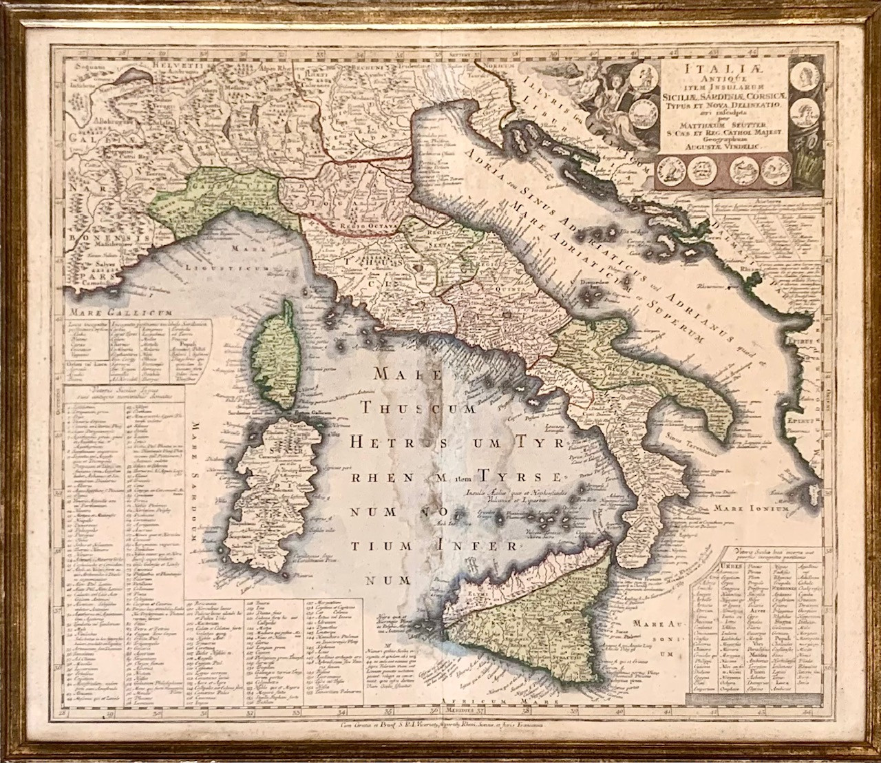 Mapa geografico de Italia, principios del siglo XVIII, grabado acuarelado, realizado por el cartografo alemán Matthäus Seutter (Augsburg, 20 settembre1678 – marzo1757). Alguna pequeña mancha de humedad pero en buen estado de conservación general.