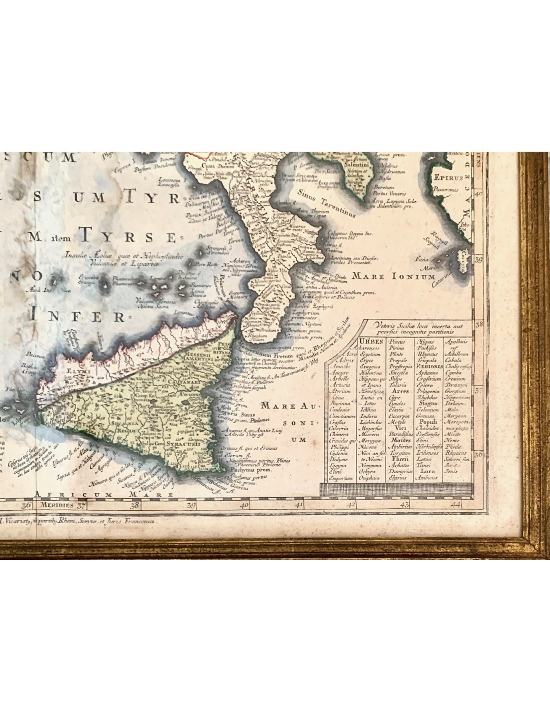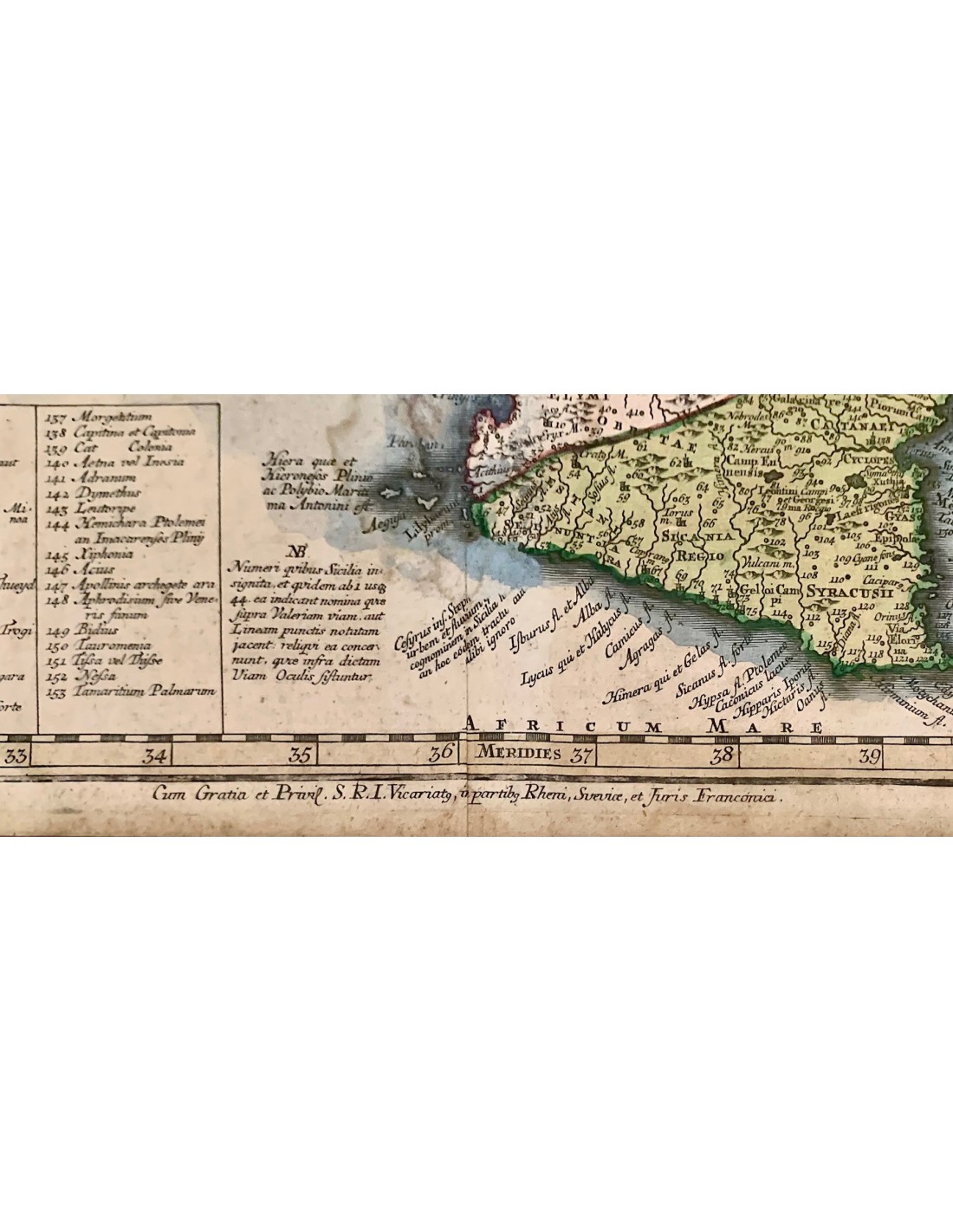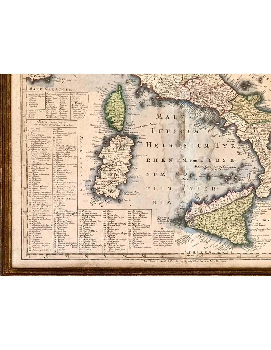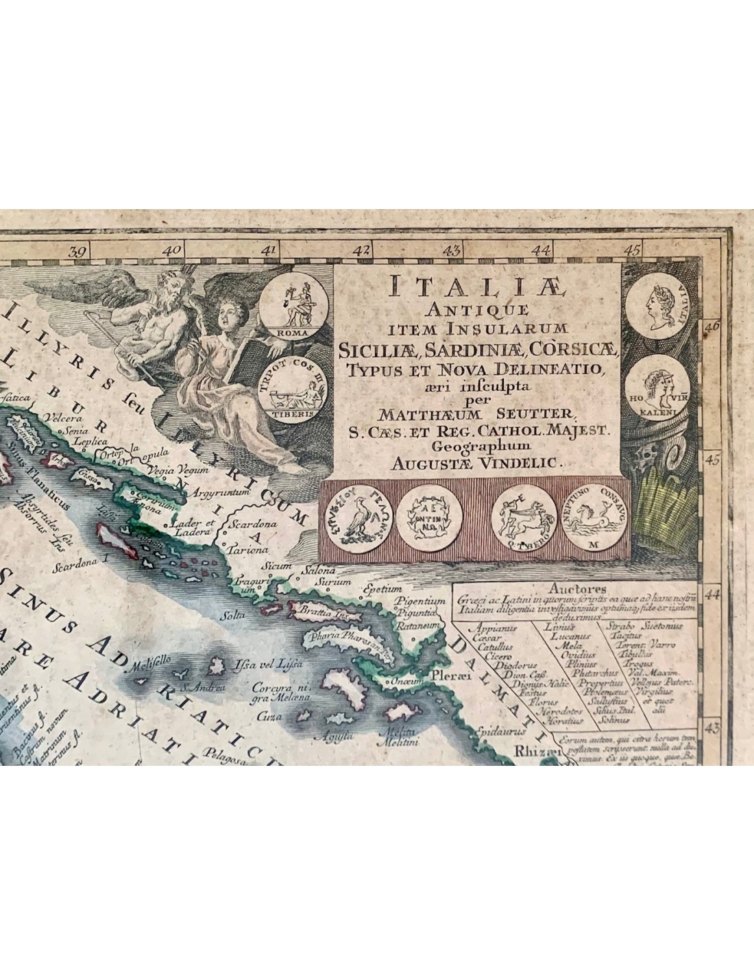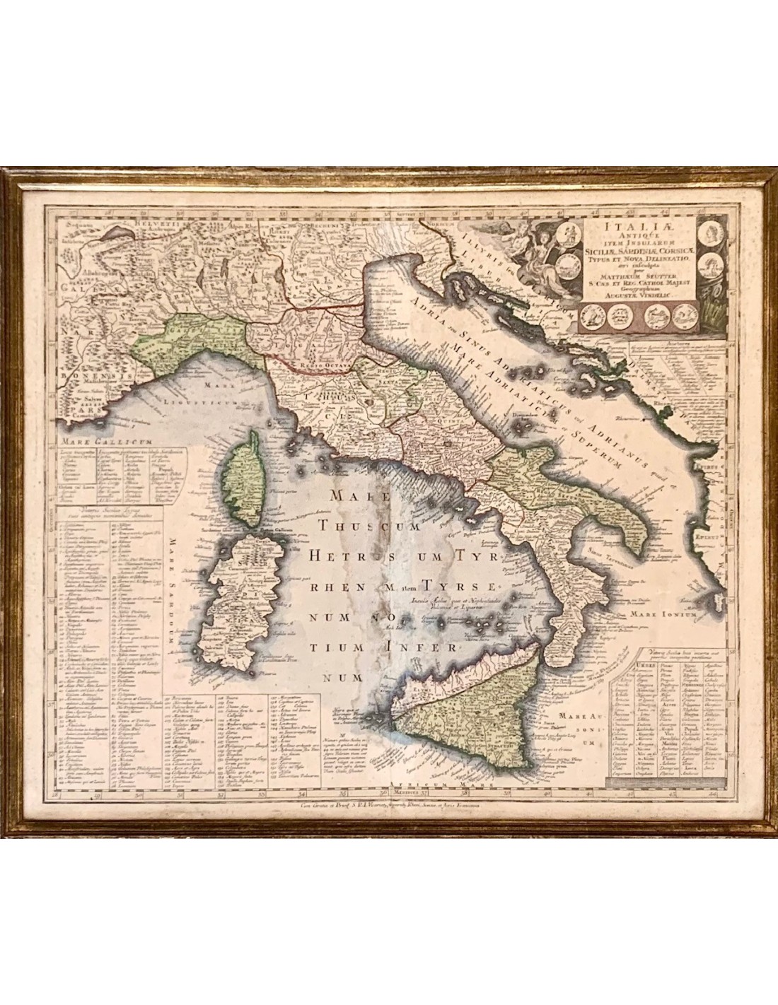 Mapa geografico de Italia, principios del siglo XVIII, grabado acuarelado, realizado por el cartografo alemán Matthäus Seutter (Augsburg, 20 settembre 1678 – marzo 1757). Alguna pequeña mancha de humedad pero en buen estado de conservación general.