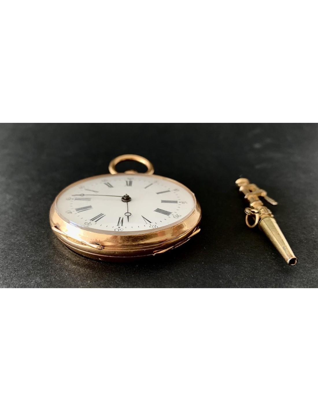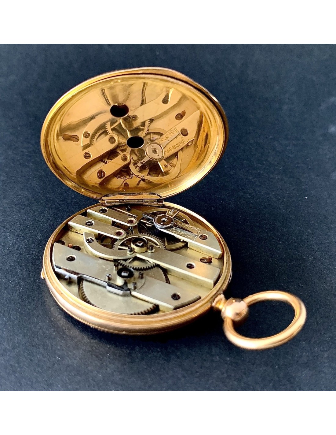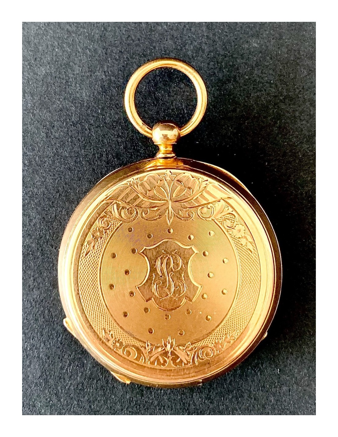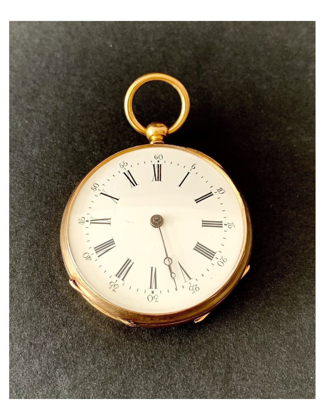 Reloj de bolsillo de oro de 18K, contraste con cabeza de caballo, Francia primera mitad del siglo XIX (1930-1950). Carga con llave (llave de metal dorado), esfera con numero arábigos y romanos, dos tapas guarda polvo traseras de oro cinceladas, la exterior con iniciales G L, en estado de marcha, funciona perfectamente, muy buen estado general de conservación.