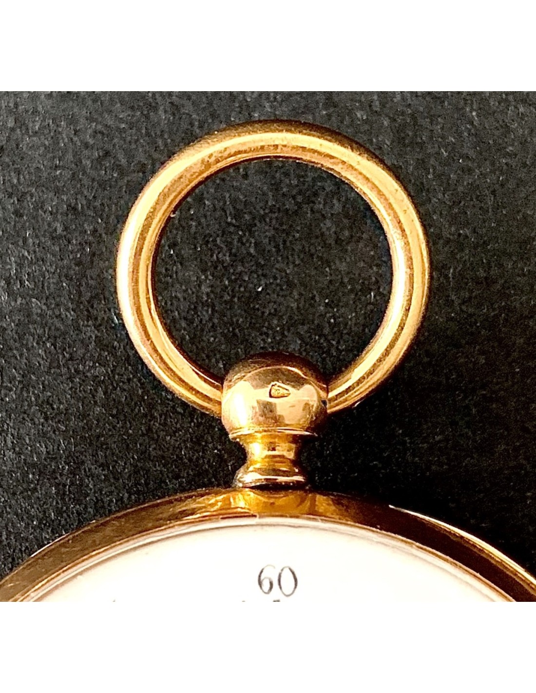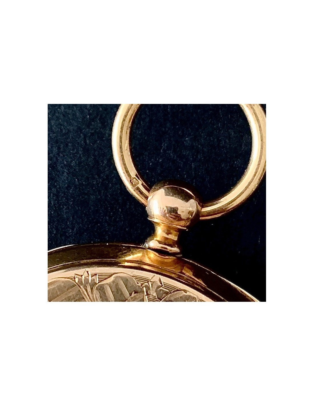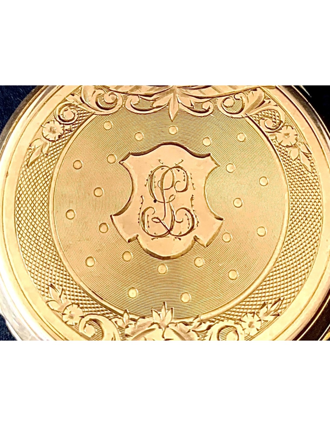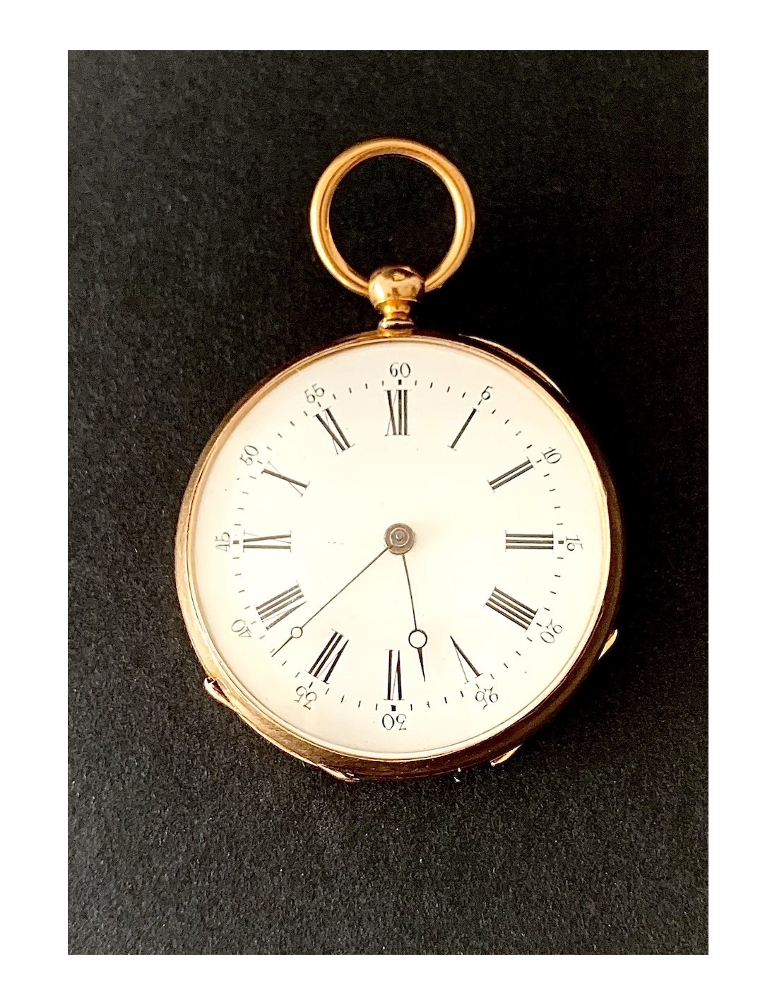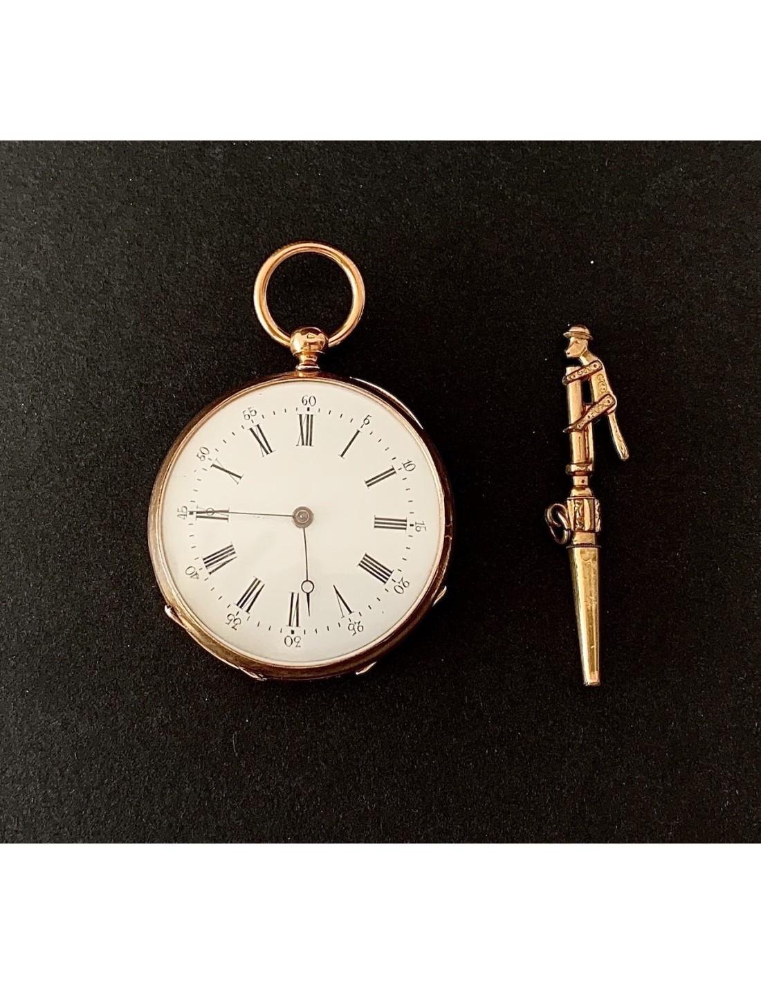 Reloj de bolsillo de oro de 18K, contraste con cabeza de caballo, Francia primera mitad del siglo XIX (1930-1950). Carga con llave (llave de metal dorado), esfera con numero arábigos y romanos, dos tapas guarda polvo traseras de oro cinceladas, la exterior con iniciales G L, en estado de marcha, funciona perfectamente, muy buen estado general de conservación.