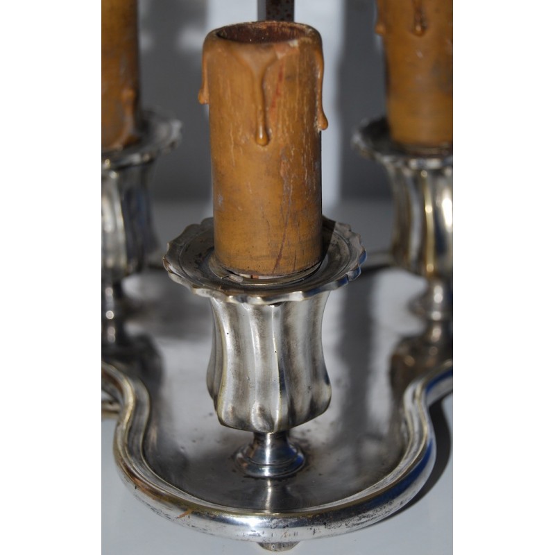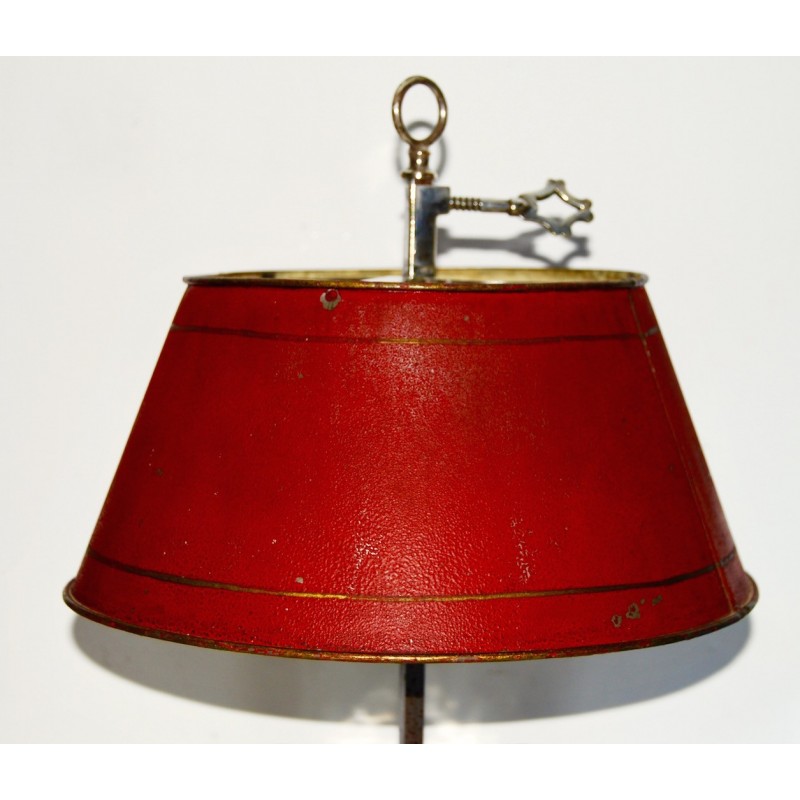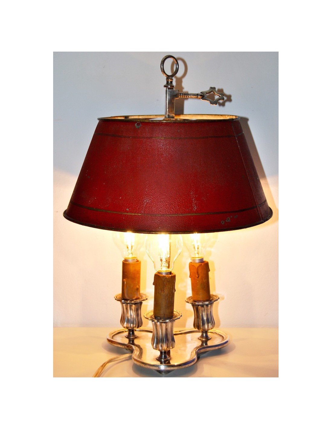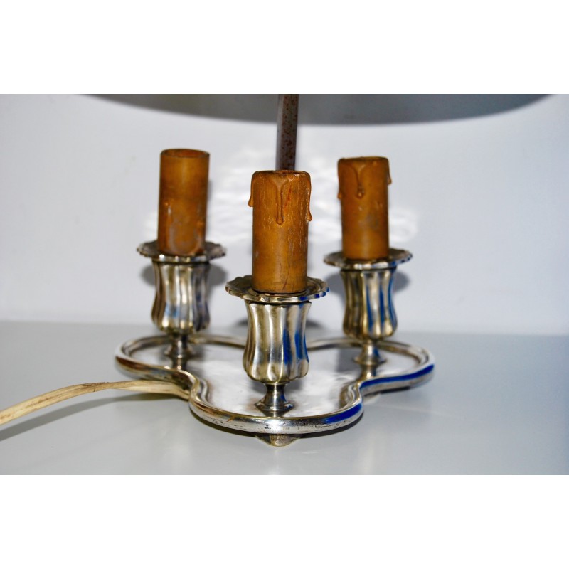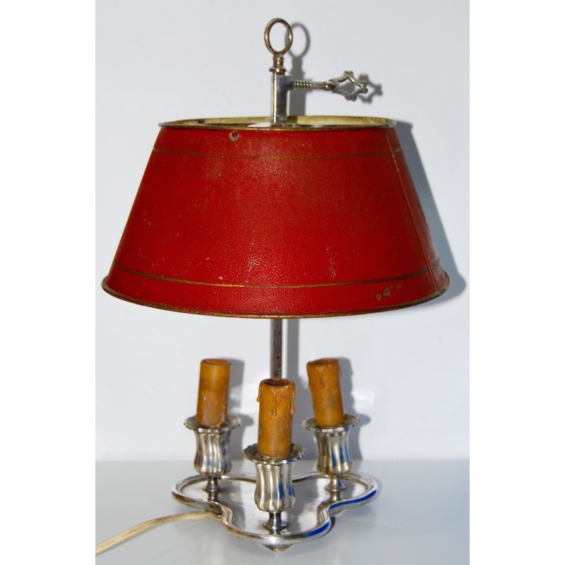 Antigua lampara bouillotte de mesa, metal plateado de tres luces, pantalla de metal esmaltada roja y bordes dorados regulable en altura, primeras décadas del siglo XX (1910-1920).