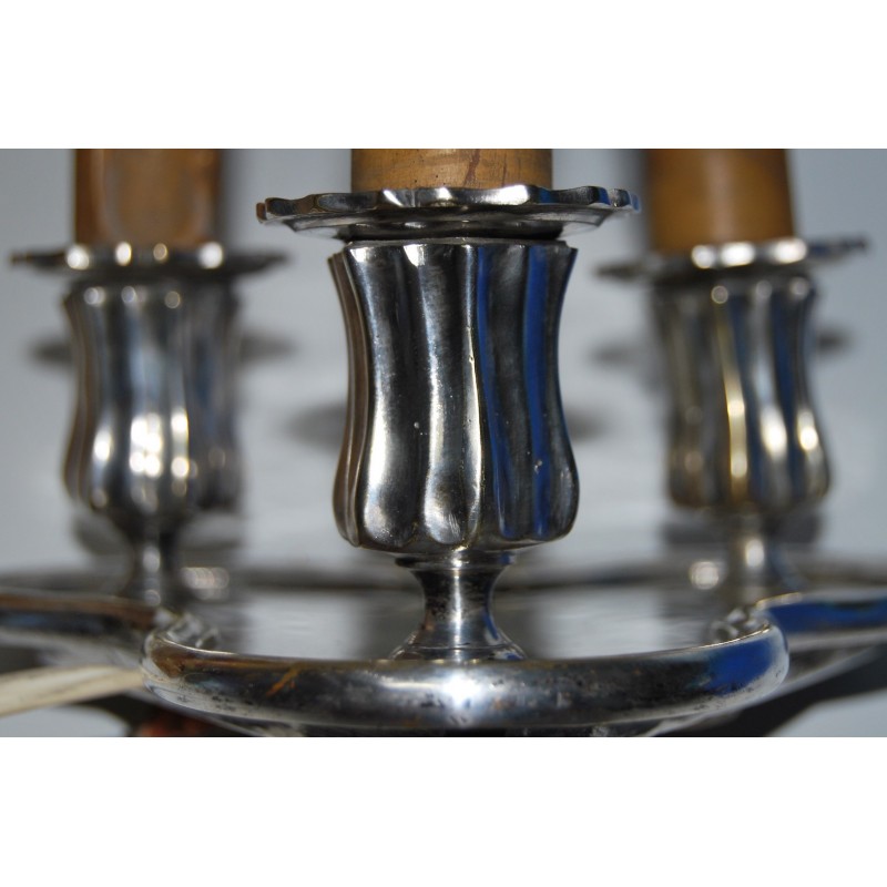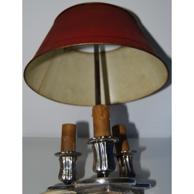 Lampara bouillotte de mesa, metal plateado de tres luces, pantalla de metal esmaltada roja y bordes dorados regulable en altura, principio del siglo XX (1910-1920).