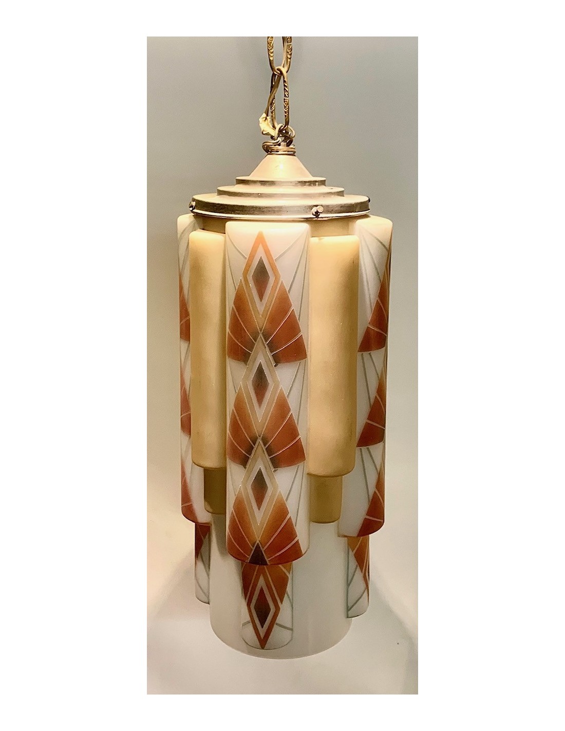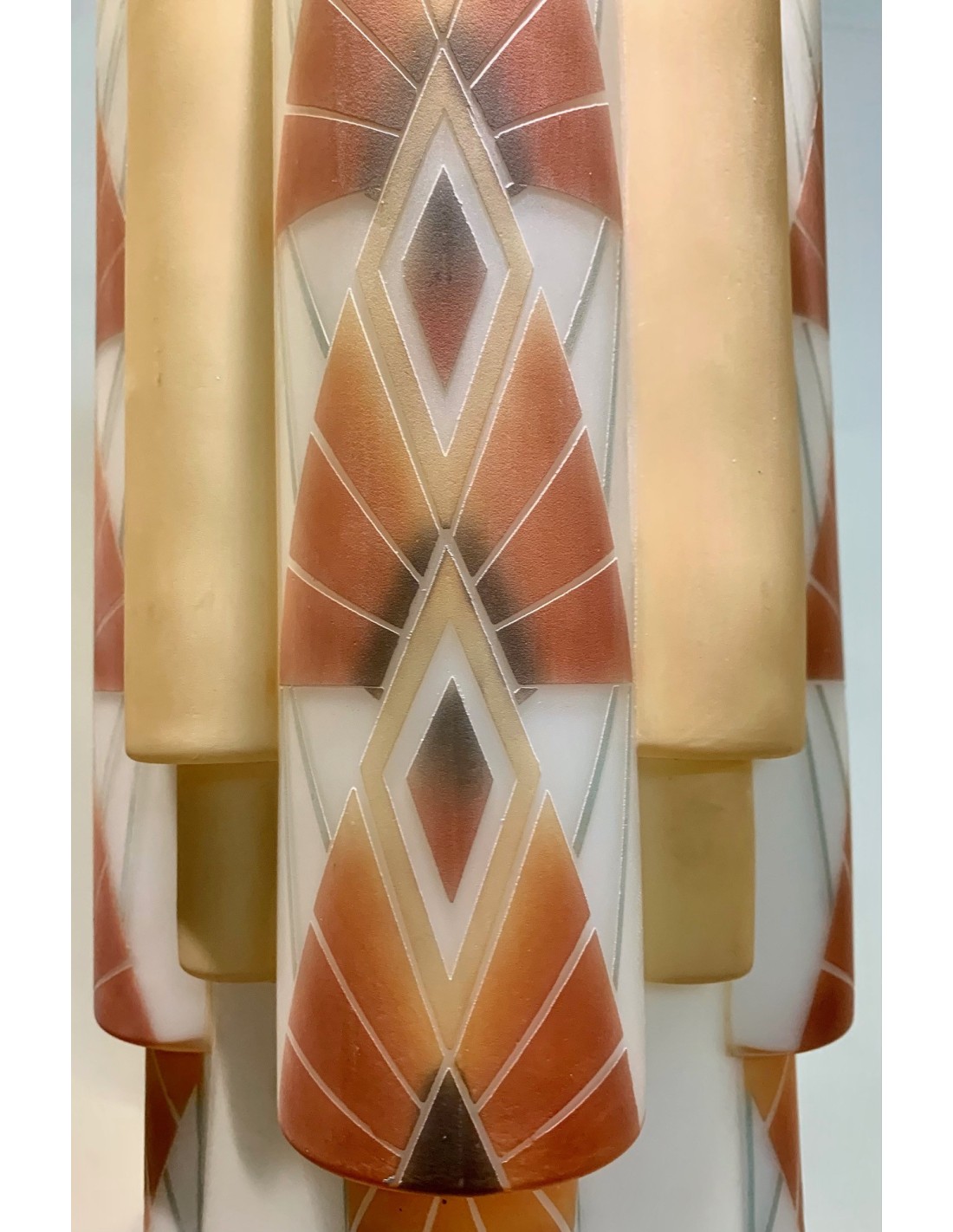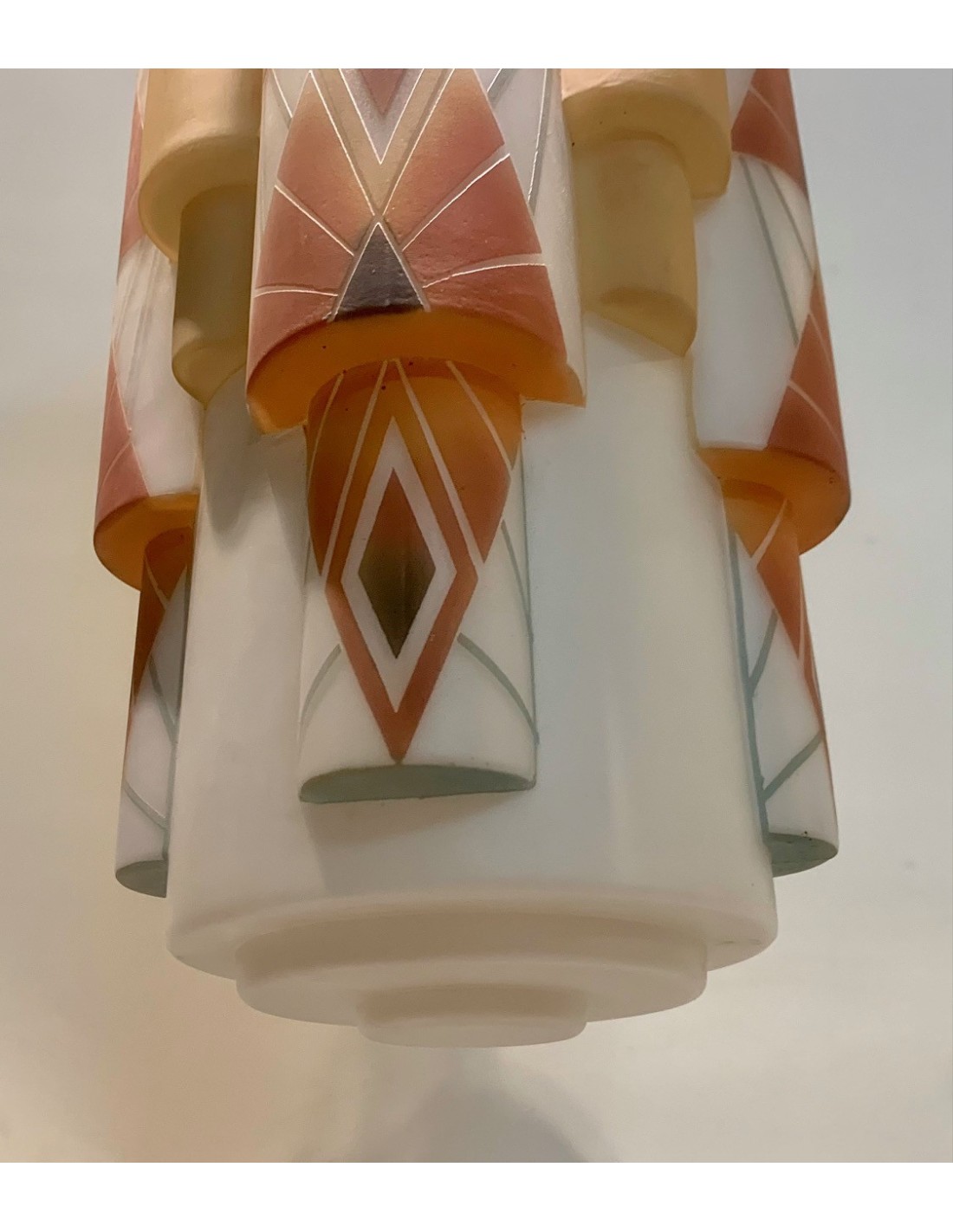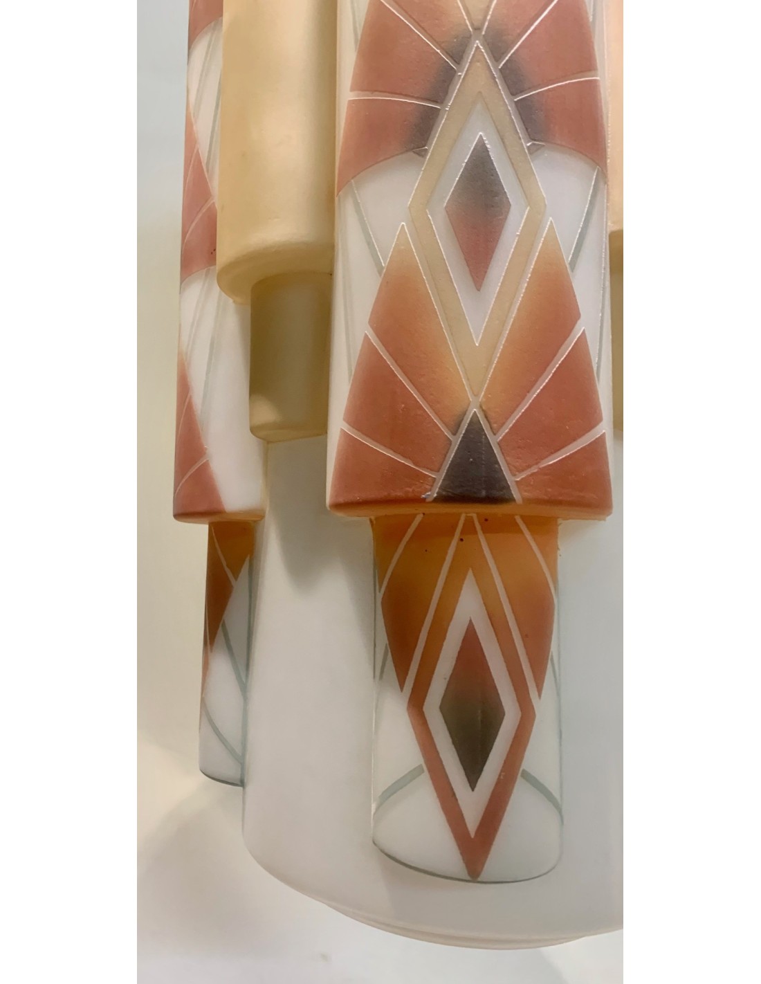 Lámpara de techo Art Decó de opalina en forma multi cilíndrica. Decoraciones policromadas de formas geométricas grabadas al ácido sobre fondo blanco. Interior de la pantalla con cinco luces, cuatro superiores y una inferior en la zona central.