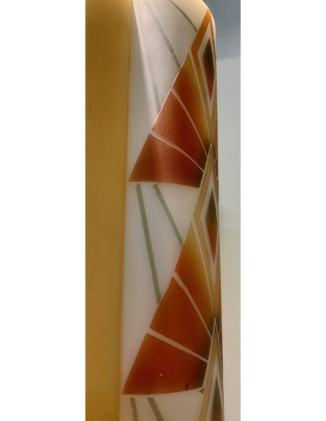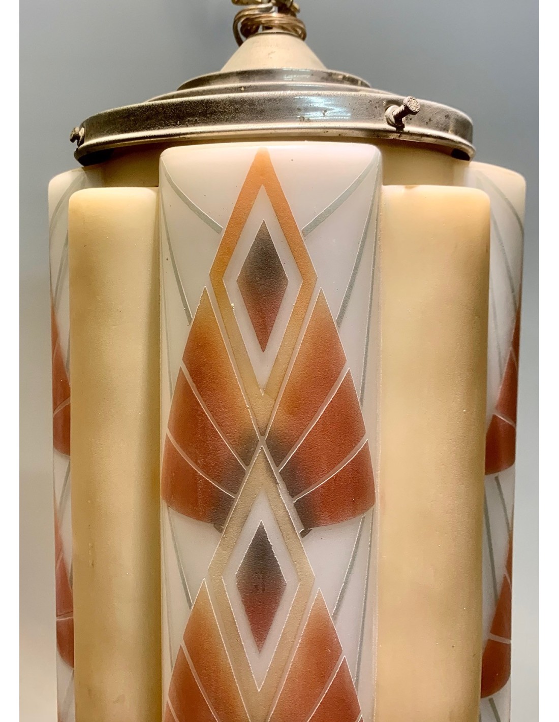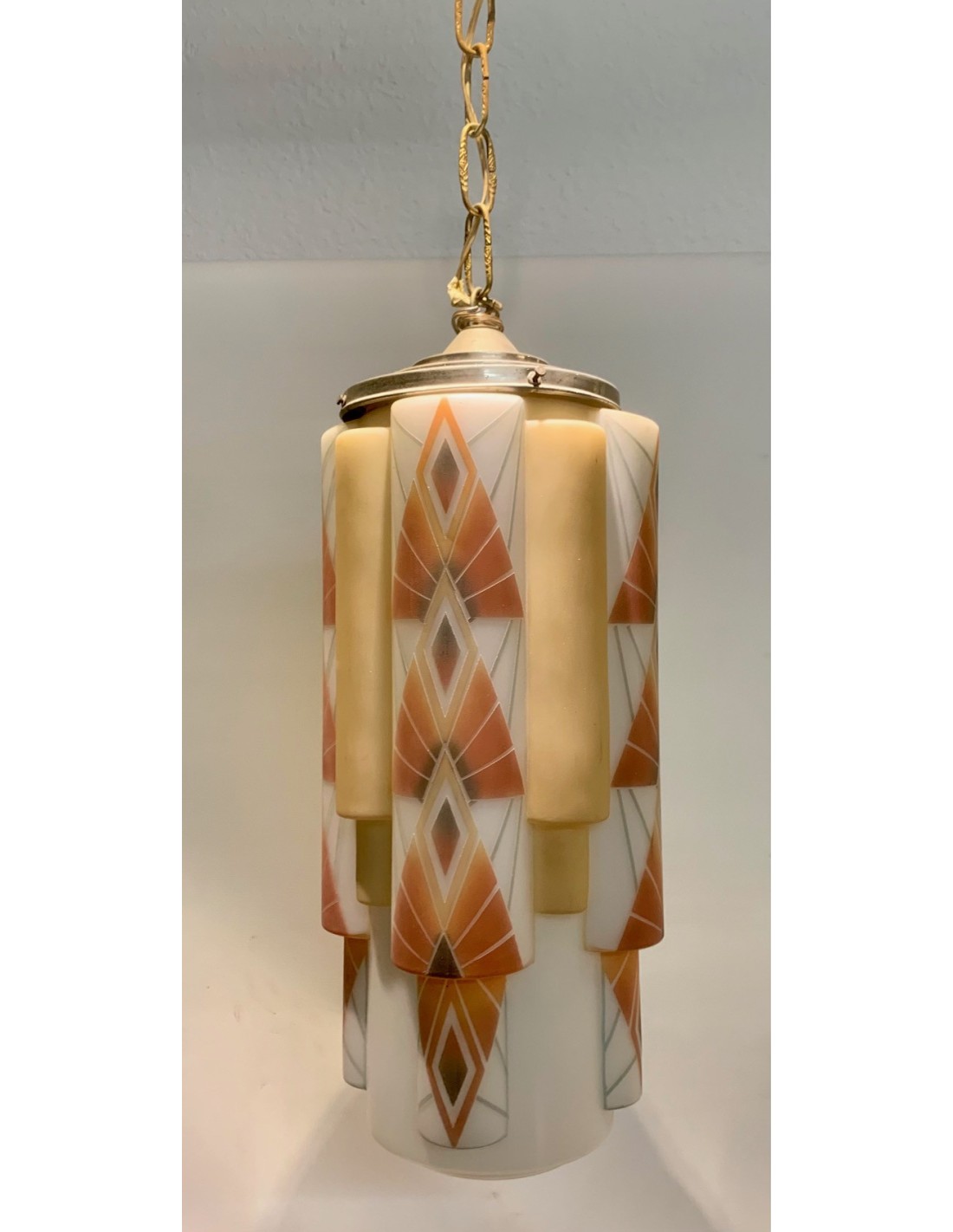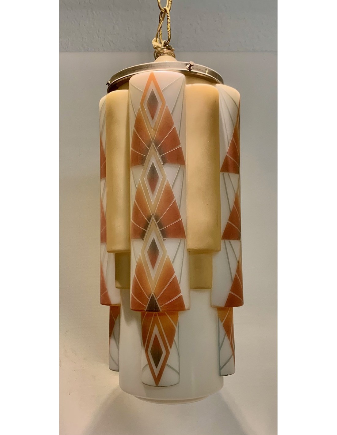 Lámpara de techo Art Decó de opalina en forma multi cilíndrica. Decoraciones policromadas de formas geométricas grabadas al ácido sobre fondo blanco. Interior de la pantalla con cinco luces, cuatro superiores y una inferior en la zona central.