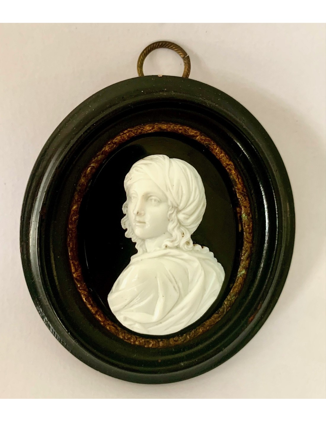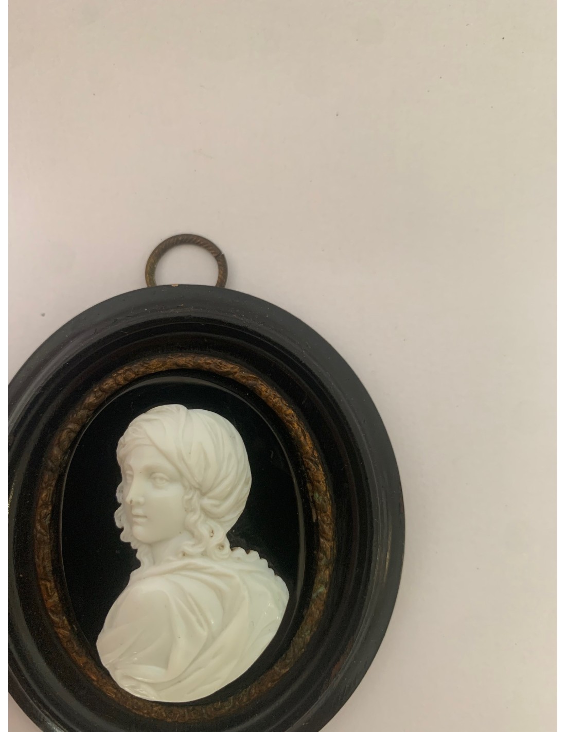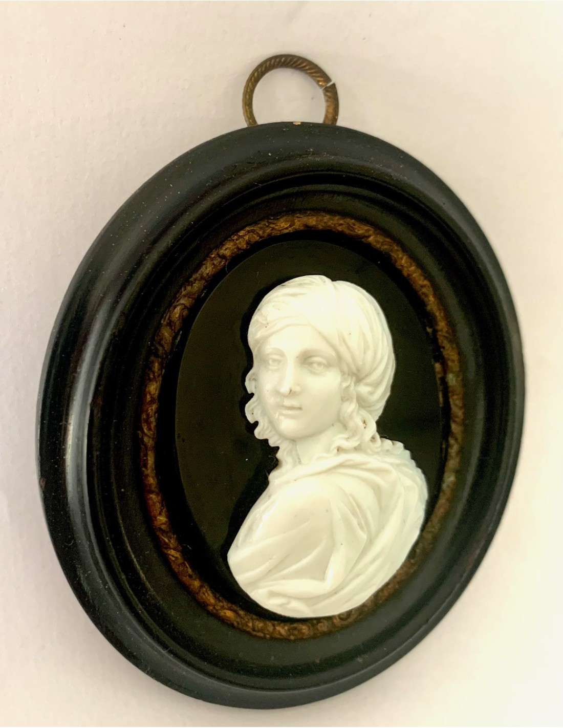 Antiguo souvenir camafeo. Retrato de perfil de tres cuartos de la aristócrata Beatrice Cenci di Roma (1577-1599). Camafeo de pasta vitrea blanca sobre placa de ónix negra y enmarcación ovalada de madera lacada negra. Papel original en la parte posterior fechado en Abril de 1870.