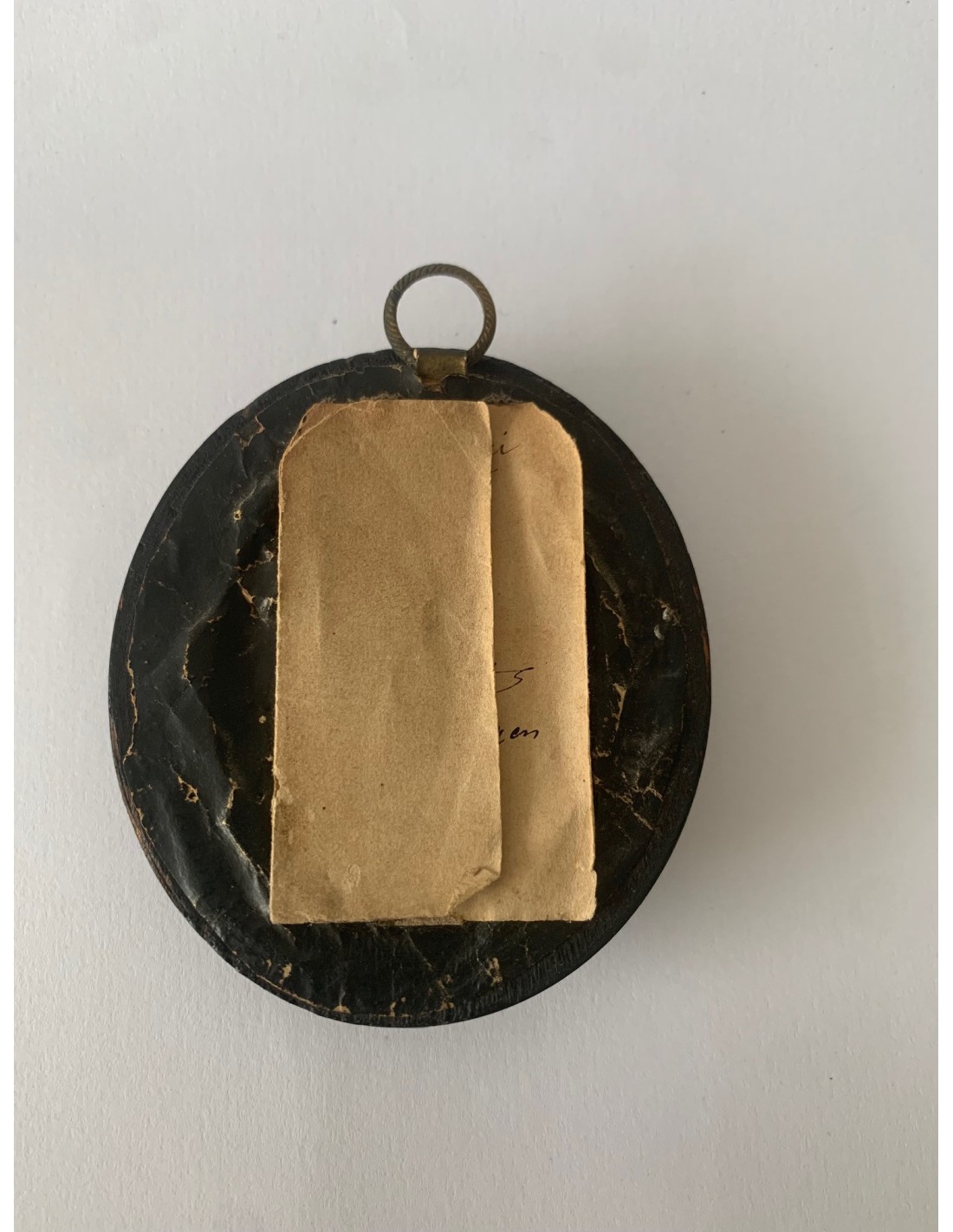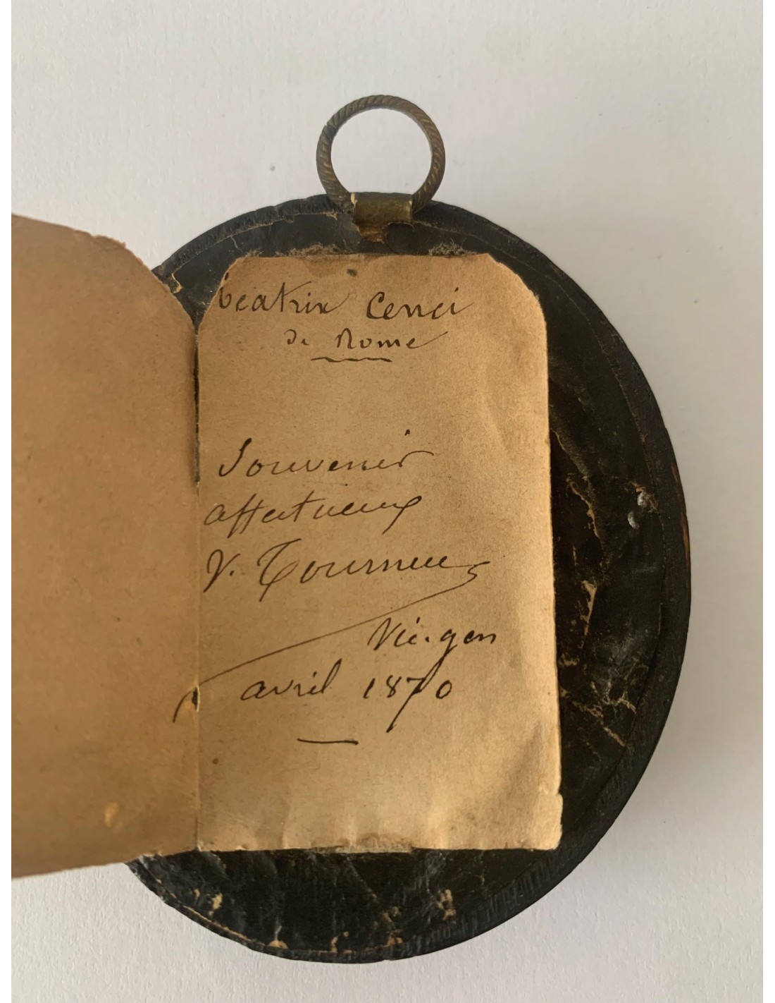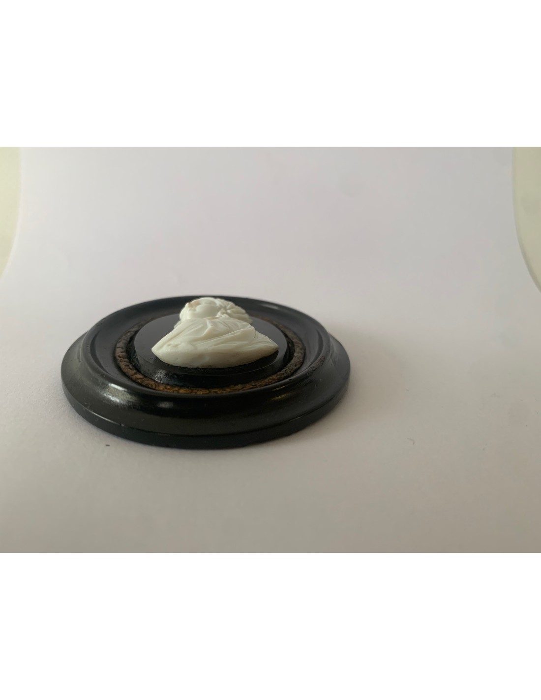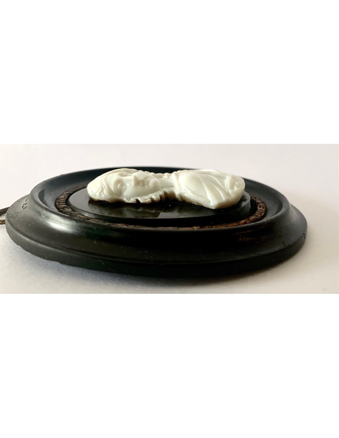 Antiguo souvenir camafeo. Retrato de perfil de tres cuartos de la aristócrata Beatrice Cenci di Roma (1577-1599). Camafeo de pasta vitrea blanca sobre placa de ónix negra y enmarcación ovalada de madera lacada negra. Papel original en la parte posterior fechado en Abril de 1870.