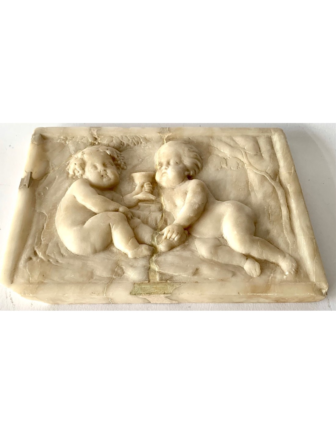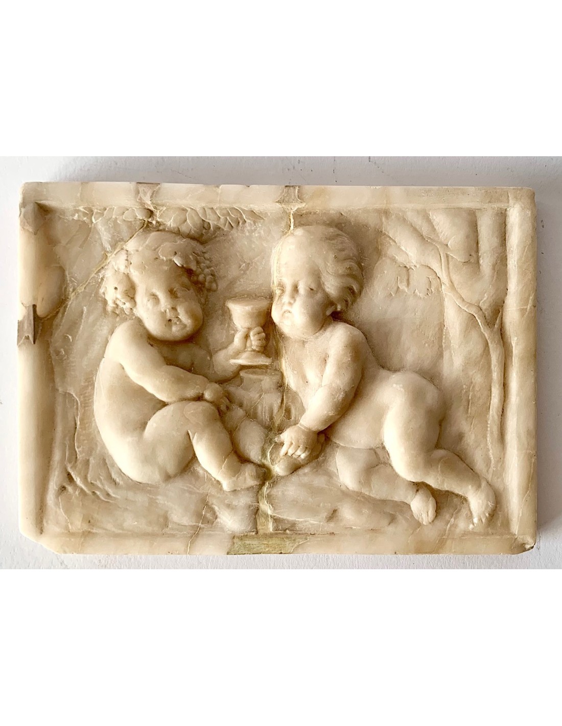 “Dionisio niño”, Bajorrelieve de mármol del siglo XVIII, representa a Dionisio (en griego), Dios del vino, también conocido como Baco (equivalente romano), con una corona de hojas de vid y racimos de uva y un cáliz en la mano, al lado, otro putto.