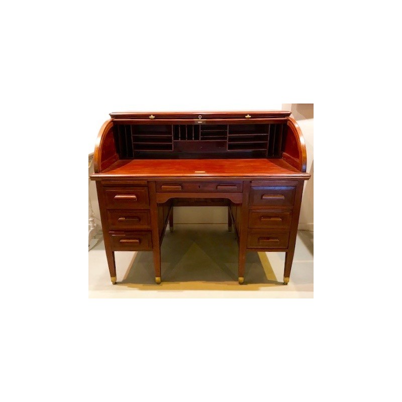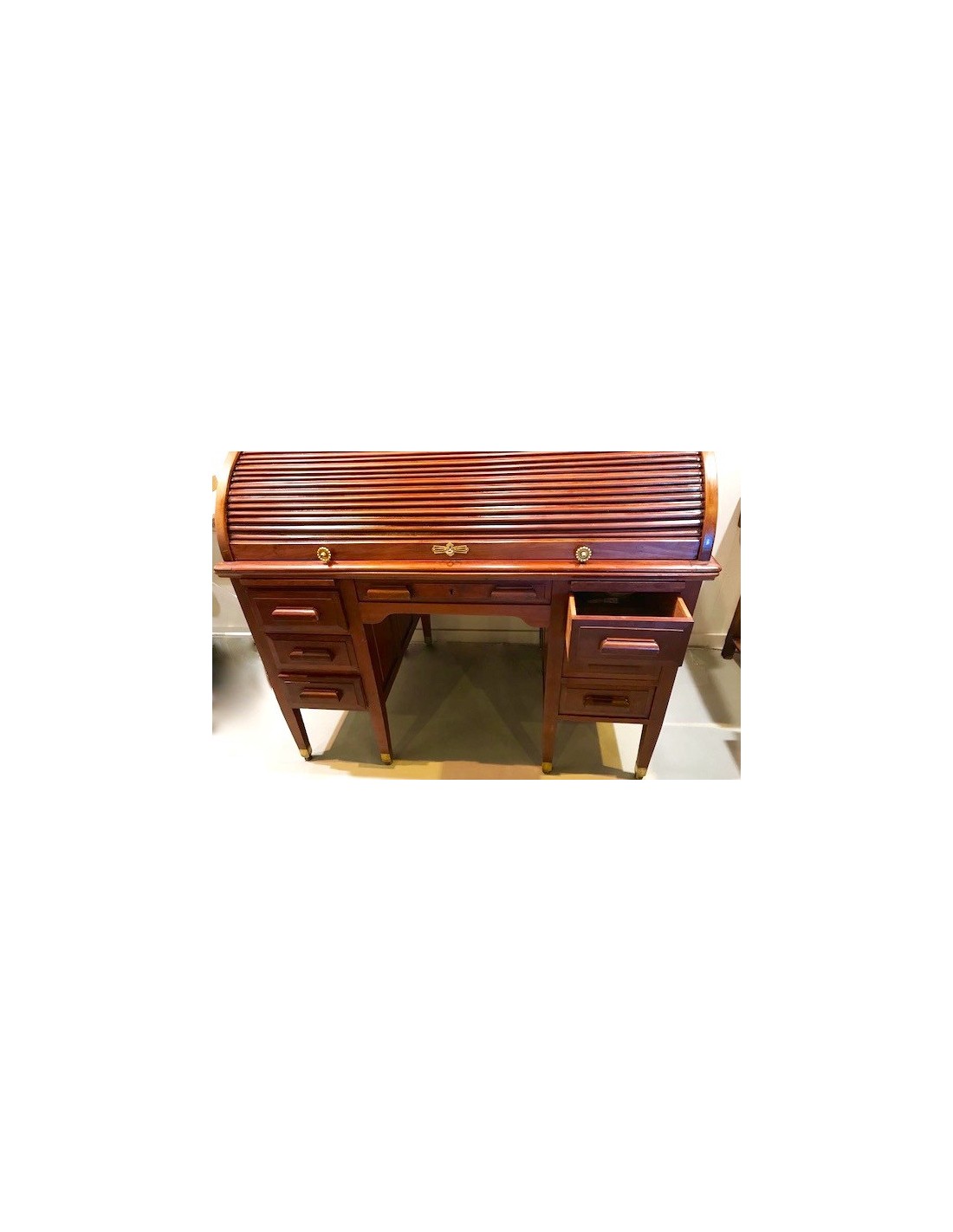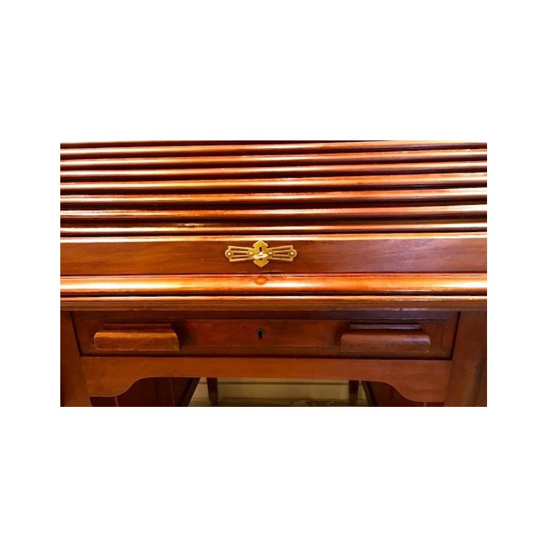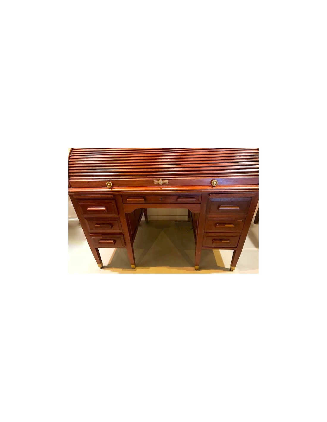 Antiguo escritorio bureau de caoba maciza de la primera mitad del siglo XX (1930 circa). Compuesta por dos partes, la superior con persiana giratoria con varios compartimientos en su interior en sentido vertical y horizontal, y la mesa inferior con siete cajones tres por cada lado y uno mas estrecho central. Ocho patas de apoyo con pies de bronce. Buen estado de conservación.