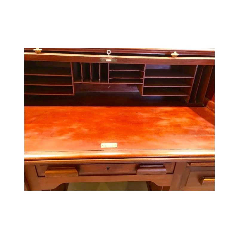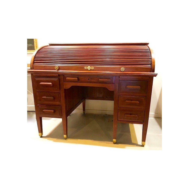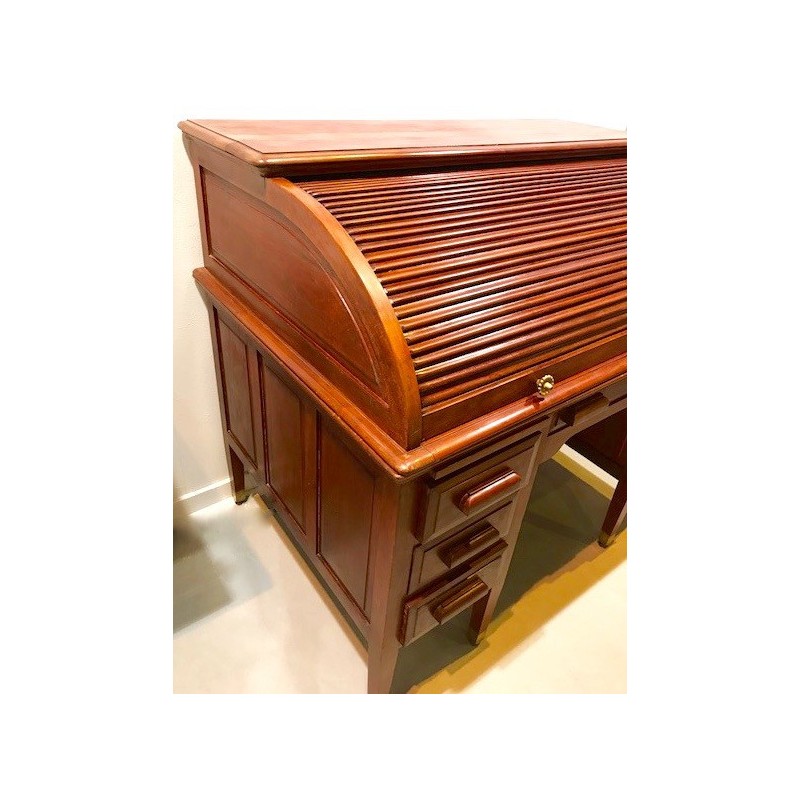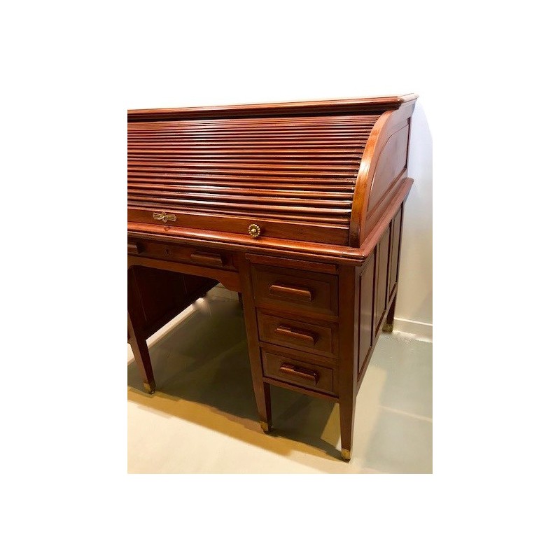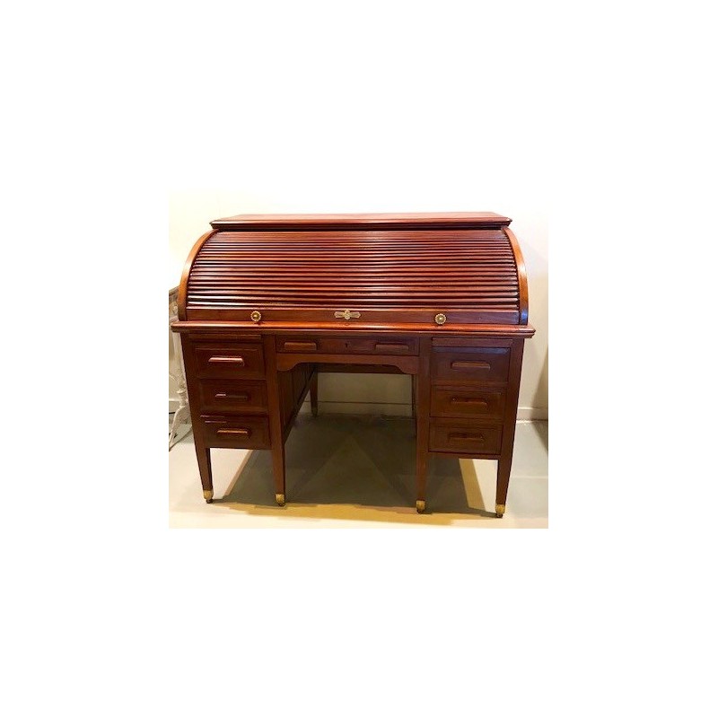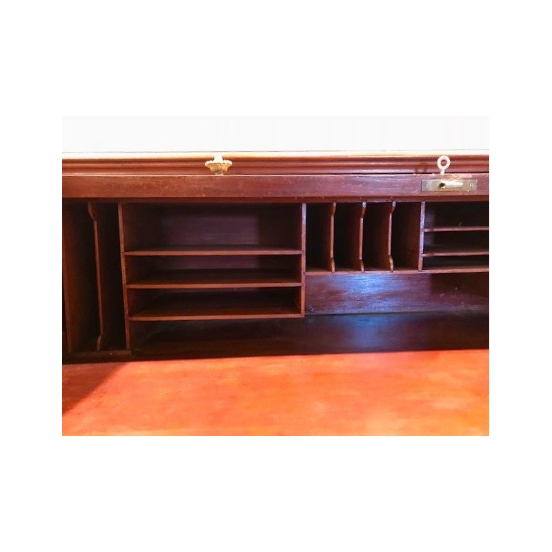 Antiguo escritorio bureau de caoba maciza de la primera mitad del siglo XX (1930 circa). Compuesta por dos partes, la superior con persiana giratoria con varios compartimientos en su interior en sentido vertical y horizontal, y la mesa inferior con siete cajones tres por cada lado y uno mas estrecho central. Ocho patas de apoyo con pies de bronce. Buen estado de conservación.