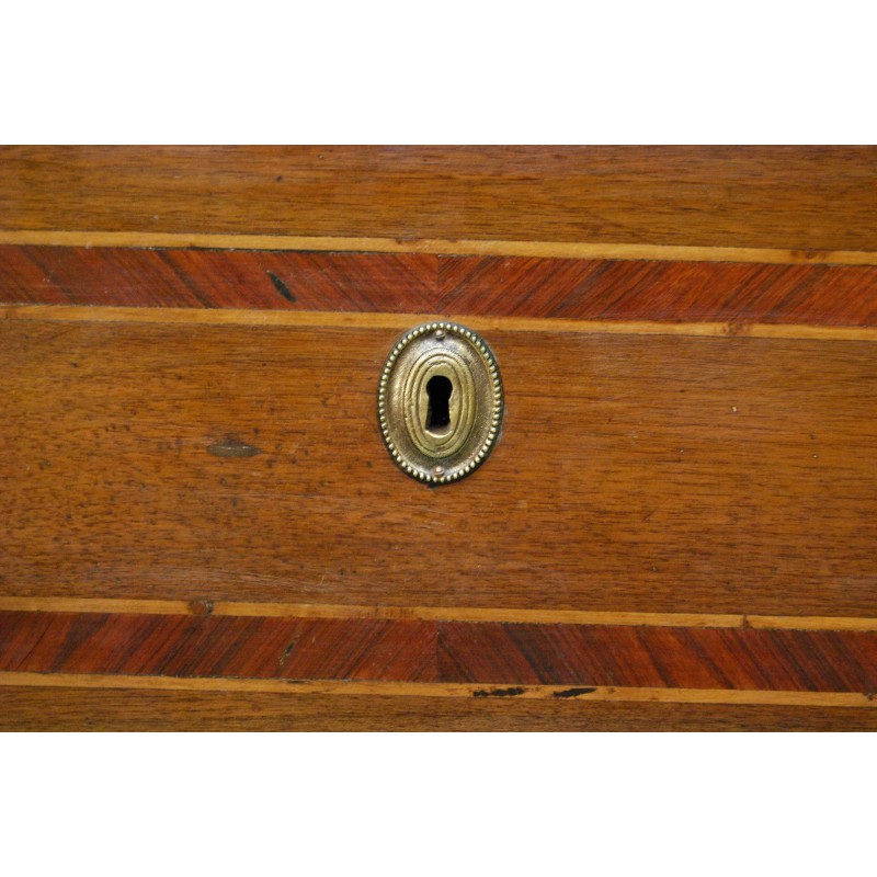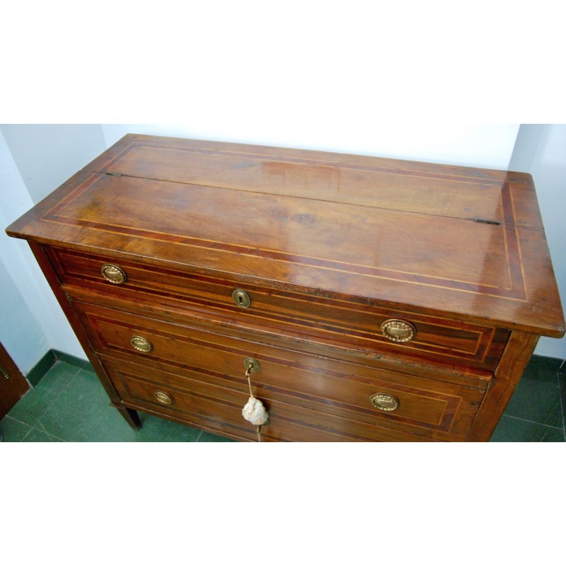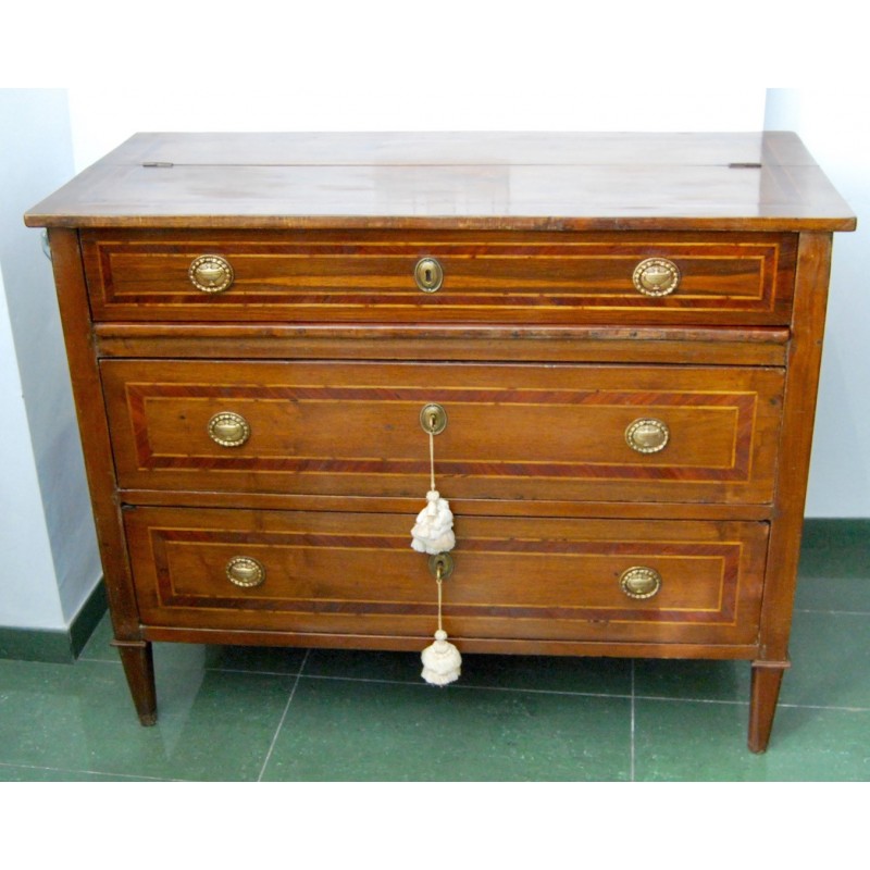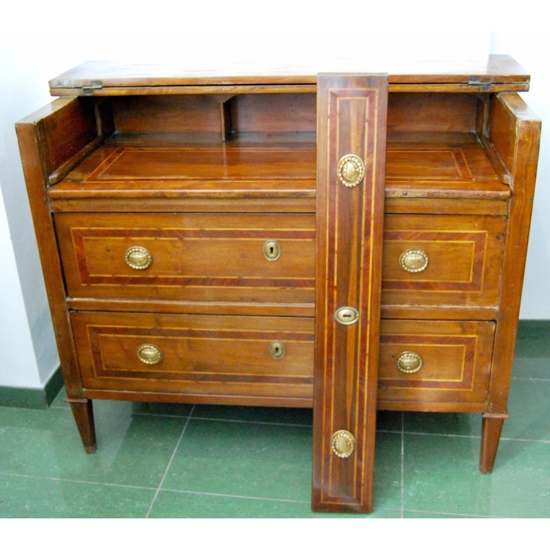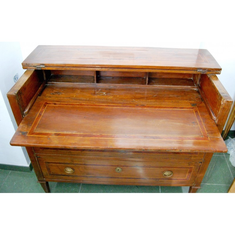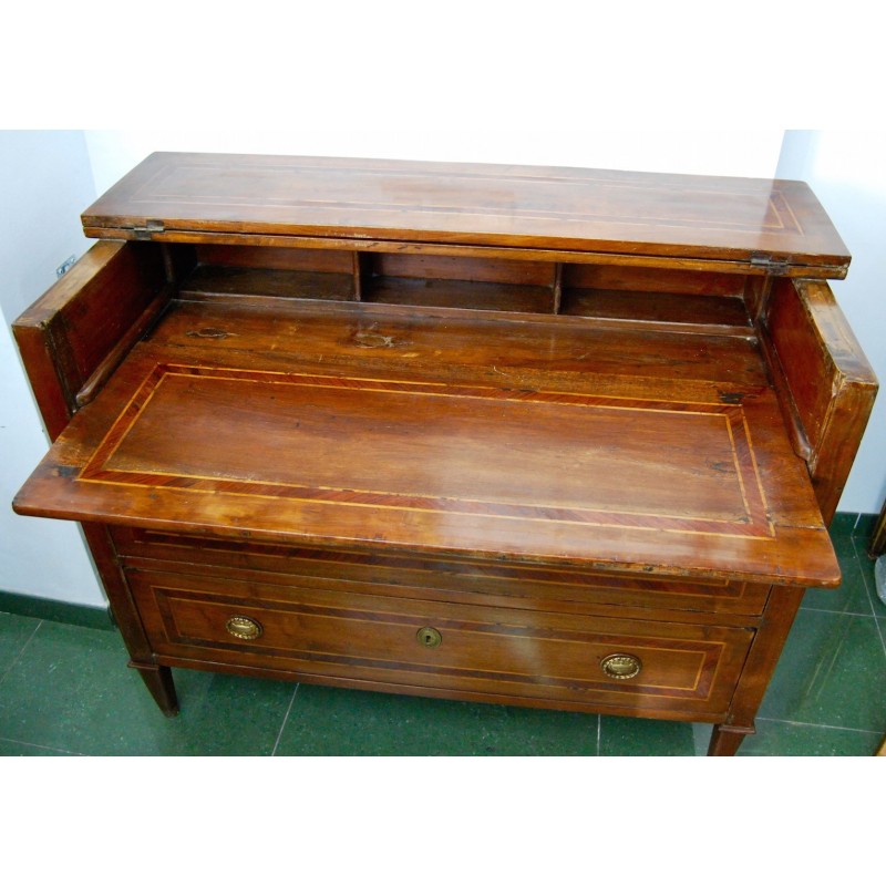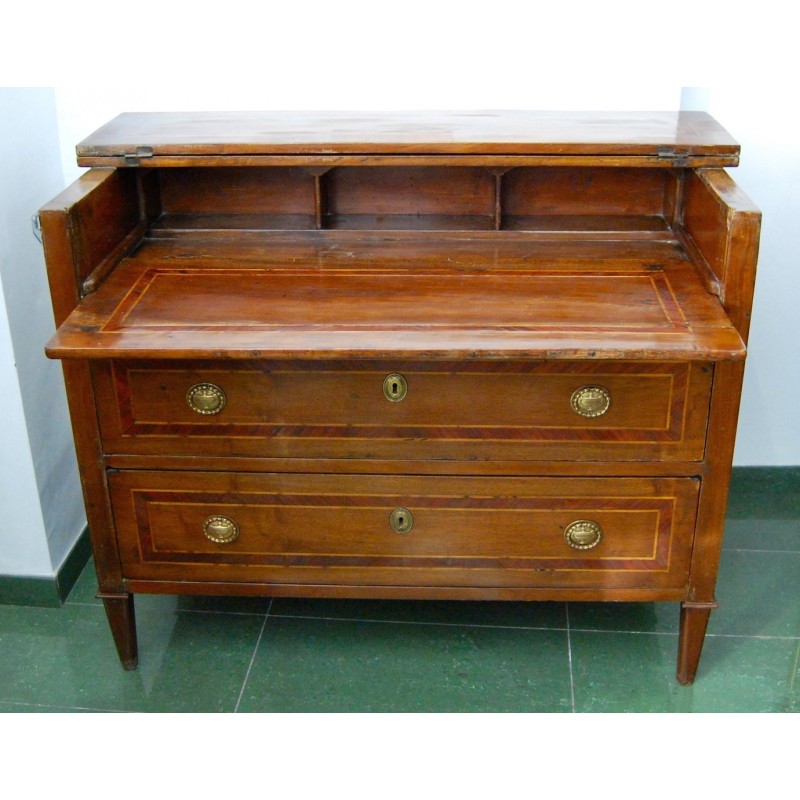 Antigua cómoda escritorio italiana del siglo XVIII, época Luis XVI, de tres cajones del cual el primer cajón con tapa que se levanta y permite el acceso a la base extensible del escritorio, al fondo tres compartimientos. Tiradores y bocallaves de bronce originales d’epoca. Madera maciza de nogal con marquetería, patas troncopiramidales.
