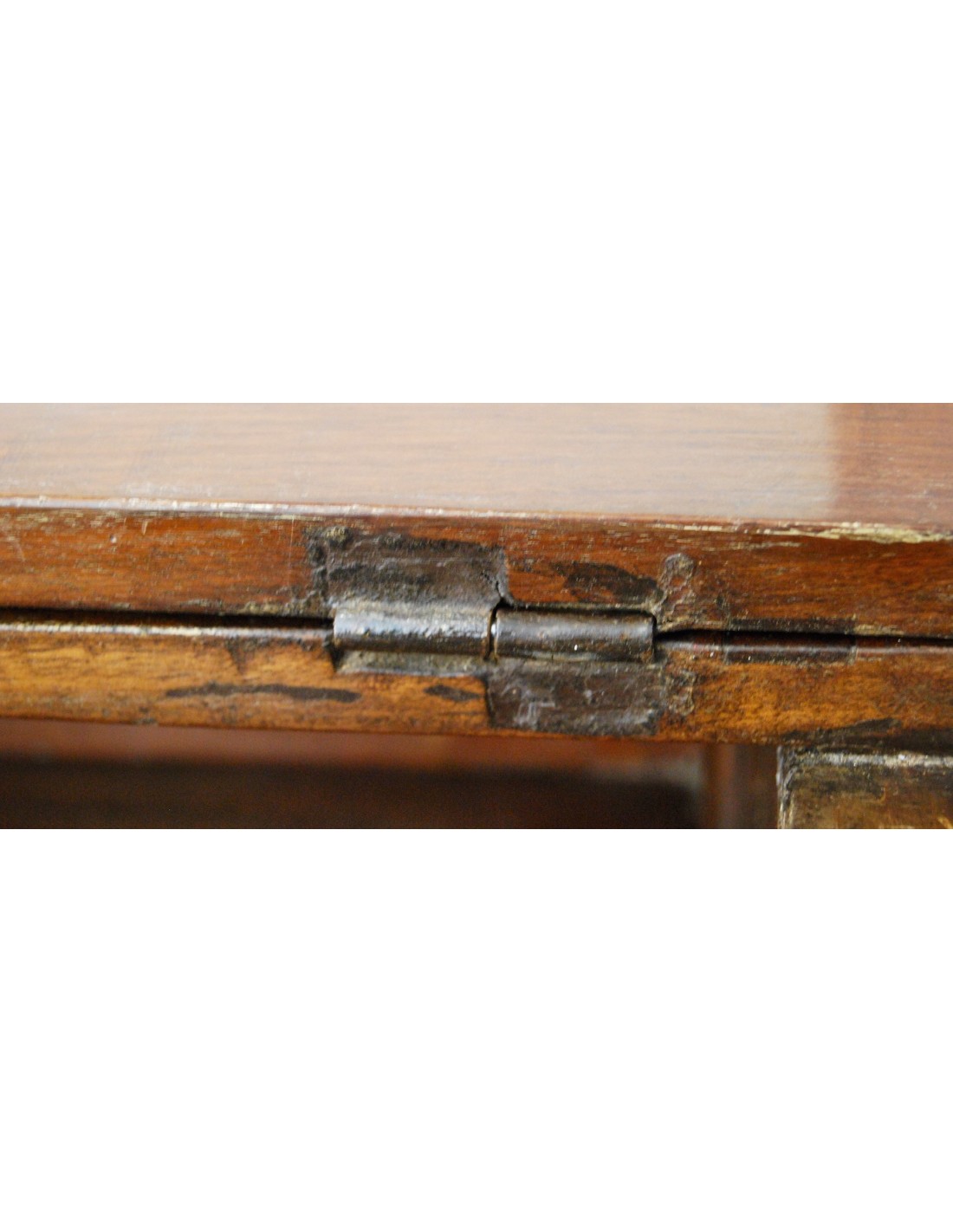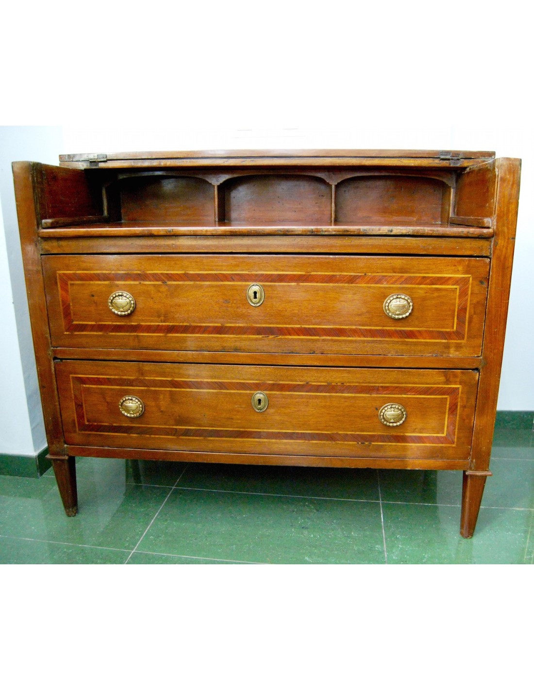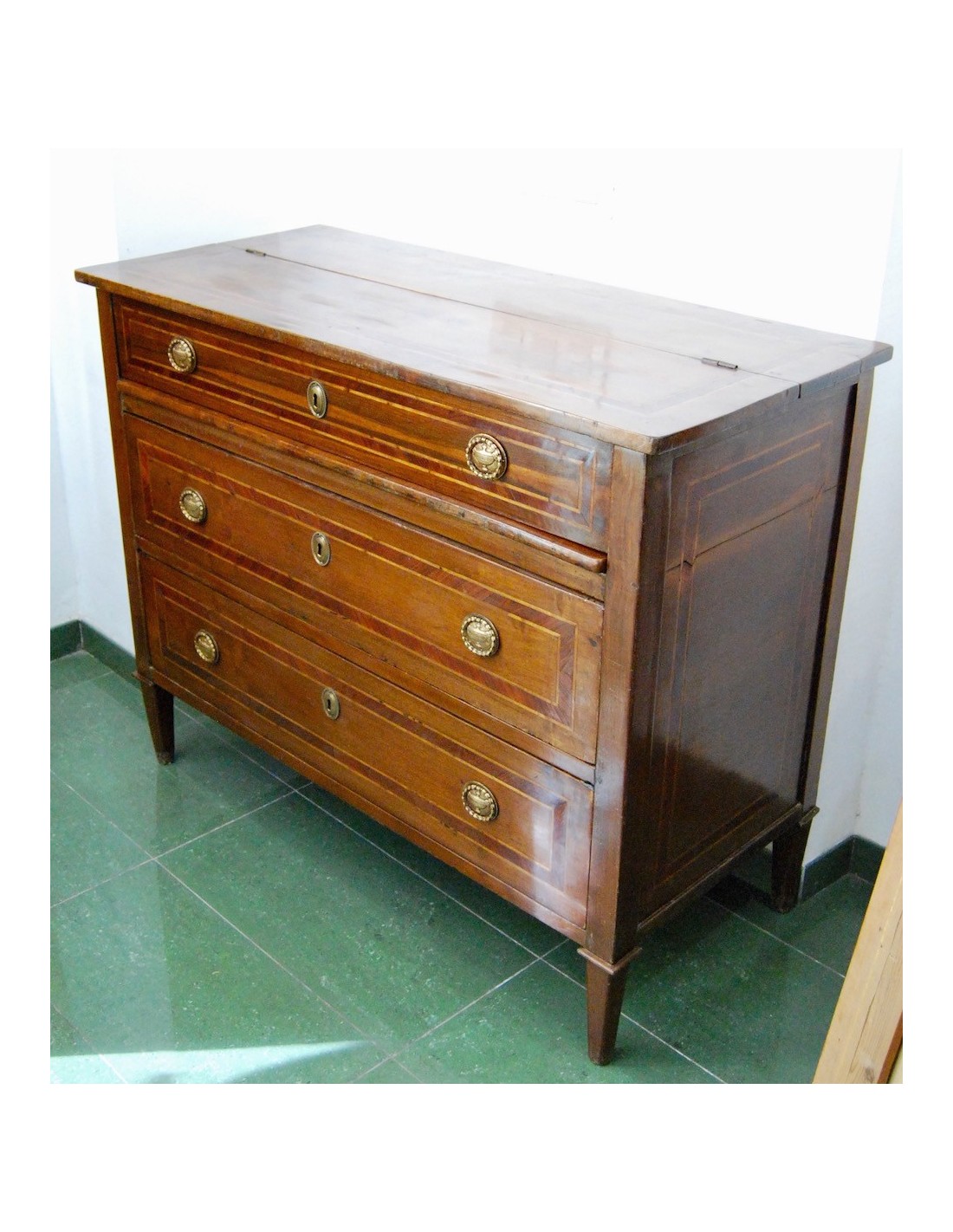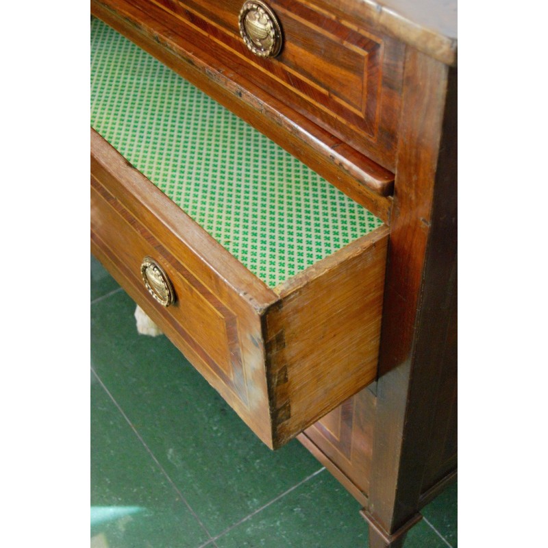 Antigua cómoda escritorio italiana del siglo XVIII, época Luis XVI, de tres cajones del cual el primer cajón con tapa que se levanta y permite el acceso a la base extensible del escritorio, al fondo tres compartimientos. Tiradores y bocallaves de bronce originales d’epoca. Madera maciza de nogal con marquetería, patas troncopiramidales.