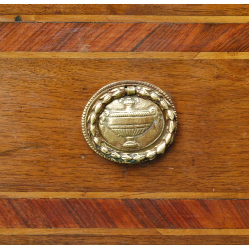Cómoda escritorio italiana del siglo XVIII, época Luis XVI. Tres cajones, el primer cajón con tapa que se levanta y permite el acceso a la base extensible del escritorio, y tres compartimientos. Tiradores y bocallaves de bronce d’epoca, madera maciza de nogal con marquetería, patas troncopiramidales.