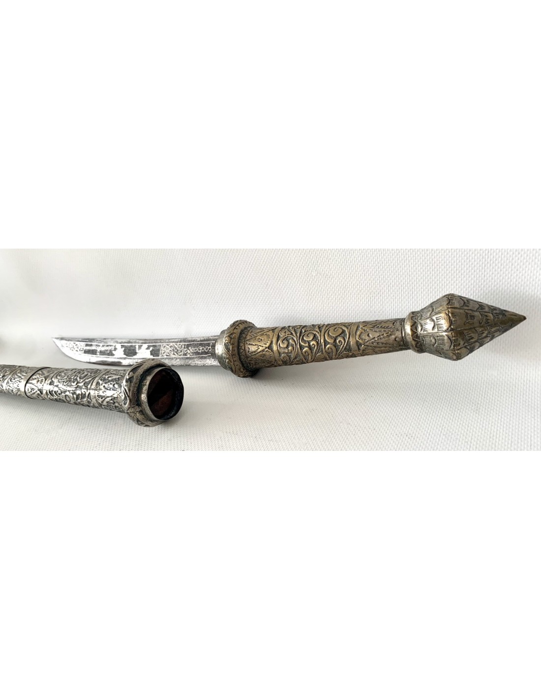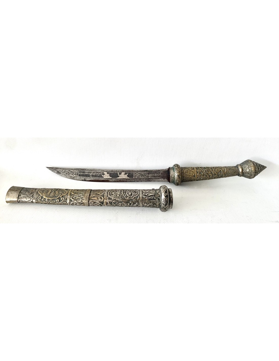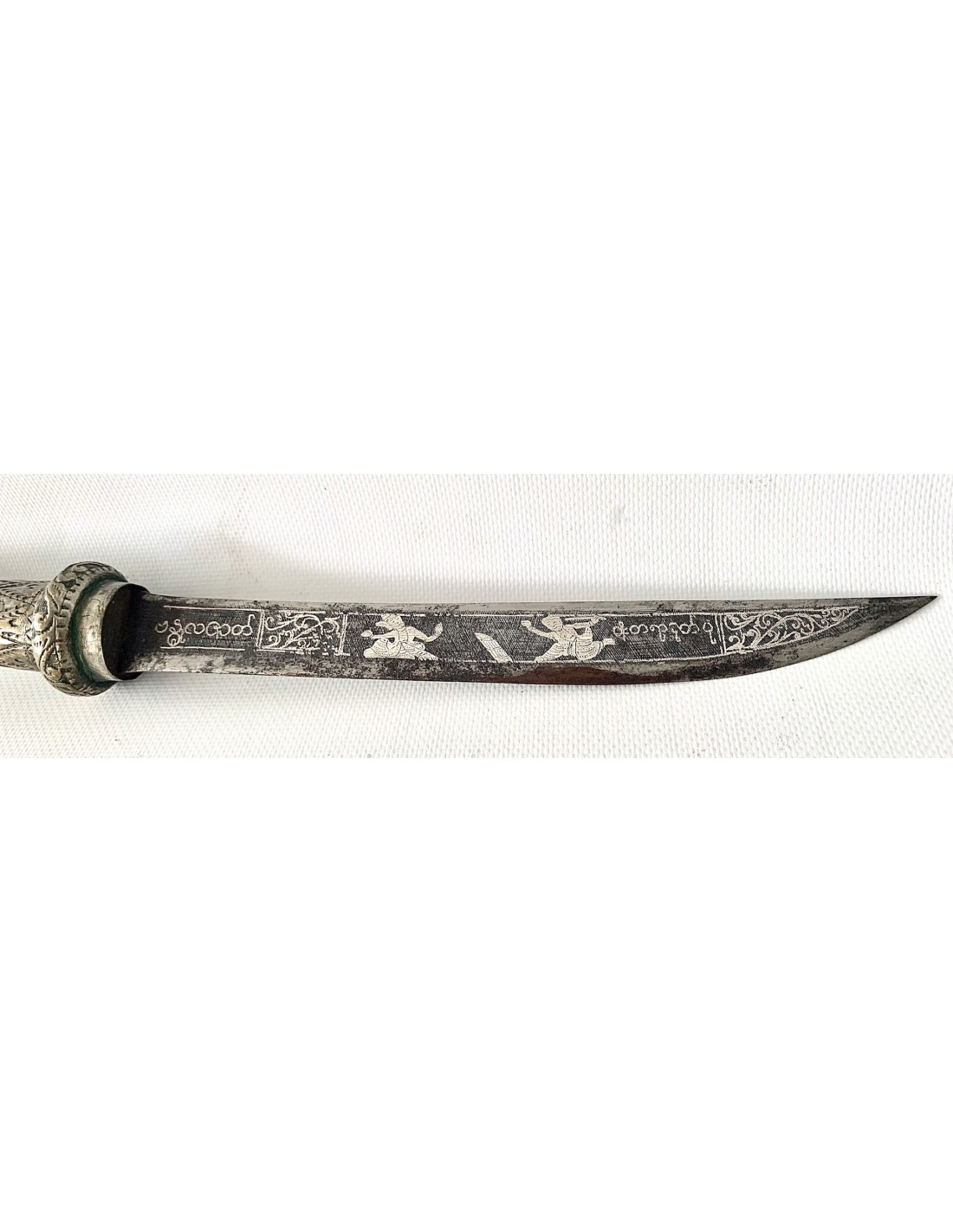 Daga birmana “Dha”, principios del siglo XX (1900-1920), funda y empuñadura de latón plateado enteramente repujada, hoja ligeramente curvada con decoraciones de personajes en plata por ambos lados.