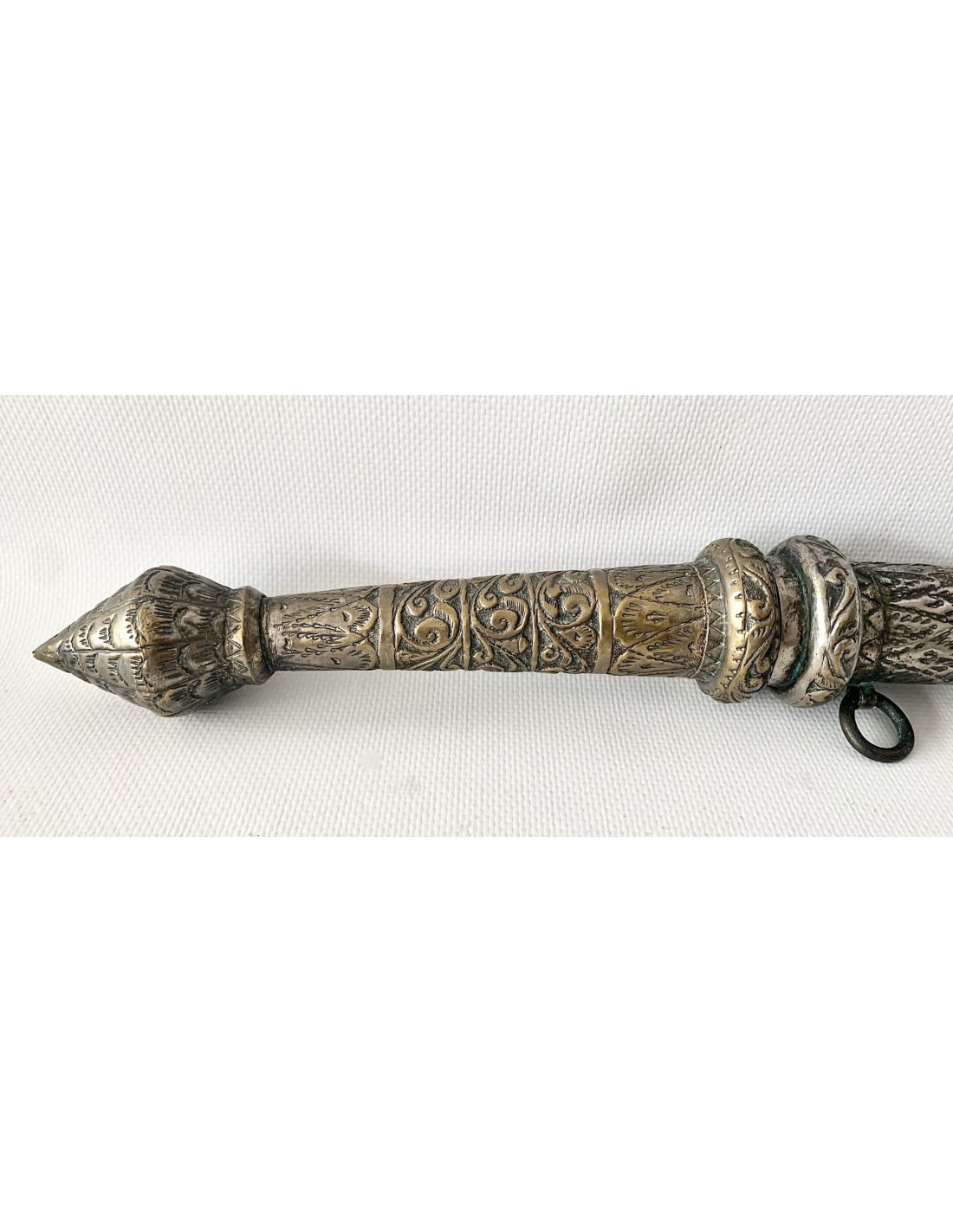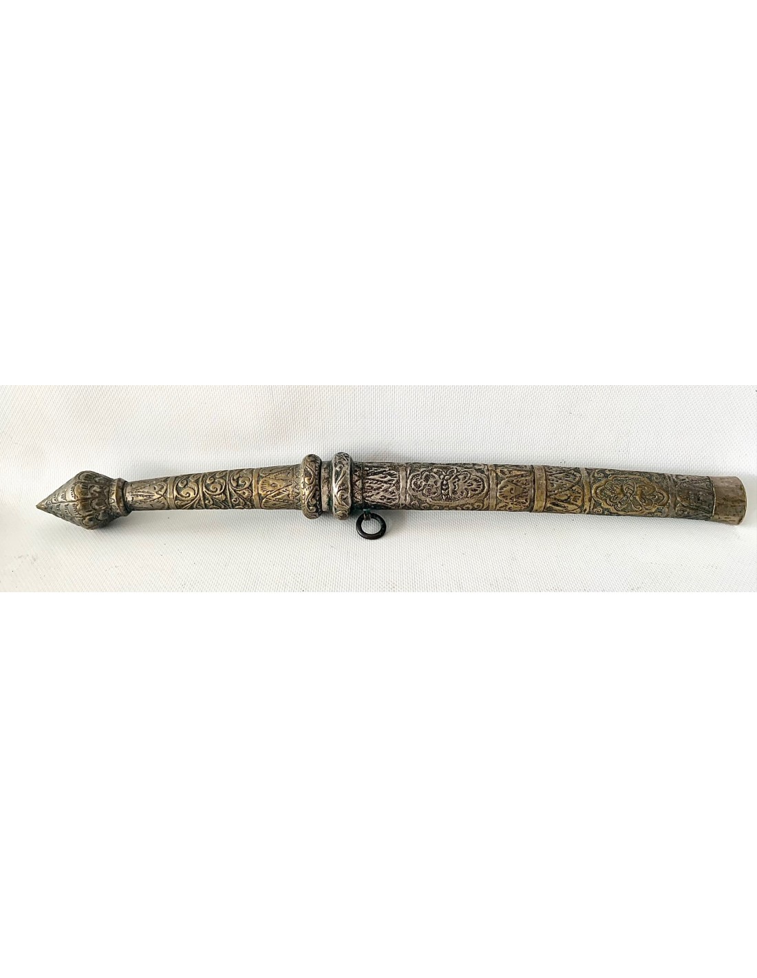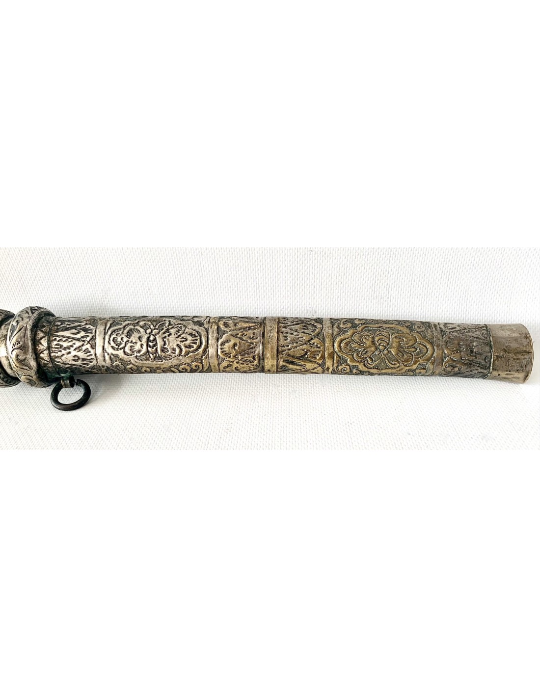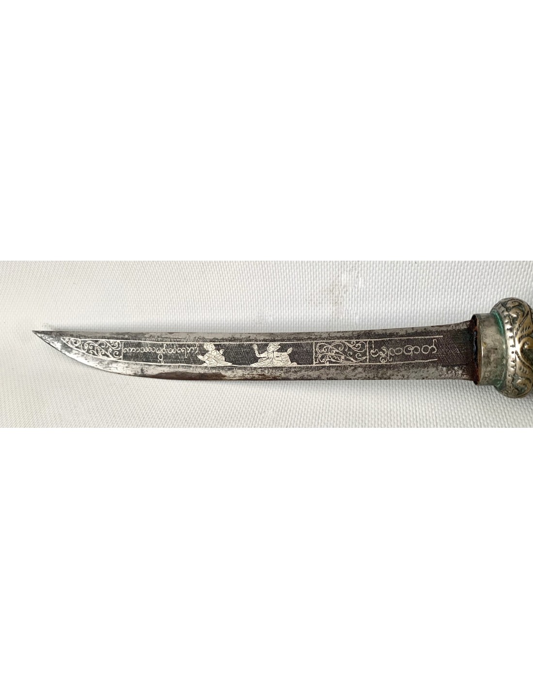 Daga birmana “Dha”, principios del siglo XX (1900-1920), funda y empuñadura de latón plateado enteramente repujada, hoja ligeramente curvada con decoraciones de personajes en plata por ambos lados.