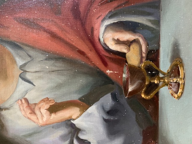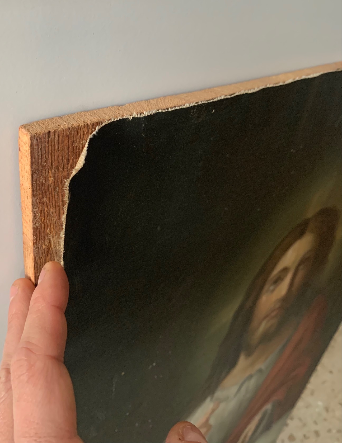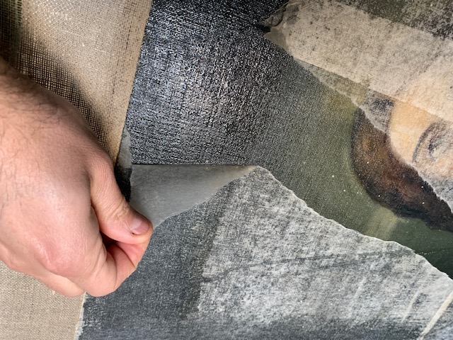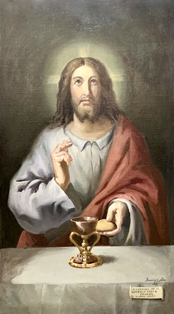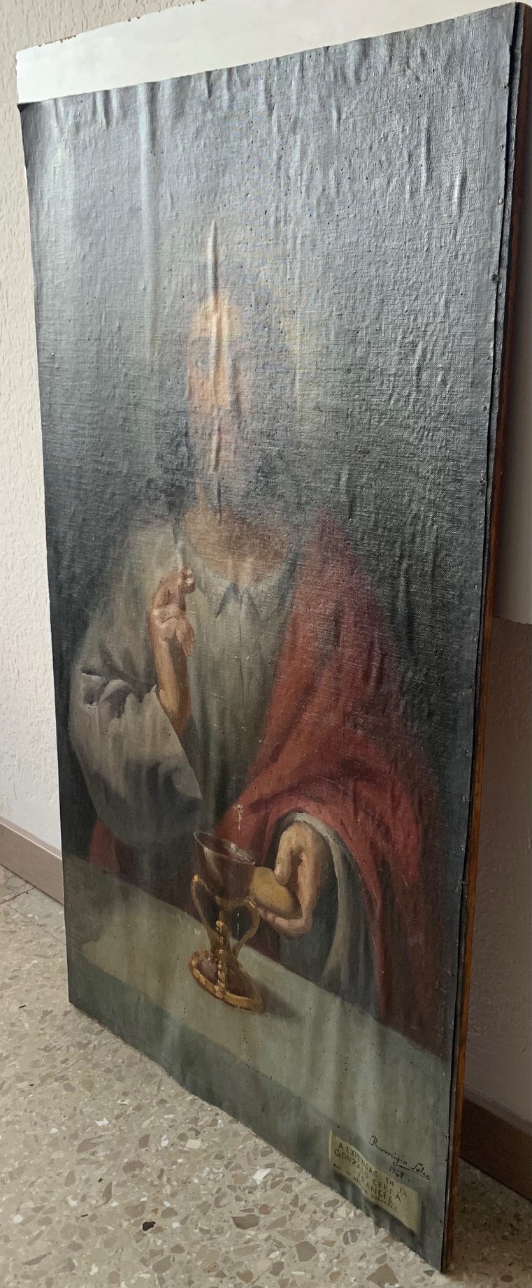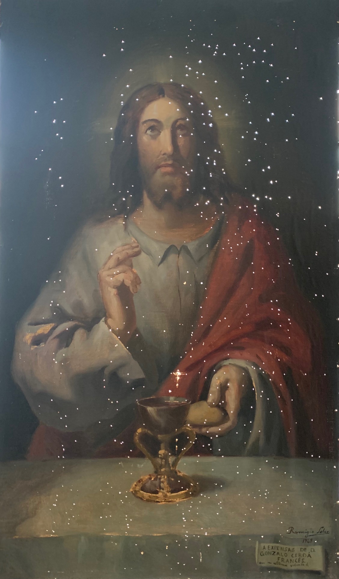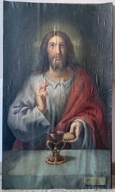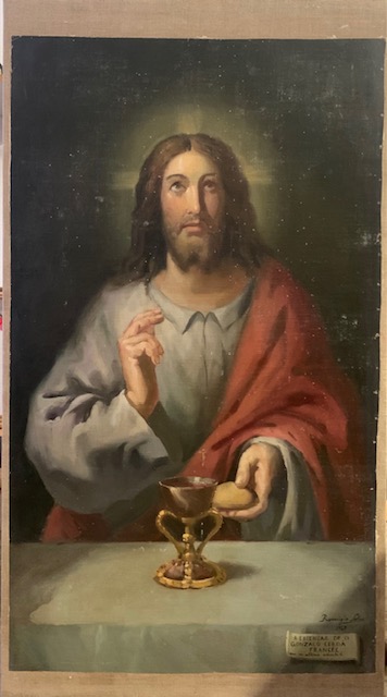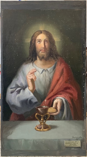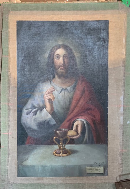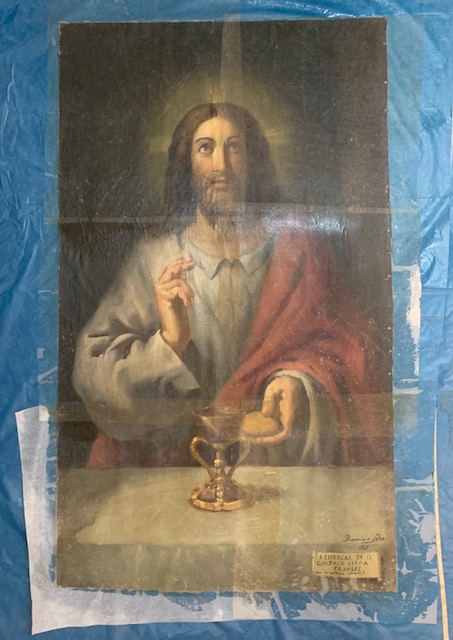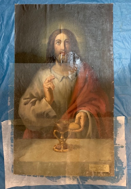 RESTAURACIÓN DE UN LIENZO DEL AUTOR VALENCIANO REMIGIO SOLER TOMÁS, PINTURA DE LA IGLESIA PARROQUIAL DE SAN MIGUEL ARCÁNGEL DE AGRES, ALICANTE.Cristo Eucaristico, dimensiones: 120 x 66 cm.Estado de conservación:El lienzo presenta notables abolladuras y un mal tensado debido a su erróneo pegado sobre tabla. Esto ha causado que la carcoma afectara también al lienzo, dejando visibles los agujeros también en la policromia pictórica. La superficie pictórica está visiblemente oscurecida y amarillenta por barnices. También se pueden notar algunas ralladuras alrededor del cáliz y en el perimetro del lienzo. Además, hay que observar, que el lienzo, fue recortado algunos centímetros en sus márgenes. Esto ha causado que se notaran esas faltas de la pintura colocada en su ubicación en el altar mayor.FASES DE RESTAURACIÓN1 - Despegado del lienzo de la tabla.2 - Consolidación de la superficie pictórica.3 - Reentelado del lienzo.4 - Creación de un nuevo bastidor de madera.6 - Tensado del lienzo al bastidor.7 - Estucado y lisado de las lagunas y agujeros de color.8 - Primer barnizado transparente a pincel.9 - Reintegración pictórica de las lagunas de color.10 - Barnizado final semi mate nebulizado de protección.11 - Reubicación del lienzo. Desperfectos del lienzo pegados a la tabla.Despegado del lienzo de la tabla.Agujeros de la carcoma de la tabla que han afectado el lienzo, fotografia contra luz.Consolidación del color.Fase del reentelado.Remoción del papel de protección de la superficie pictórica. Despues del montaje del lienzo al bastidor. Estucado de las lagunas de color.Limpieza de la superficie pictorica.