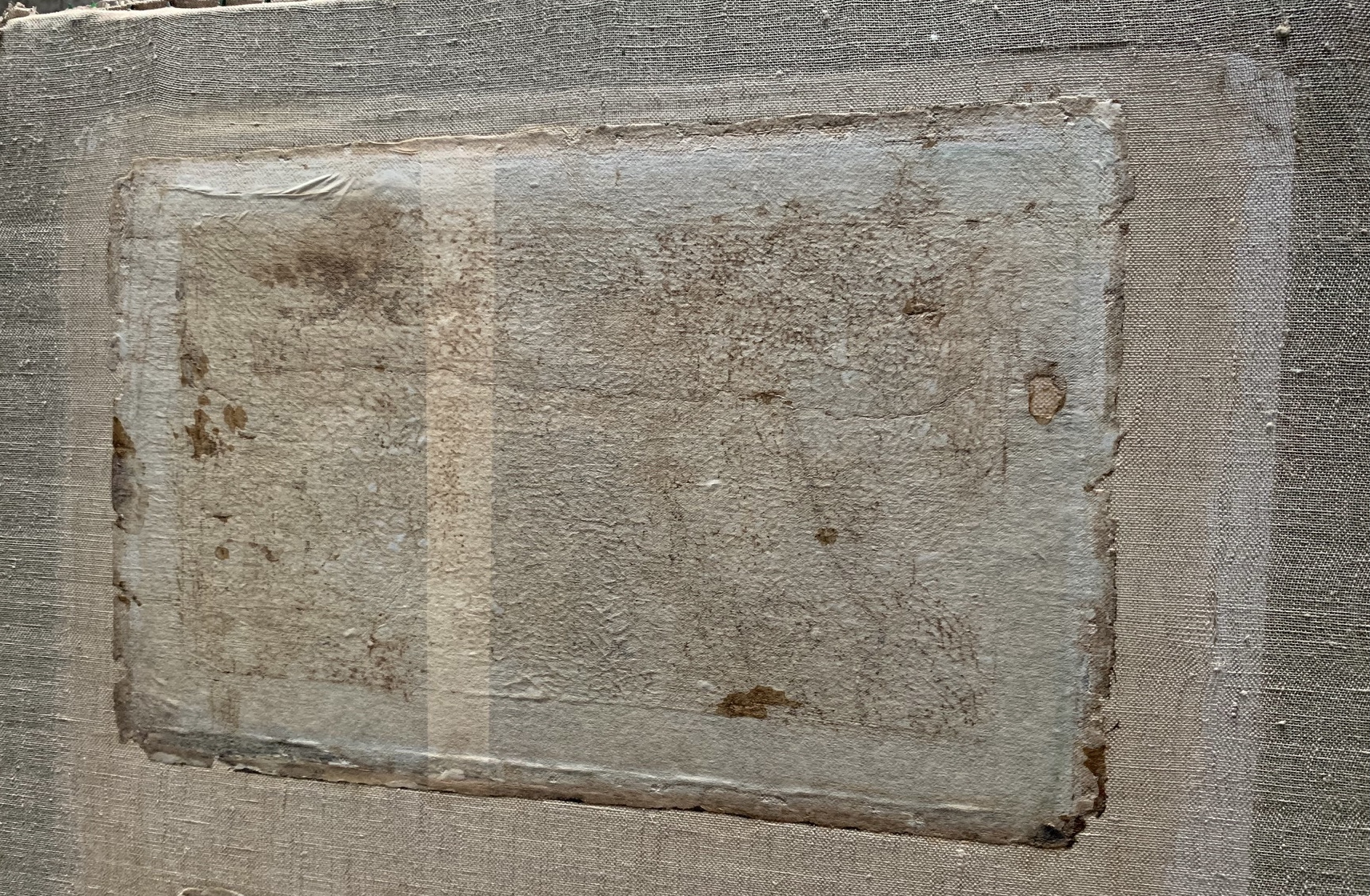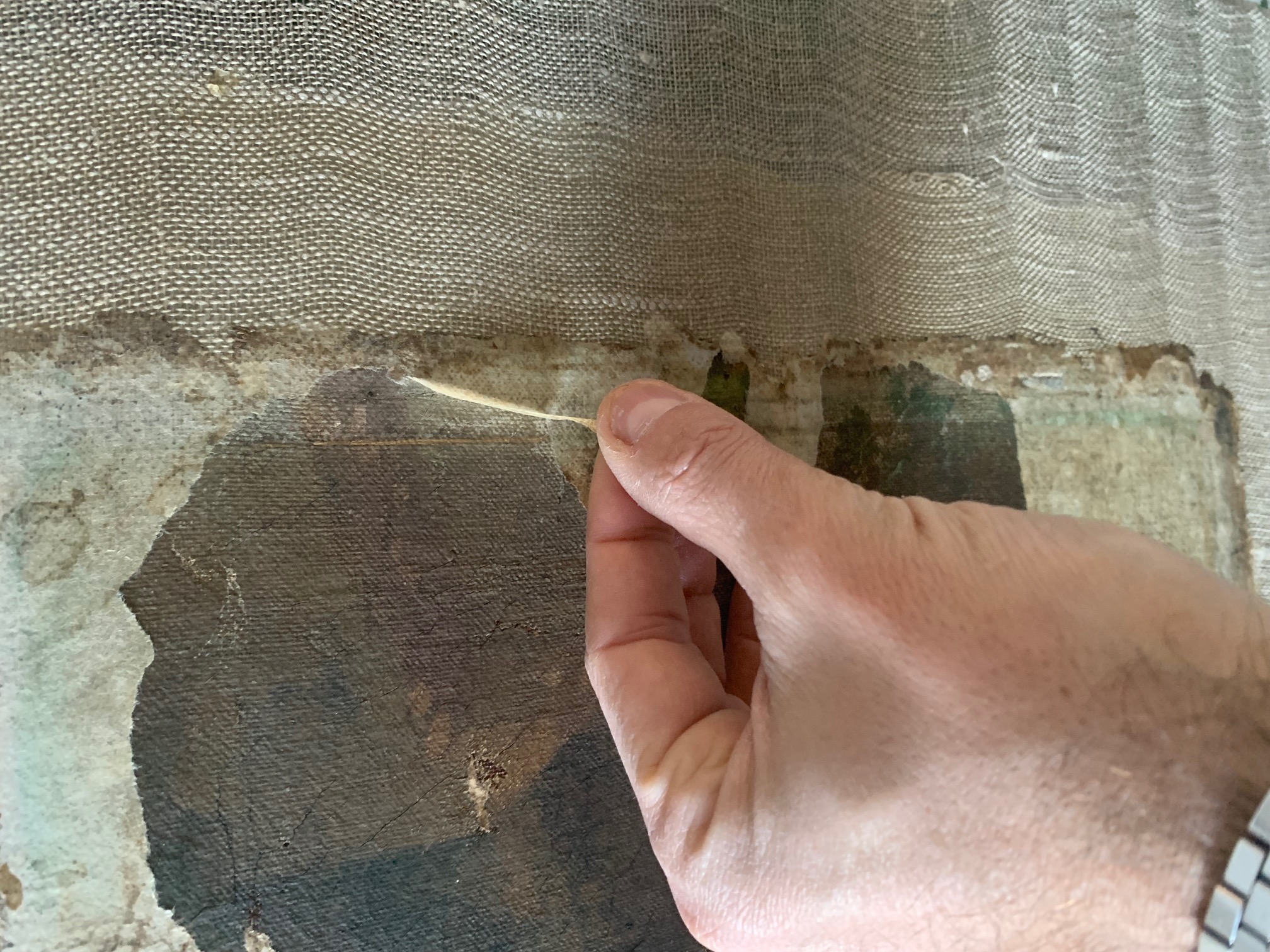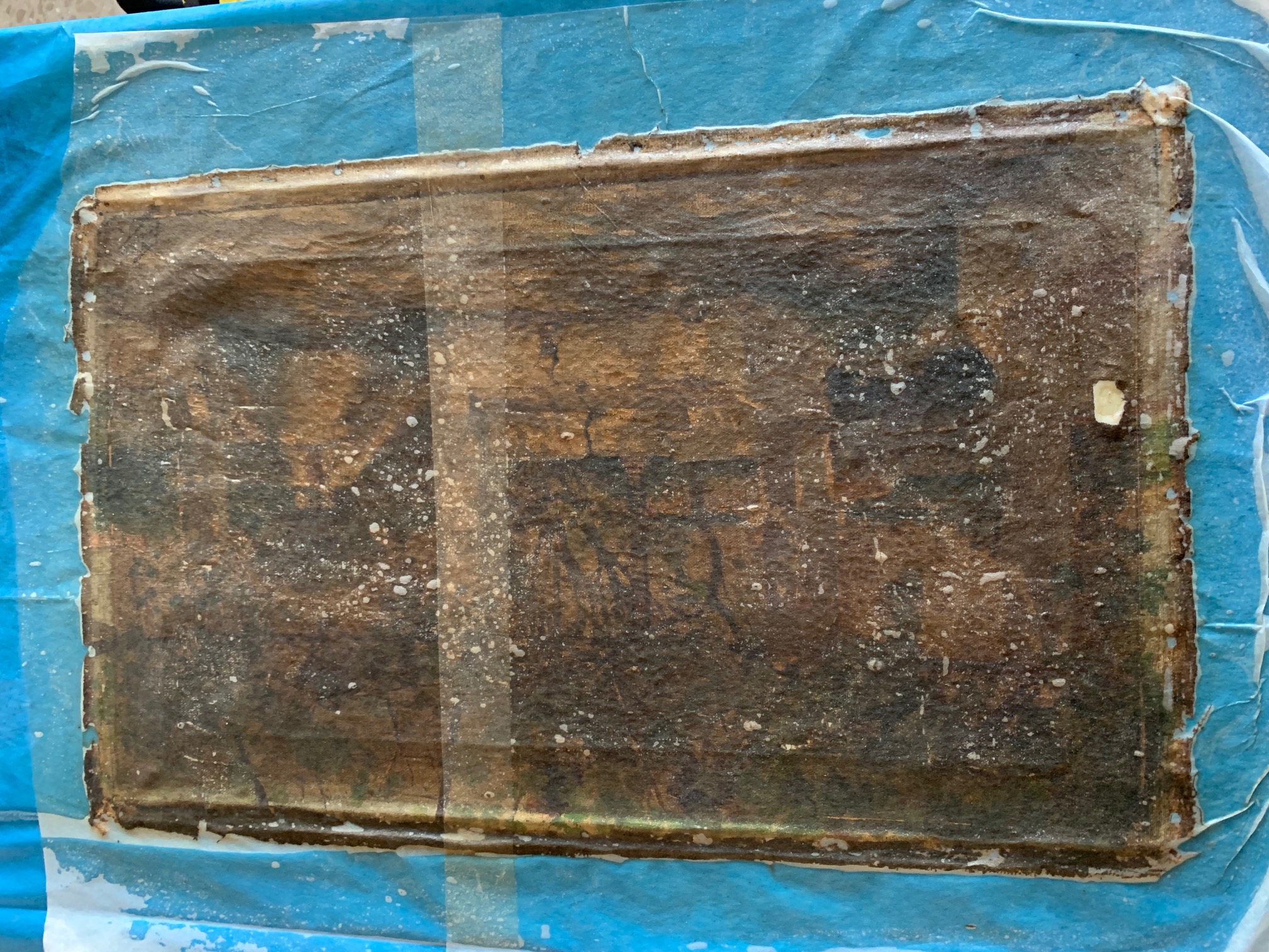 Estado de conservaciónLa pintura nunca fue restaurada en sus 120 años aproximados de vida. Lo más evidente, era el corte que tenÍa, casi de un lado a otro en sentido horizontal. Además, algunos agujeros, del los cuales, uno de mayor tamaño. Muy abundante era la capa de suciedad de viejos barnices y depósito de humos en la superfície pictórica que oscurecía los colores, y ocultaba varios detalles de la pintura. El bastidor estaba en buenas condiciones y sin carcoma, por lo tanto se decidió, simplemente, limpiarlo superficialmente y mantenerlo. Cortes y grietas finas del lienzo - Agujeros del lienzoFases de restauración1º - Protección y consolidación de la superfície pictórica. Protección de la superficie pictórica2º - Desmontar el lienzo del bastidor.2º - Reentelado del lienzo. Montaje del bastidor metalico Tensado del lienzo de lino para el forrado Preparación de cola en el reverso del lienzo Lienzo reentelado Remoción del papel de protección Después de remover el papel3º - Montaje del lienzo al bastidor.4º - Limpieza de la superfície pictórica. Limpieza de la superfície pictórica Limpieza de la superficie pictórica5º - Estucado y lijado de las grietas y agujeros.