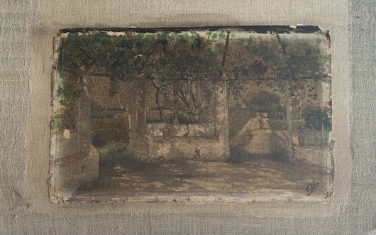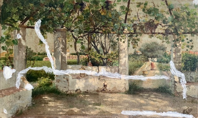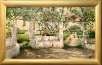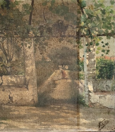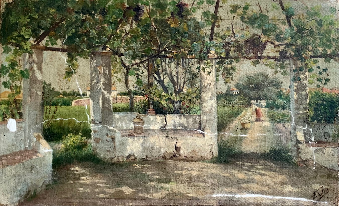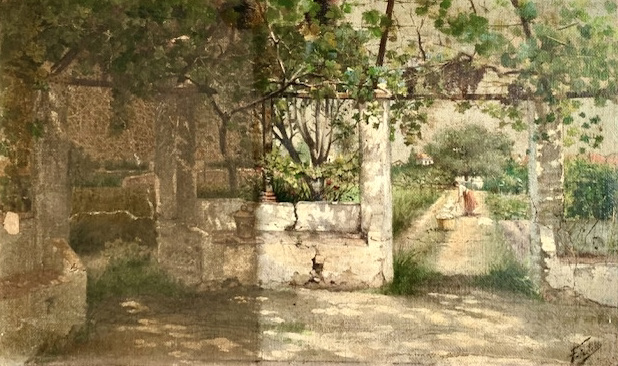 “Pérgola en el jardín”. La pintura no está fechada, pero se puede estimar su ejecución entre los últimos diez años del siglo XIX y los primero diez del siglo XX, (1890-1910).Propiedad: Colección privada valenciana.