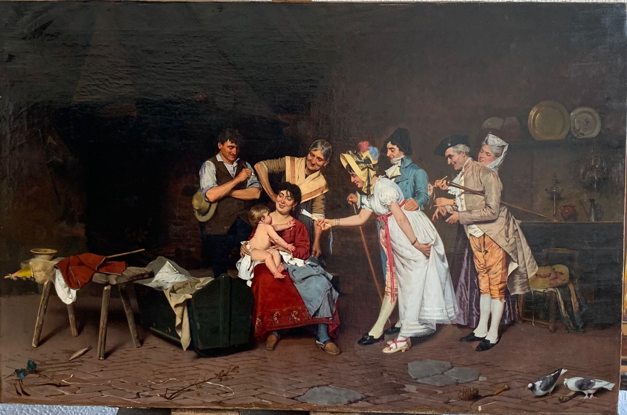 Restauración de una pintura al óleo sobre lienzo del pintor italiano Pietro Torrini (Firenze 1852 - 1920), firmado en la esquina inferior izquierda.Escena popular, “Visita al recién nacido”, en la cual se evidencia la diferencia de clases sociales de finales del siglo XIX, 1880 circa.La restauración de la pintura, ha sido limpiarla del antiguo barniz alterado y amarillento. Algunas pequeñas lagunas de color se han estucado y reintegradas pictóricamente. Finalmente se ha aplicado un nuevo barniz de protección transparente.Catas de limpieza Cata de limpieza